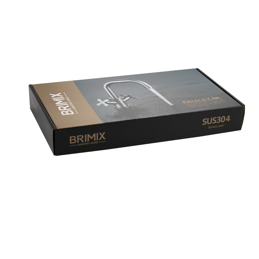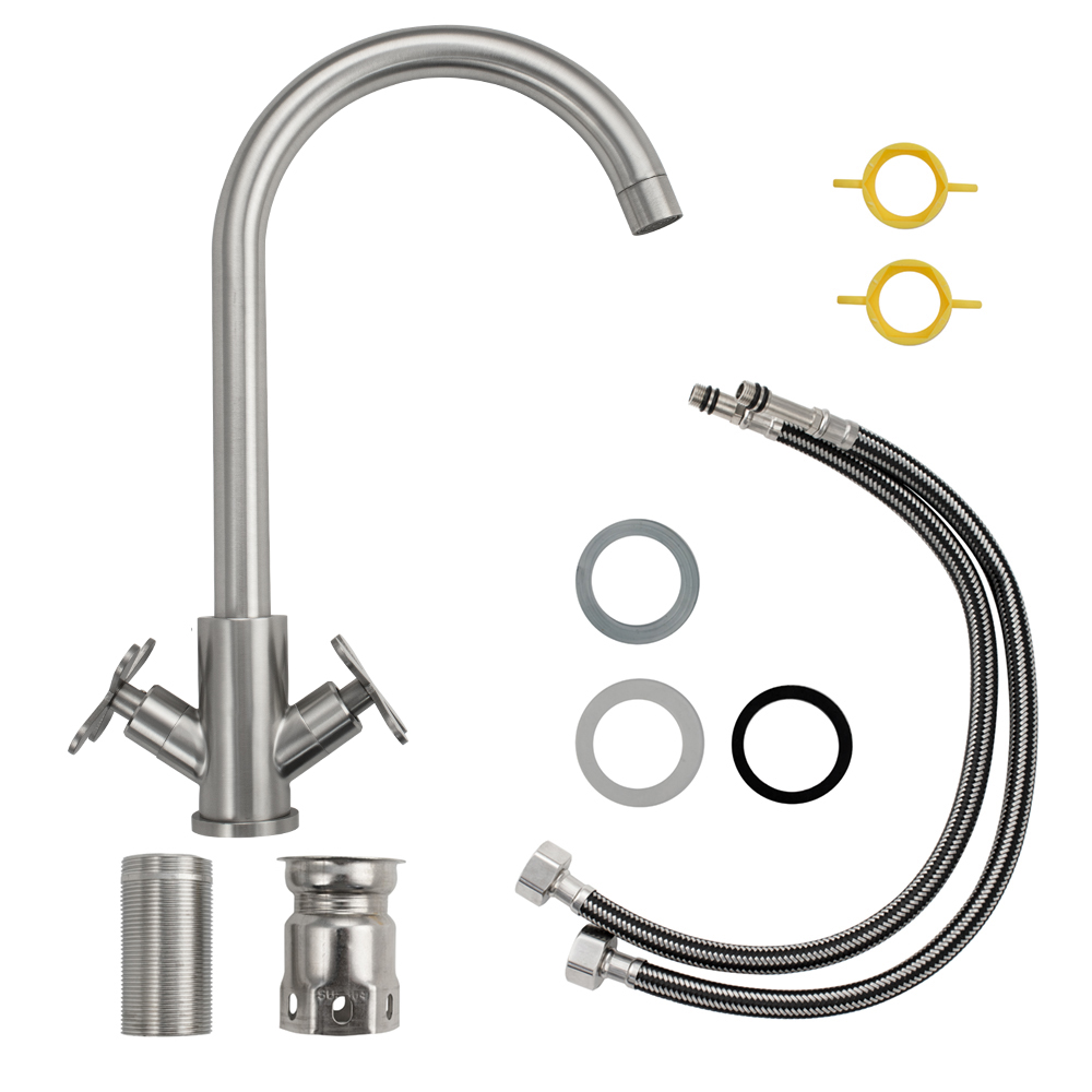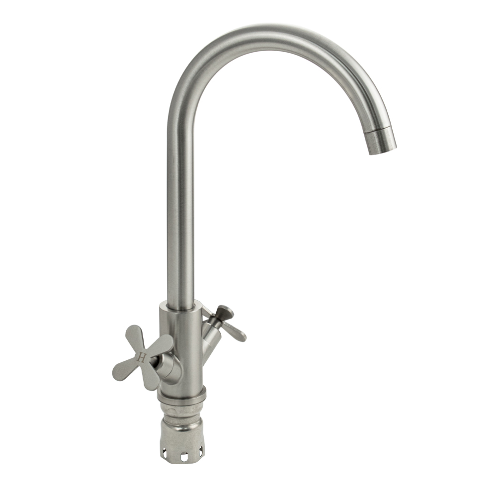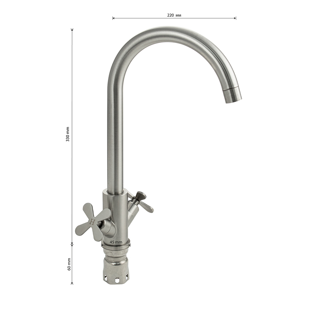 Смеситель для кухонной мойки и раковин, матовый, металлокерамика из нержавеющей стали марки 304, массивный корпус с высоким С-образным изливом, с аэратором для экономии воды. Крепление резьба - гайка. Кранбуксы металлокерамика 1/2, ручки крест, поворот на 90˚. Габаритные размеры: высота 330 мм, длина 220 мм, диаметр посадочного седла 45 мм, длина резьбы 60 мм, длина подводки 450 мм. Вес - 1.500 кг, объём - 0.0055 м3. В комплекте корпус с изливом, паспорт, подводка 1/2, крепёж.