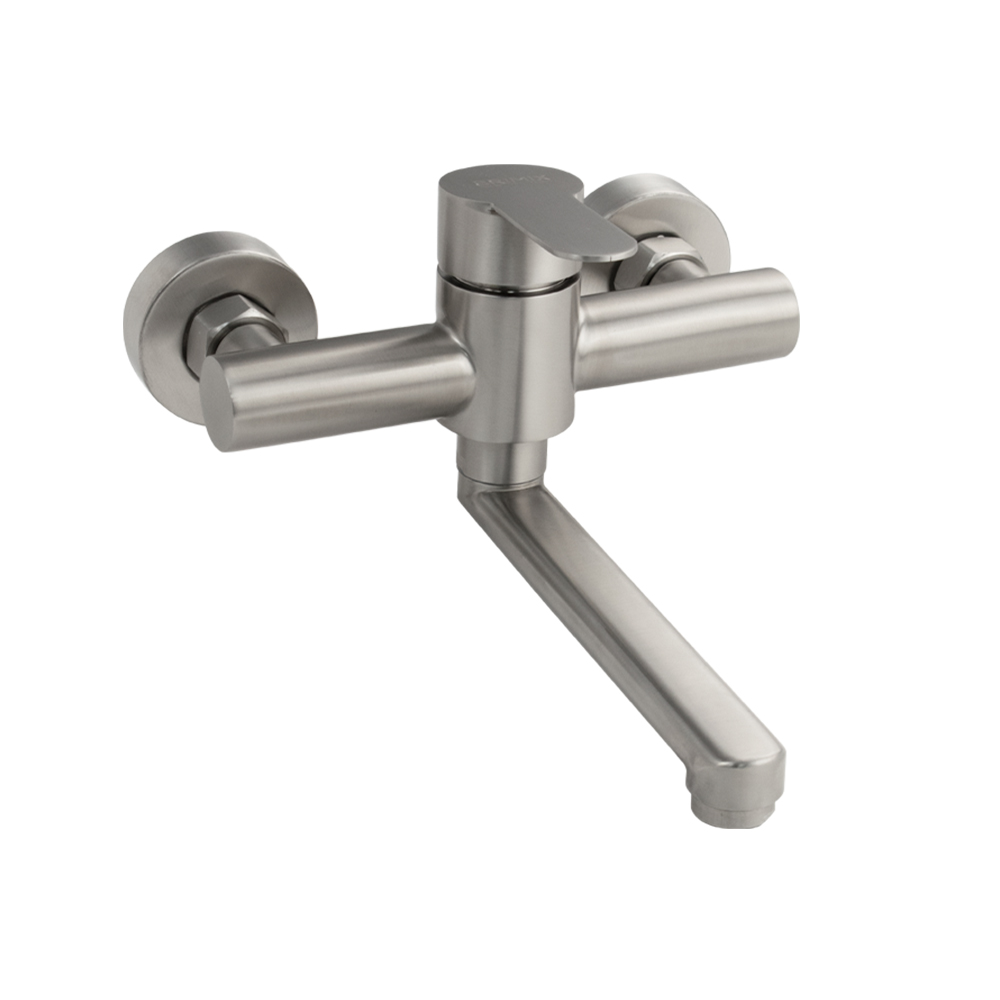 Смеситель для кухонной мойки и раковин, матовый, шаровый, из нержавеющей стали марка 304, массивный корпус с креплением от стены с плоским изливом. Картридж d = 40 мм, ручка литая, аэратор для экономии воды, чашки, гайки и эксцентрики из нержавеющей стали. Габаритные размеры: ширина 150 мм, высота 120 мм, длина излива 190 мм, диаметр чашки 60 мм. Вес - 1,1 кг, объём - 0,0044 м3. В комплекте корпус с изливом, паспорт, крепёж, прокладки.