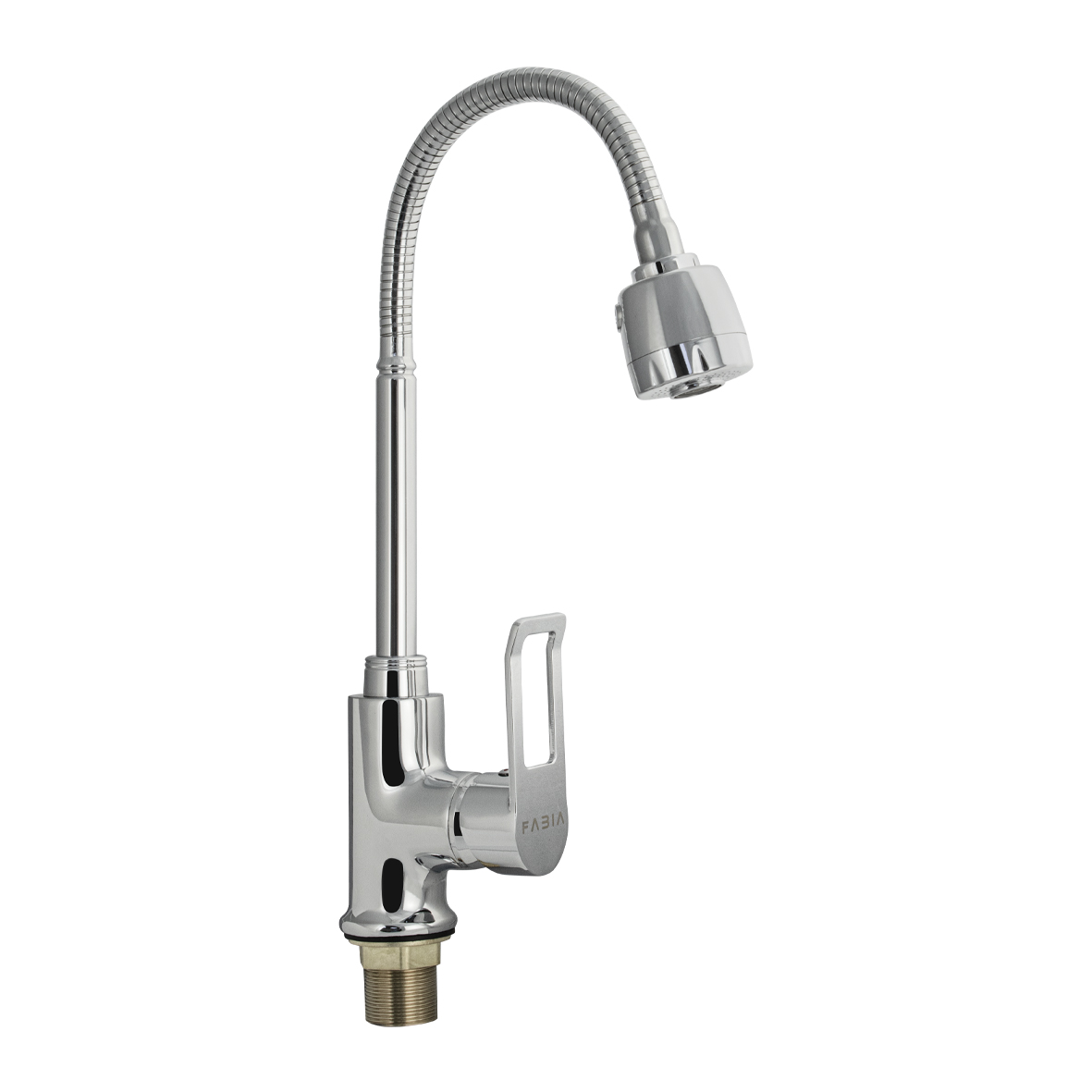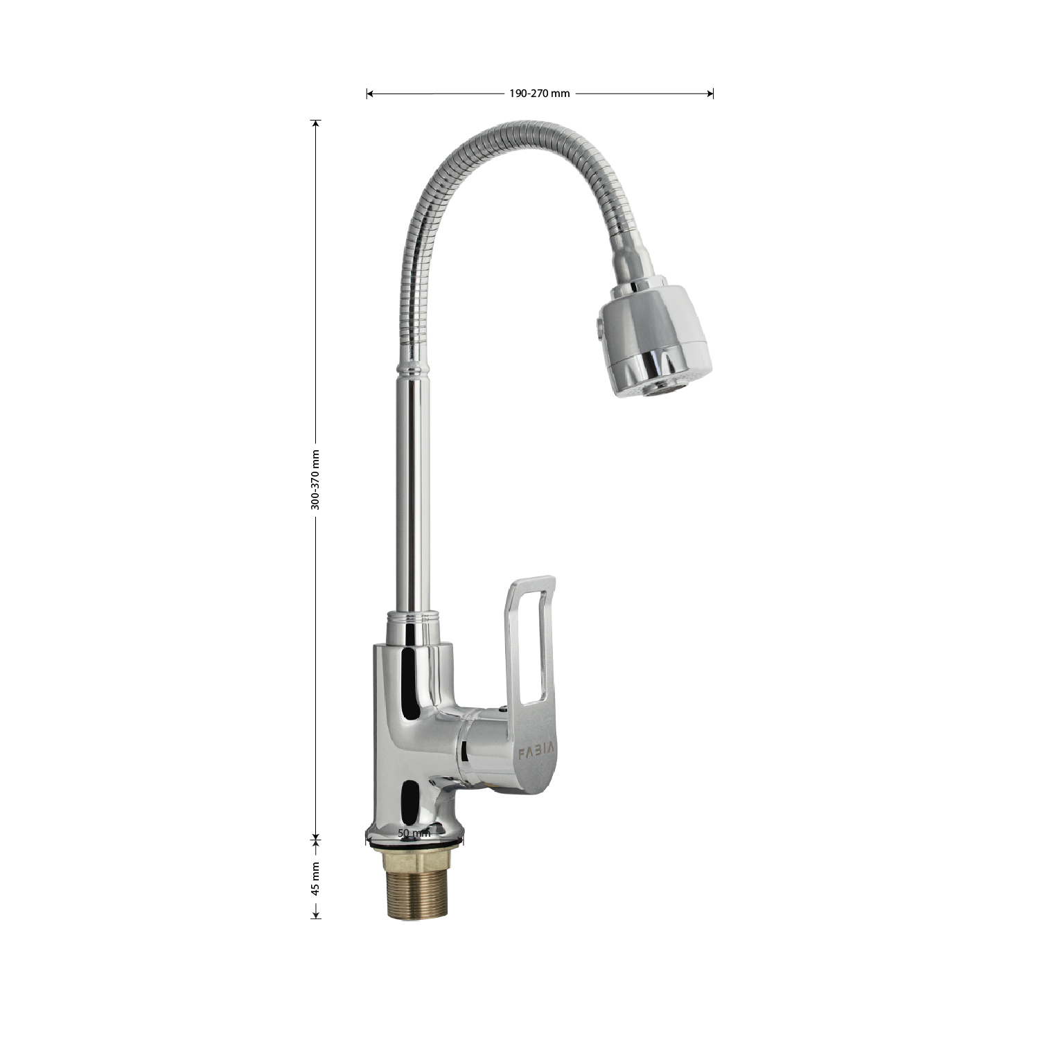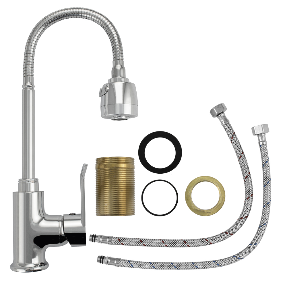 Смеситель для кухонной мойки и раковин, литой корпус хромированного цвета, с высоким гибким изливом, с аэратором для экономии воды, шаровый. Материал изготовления — ЦАМ (цинк-алюминий-медь) + нержавеющая сталь. Крепление резьба - гайка, картридж d = 35 мм, плоская ручка с декоративным вырезом. Такая модель может использоваться на домашней кухне, на даче, в медицинских учреждениях и общественных местах. Габаритные размеры: высота 300 - 370 мм, длина 190 - 270 мм, диаметр посадочного седла 50 мм, длина резьбы 45 мм, длина подводки 400 мм. Вес - 1,200 кг, объём - 0,0034 м3. В комплекте паспорт, корпус с изливом, подводка 1/2, крепеж, набор прокладок.