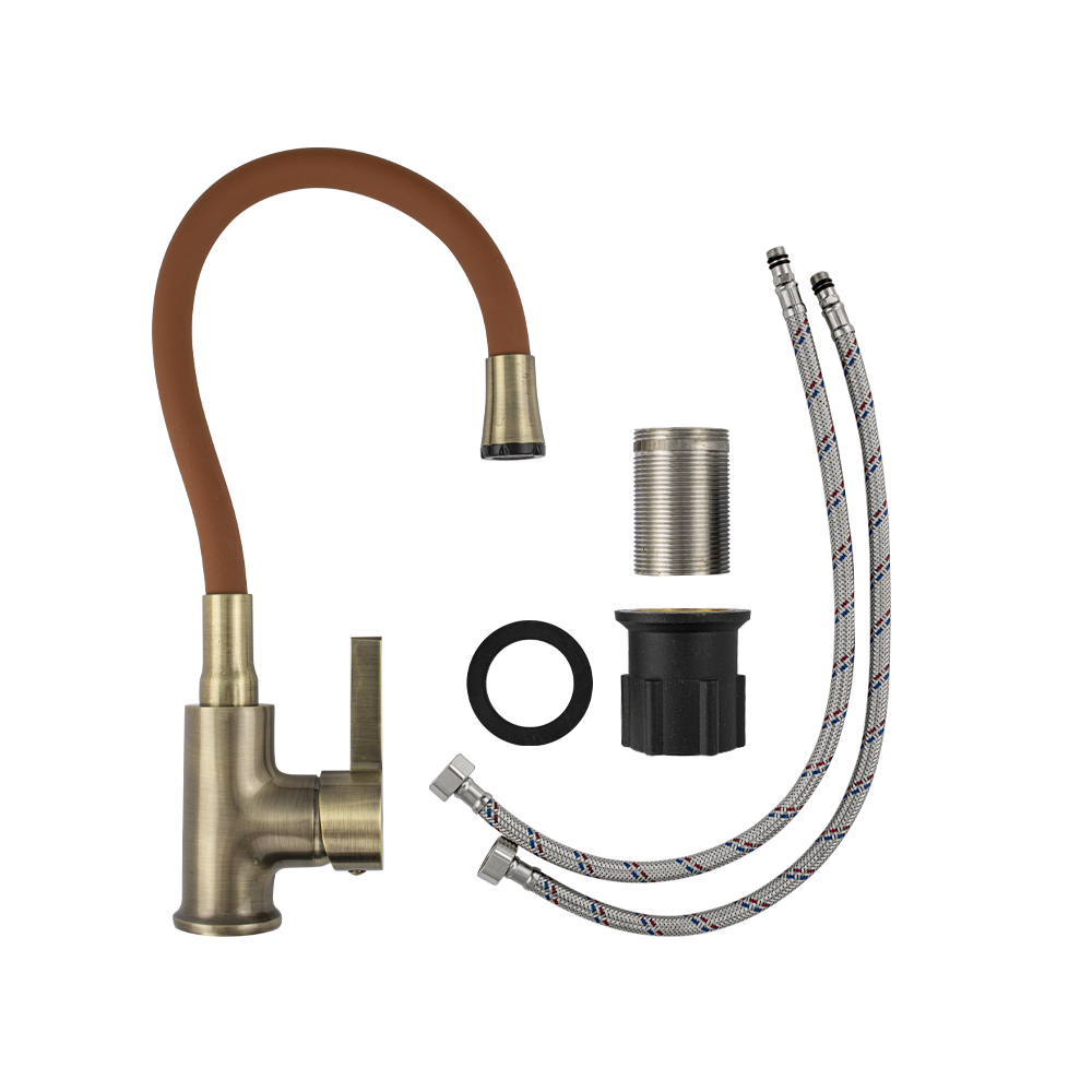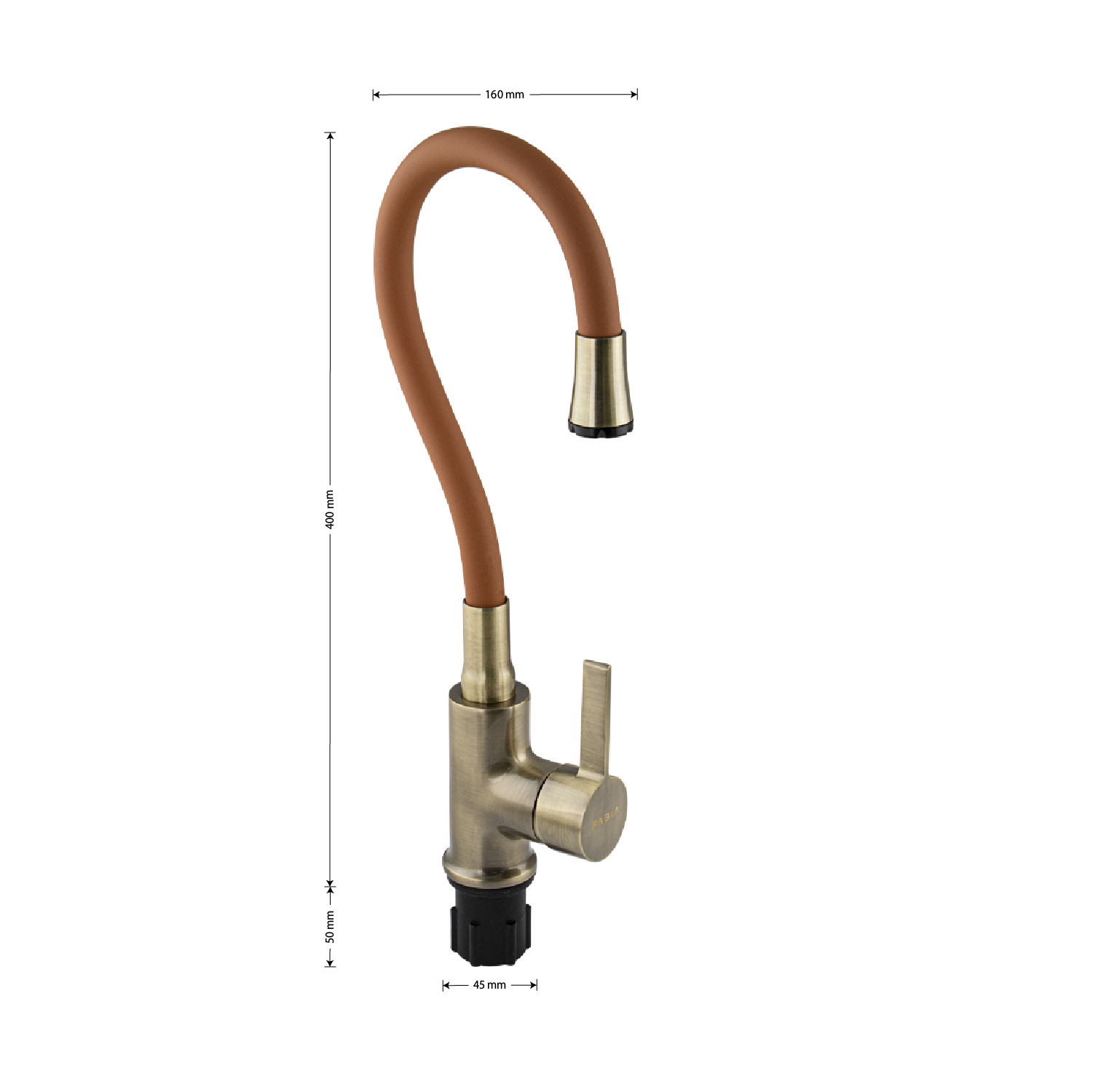 Смеситель для кухонной мойки и раковин, литой корпус бронзового цвета, с высоким гибким изливом коричневого цвета, с аэратором для экономии воды, шаровый. Материал изготовления — ЦАМ (цинк-алюминий-медь) + нержавеющая сталь. Крепление резьба - гайка, картридж d = 35 мм, ручка литая. Такая модель может использоваться на домашней кухне, на даче, в медицинских учреждениях и общественных местах. Габаритные размеры: высота 340-400 мм, длина 50-250 мм, диаметр посадочного седла 45 мм, длина резьбы 50 мм, длина подводки 400 мм. Вес - 1,350 кг, объём - 0,00403 м3. В комплекте паспорт, корпус с изливом, подводка 1/16, крепеж, набор прокладок.