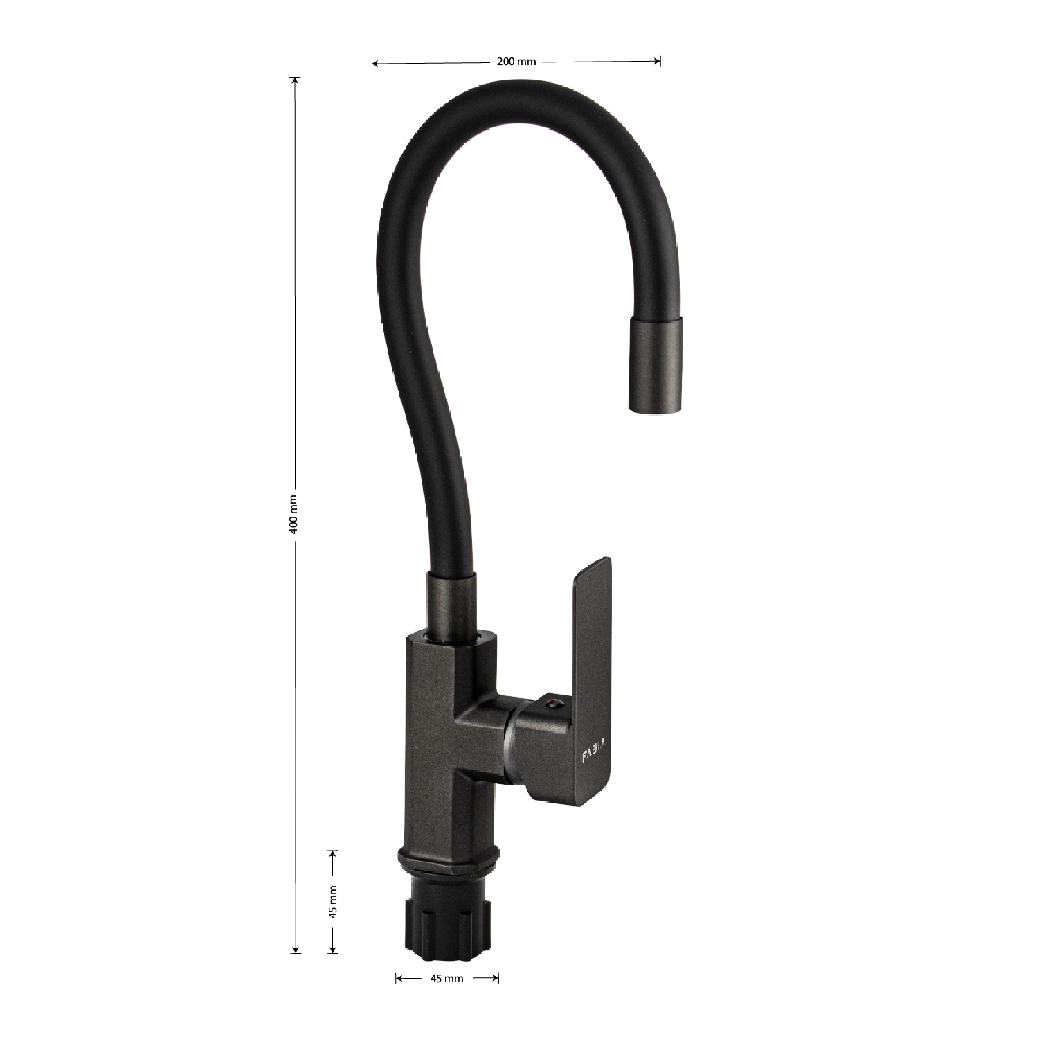 Смеситель для кухонной мойки и раковин, цвет корпуса графит, боковой, шаровый d = мм, массивный корпус с гибким изливом чёрного цвета, с аэратором для экономии воды. Материал изготовления — ЦАМ (цинк-алюминий-медь). Крепление резьба - гайка, литая ручка. Вес - 1.5 кг, объём - 0.00585 м3. В комплекте корпус с изливом, паспорт, подводка 1/2, крепёж. Габаритные размеры коробки: ширина 200 мм, высота 400 мм, высота резьбы 45 мм, диаметр посадочного седла 45 мм.