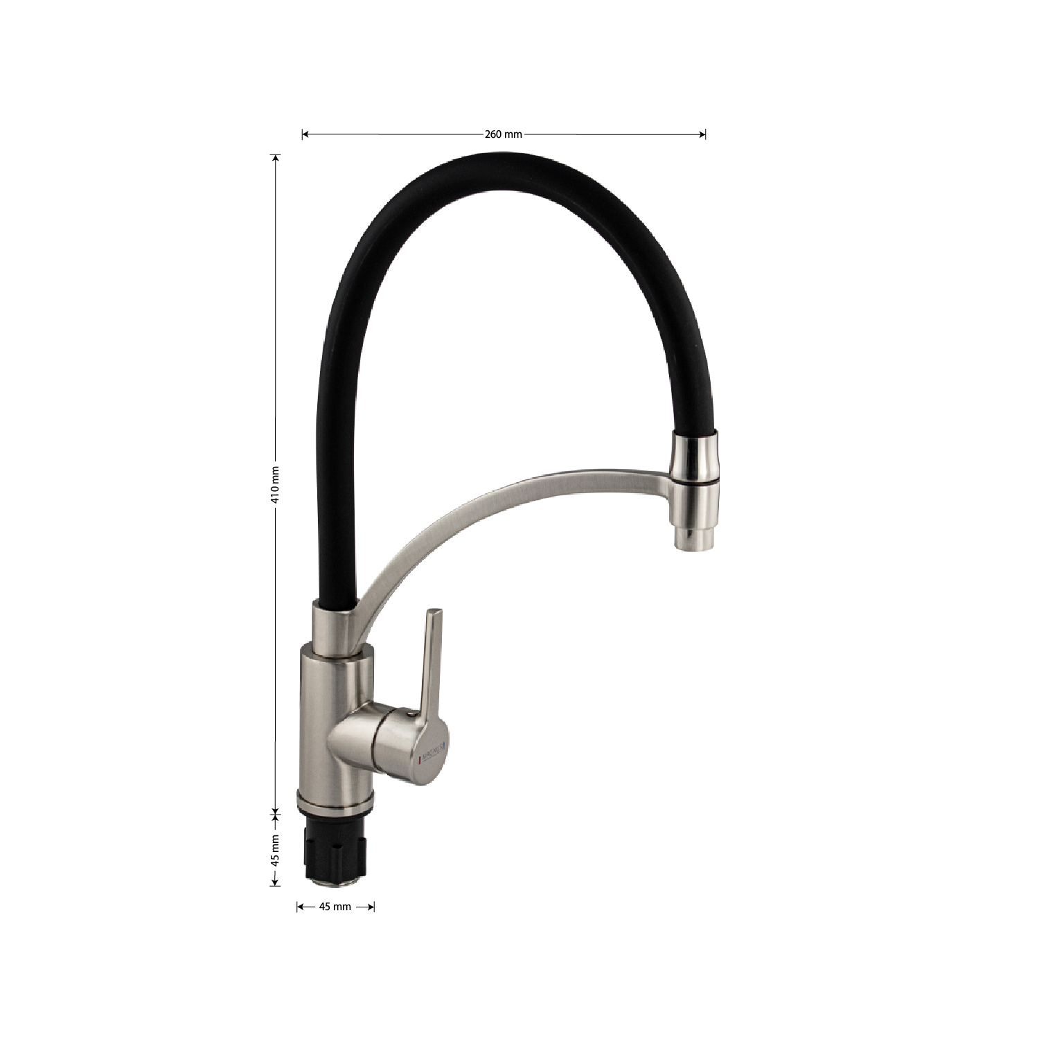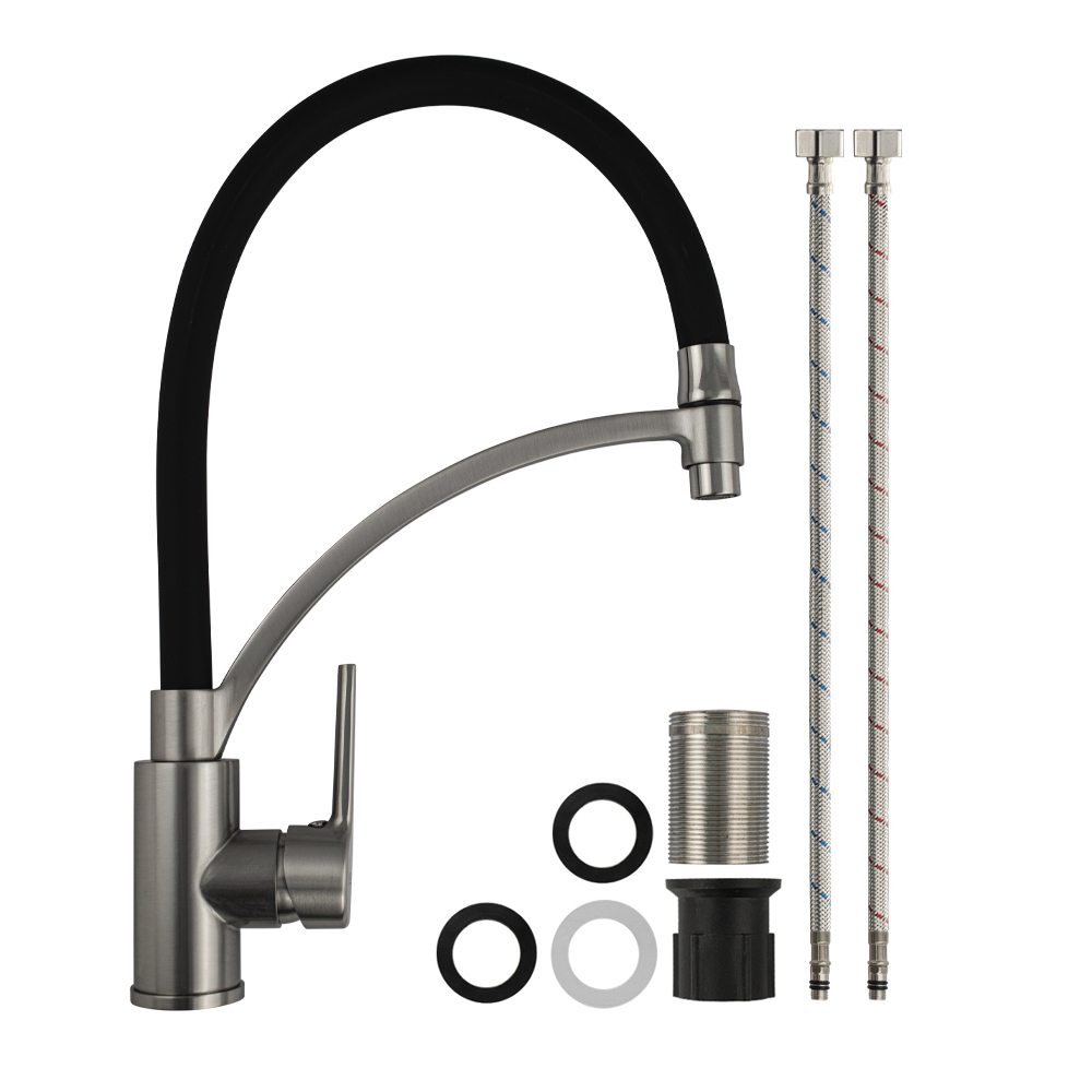 Смеситель для кухонной мойки и раковин, литой матовый корпус, из нержавеющей стали марка 304, с высоким гибким изливом чёрного цвета с фиксацией, с аэратором для экономии воды, шаровый, Крепление резьба - гайка, картридж d = 35 мм, ручка литая. Такая модель может использоваться на домашней кухне, на даче, в медицинских учреждениях и общественных местах. Габаритные размеры: высота 410 мм, длина 260 мм, диаметр посадочного седла 45 мм, длина резьбы 45 мм, длина подводки 450 мм. Вес - 2,2 кг, объём - 0,00761 м3. В комплекте паспорт, корпус с изливом, подводка 1/2, крепеж, набор прокладок