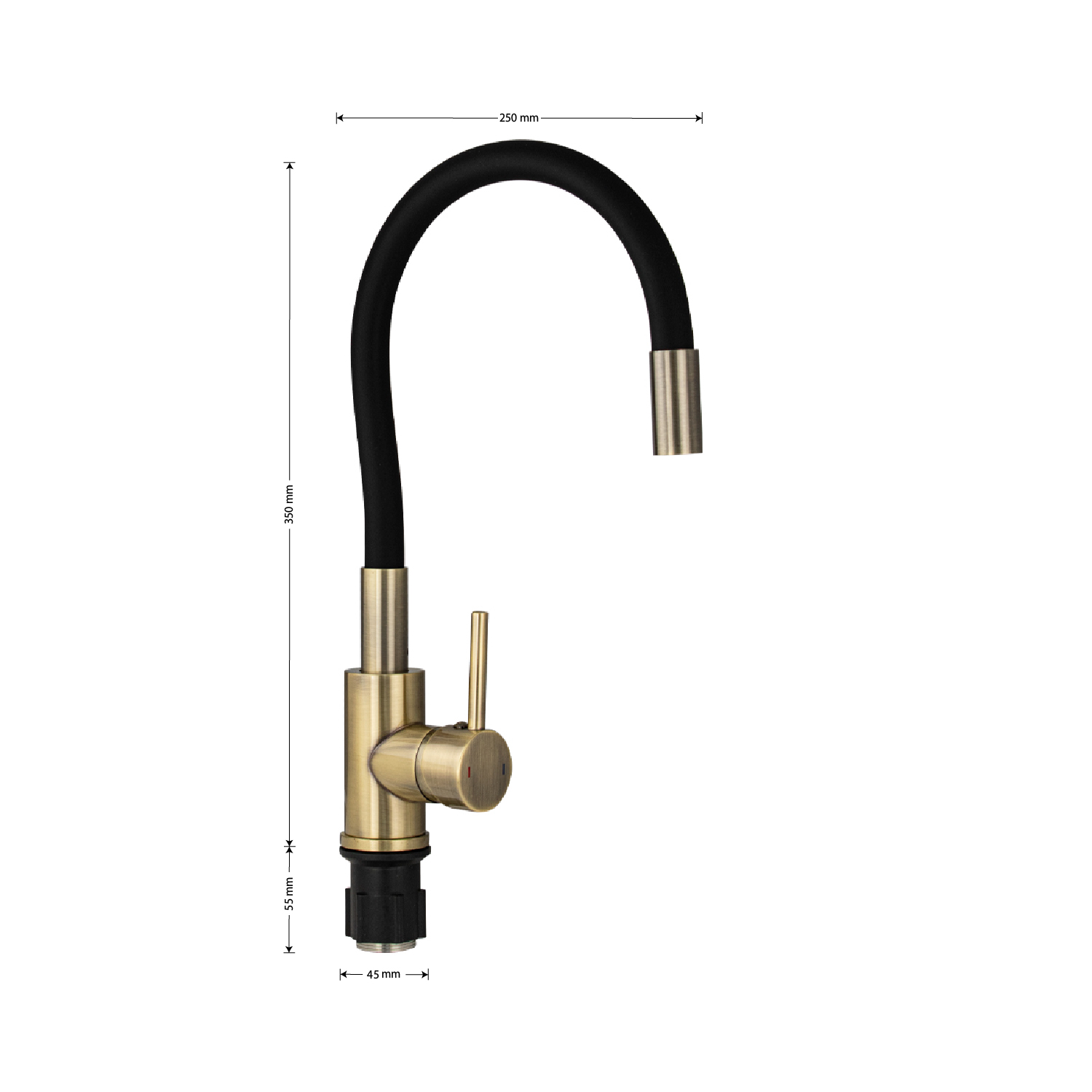 Смеситель для кухонной мойки и раковин, литой корпус, из нержавеющей стали марки 304, с высоким гибким изливом чёрного цвета, с аэратором для экономии воды, шаровый, цвет бронза. Крепление резьба - гайка, картридж d = 35 мм, ручка литая. Такая модель может использоваться на домашней кухне, на даче, в медицинских учреждениях и общественных местах. Габаритные размеры: высота до 350 мм, длина до 250 мм, диаметр посадочного седла 45 мм, длина резьбы 55 мм, длина подводки 450 мм. Вес - 1,8 кг, объём - 0,0042 м3. В комплекте паспорт, корпус с изливом, подводка 1/2, крепеж, набор прокладок.