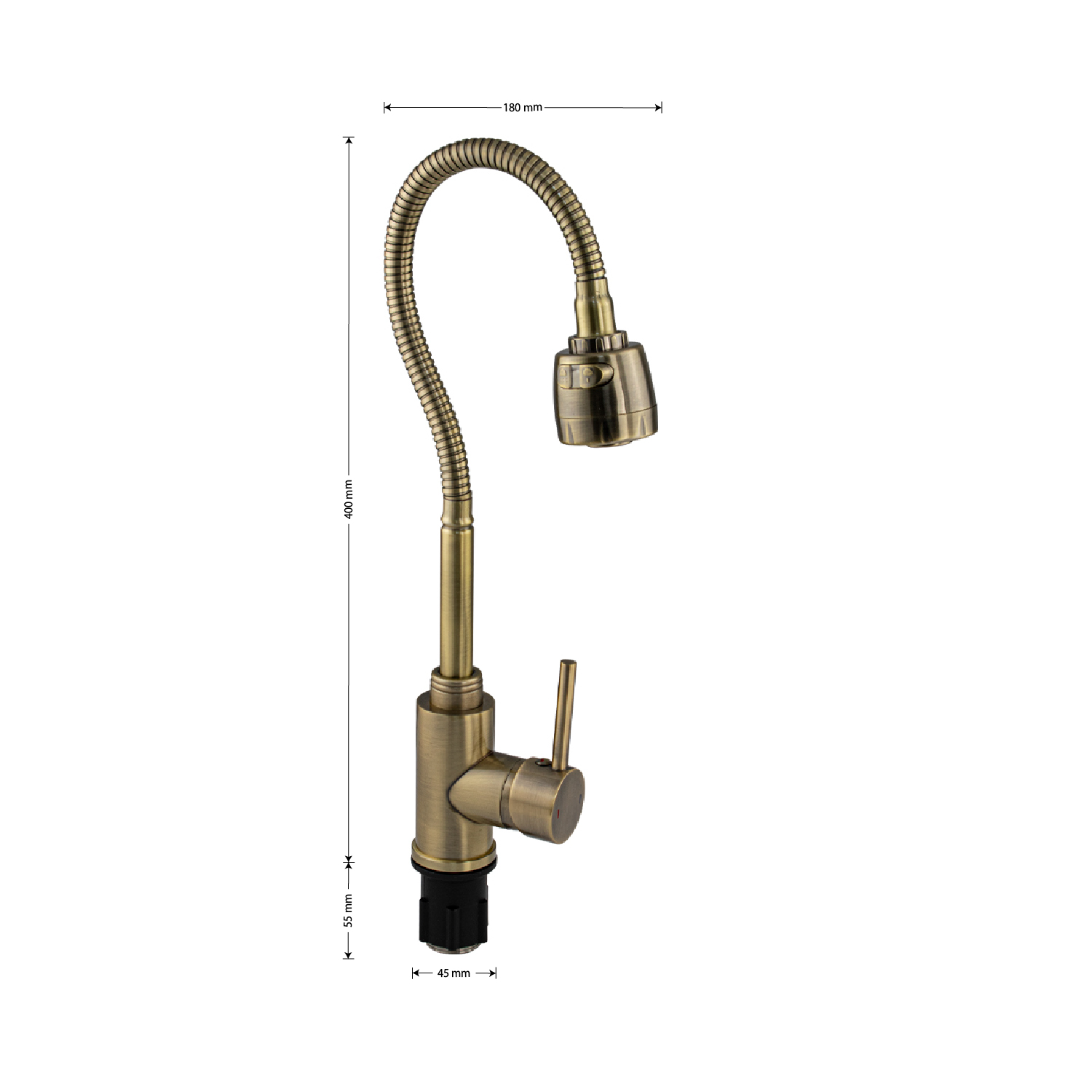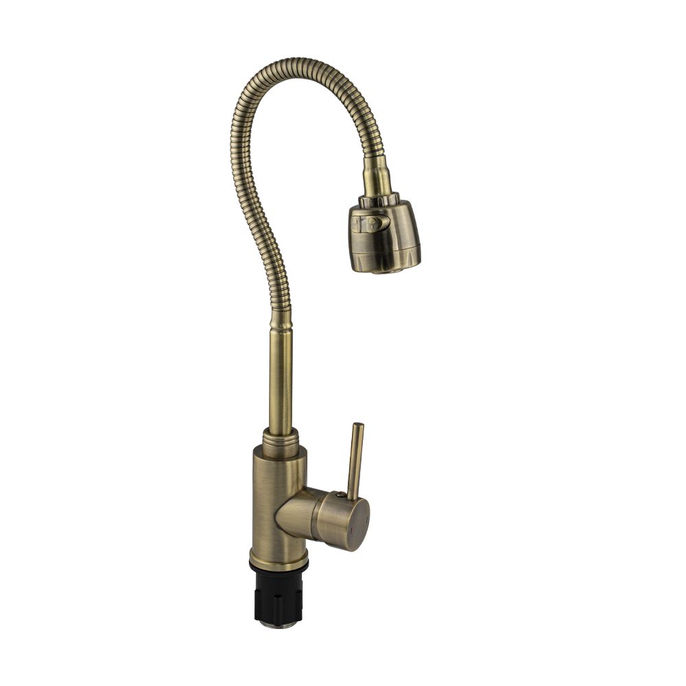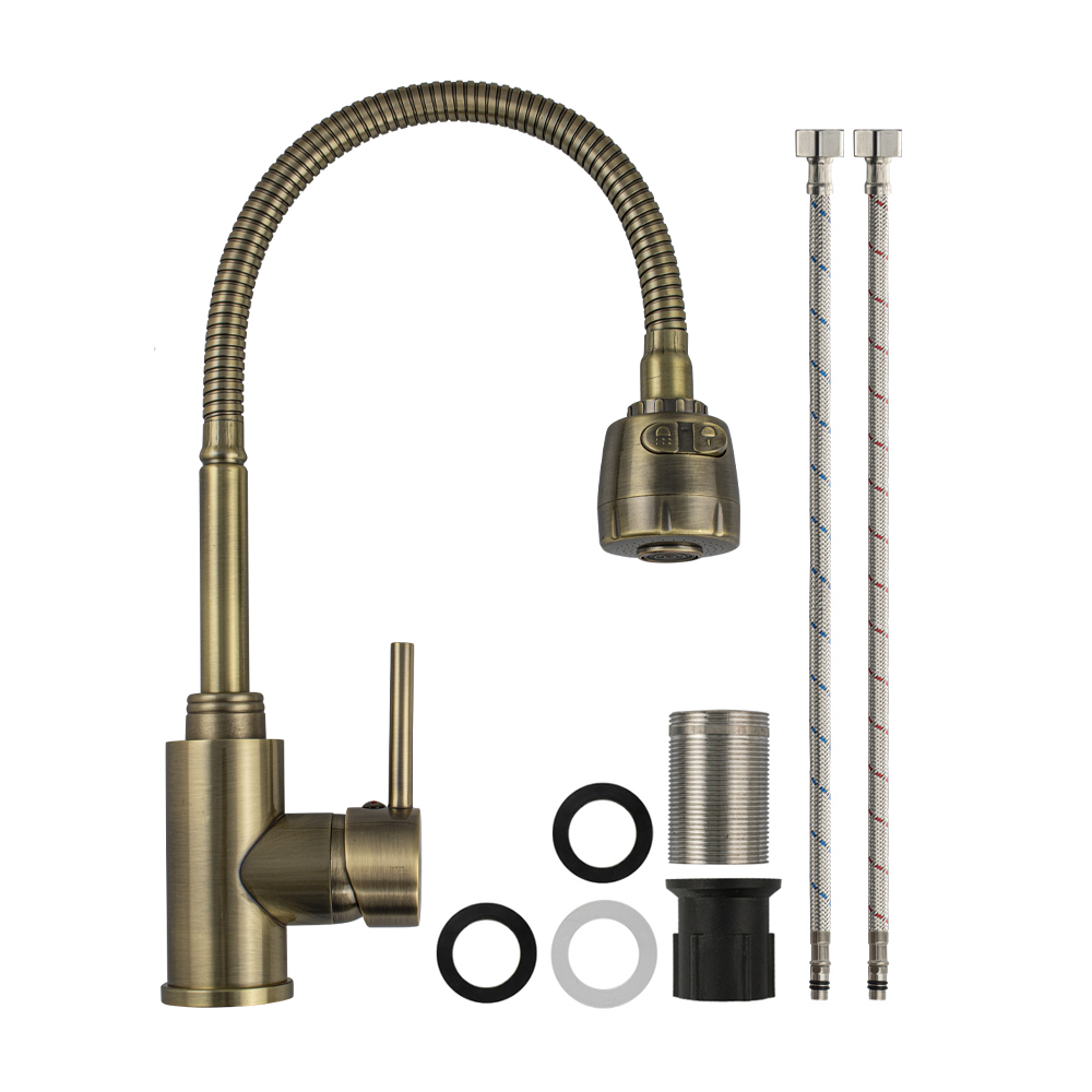 Смеситель для кухонной мойки и раковин, литой корпус, из нержавеющей стали марки 304, с высоким гибким изливом, с большим двухрежимным аэратором для экономии воды, шаровый, цвет бронза. Крепление резьба - гайка, картридж d = 35 мм, ручка литая. Такая модель может использоваться на домашней кухне, на даче, в медицинских учреждениях и общественных местах. Габаритные размеры: высота - 400 мм, длина - 180 мм, диаметр посадочного седла 45 мм, длина резьбы 55 мм, длина подводки 450 мм. Вес - 1,6 кг, объём - 0,0042 м3. В комплекте паспорт, корпус с изливом, подводка 1/2, крепеж, набор прокладок.