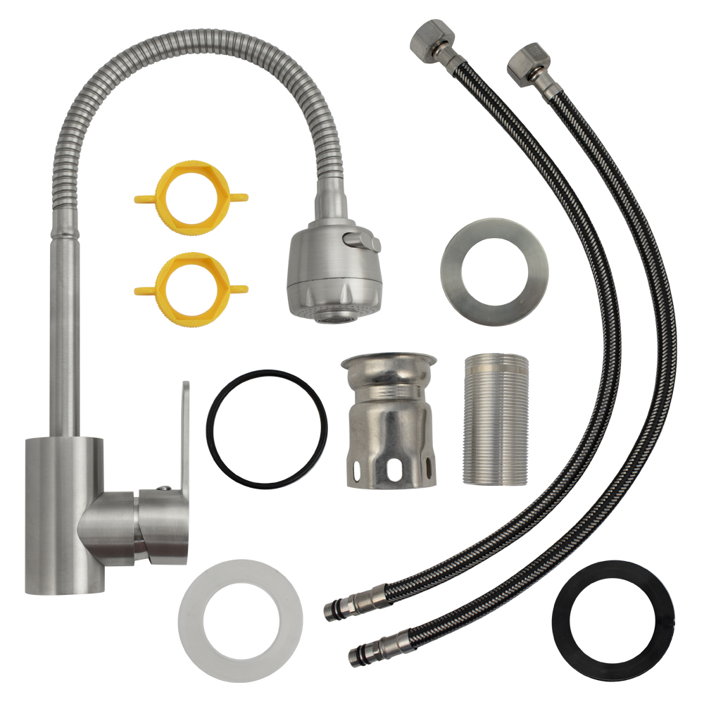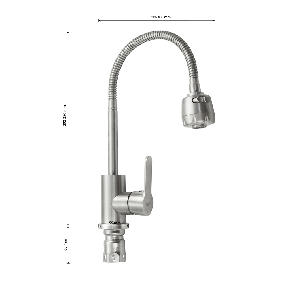 Смеситель для кухонной мойки и раковин, литой матовый корпус, из нержавеющей стали марки 304, с высоким гибким изливом, с большим двухрежимным аэратором для экономии воды, шаровый. Крепление резьба - гайка, картридж d = 35 мм, ручка литая. Такая модель может использоваться на домашней кухне, на даче, в медицинских учреждениях и общественных местах. Габаритные размеры: высота 290 - 380 мм, длина 200 - 300 мм, диаметр посадочного седла 55 мм, длина резьбы 60 мм, длина подводки 450 мм. Вес - 1,700 кг, объём - 0,00635 м3. В комплекте паспорт, корпус с изливом, подводка 1/2, крепеж, набор прокладок.