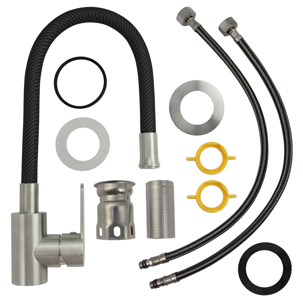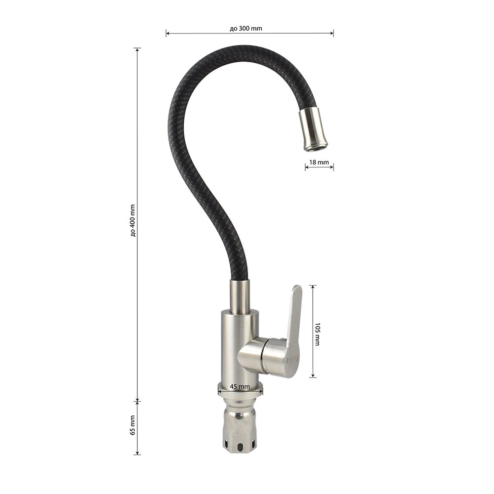 Смеситель для кухонной мойки и раковин, литой матовый корпус, из нержавеющей стали марки 304, с высоким гибким изливом тёмно-серого цвета, полосатый, с аэратором для экономии воды, шаровый. Крепление резьба - гайка, картридж d = 35 мм, ручка литая. Такая модель может использоваться на домашней кухне, на даче, в медицинских учреждениях и общественных местах. Габаритные размеры: высота до 400 мм, длина до 300 мм, диаметр посадочного седла 45 мм, длина резьбы 65 мм, длина подводки 400 мм. Вес - 2,000 кг, объём - 0,00421 м3. В комплекте паспорт, корпус с изливом, подводка 1/2, крепеж, набор прокладок.