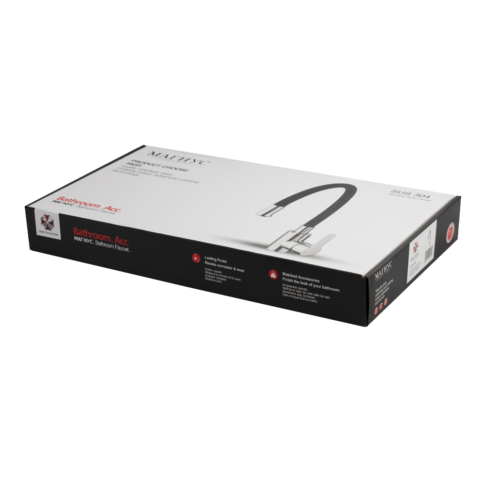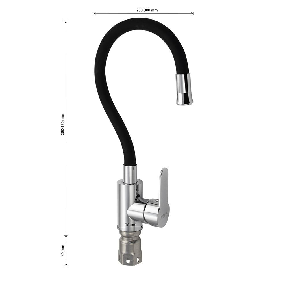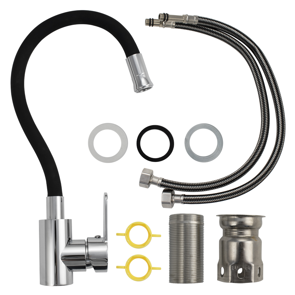 Смеситель для кухонной мойки и раковин, литой хромированный корпус, из нержавеющей стали марки 304, с высоким гибким изливом чёрного цвета, с аэратором для экономии воды, шаровый. Крепление резьба - гайка, картридж d = 35 мм, ручка литая. Такая модель может использоваться на домашней кухне, на даче, в медицинских учреждениях и общественных местах. Габаритные размеры: высота 280 - 380 мм, длина 200 - 310 мм, диаметр посадочного седла 43 мм, длина резьбы 60 мм, длина подводки 400 мм. Вес - 1,862 кг, объём - 0,00647 м3. В комплекте паспорт, корпус с изливом, подводка 1/2, крепеж, набор прокладок.