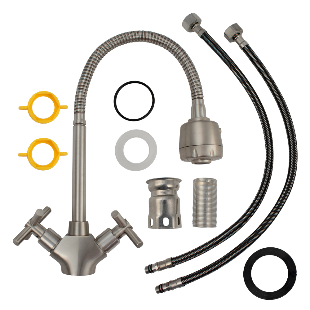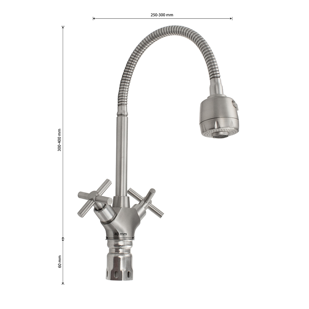 Смеситель для кухонной мойки и раковин, матовый, металлокерамика, из нержавеющей стали марки 304, массивный корпус с гибким изливом, с большим двухрежимным аэратором для экономии воды. Крепление резьба - гайка. Кранбуксы металлокерамика 1/2, ручки крест, поворот на 90˚. Габаритные размеры: высота 300 - 400 мм, длина 250 - 300 мм, диаметр посадочного седла 40 мм, длина резьбы 60 мм, длина подводки 500 мм. Вес - 1,400 кг, объём - 0,00635 м3. В комплекте корпус с изливом, паспорт, подводка 1/2, крепёж.