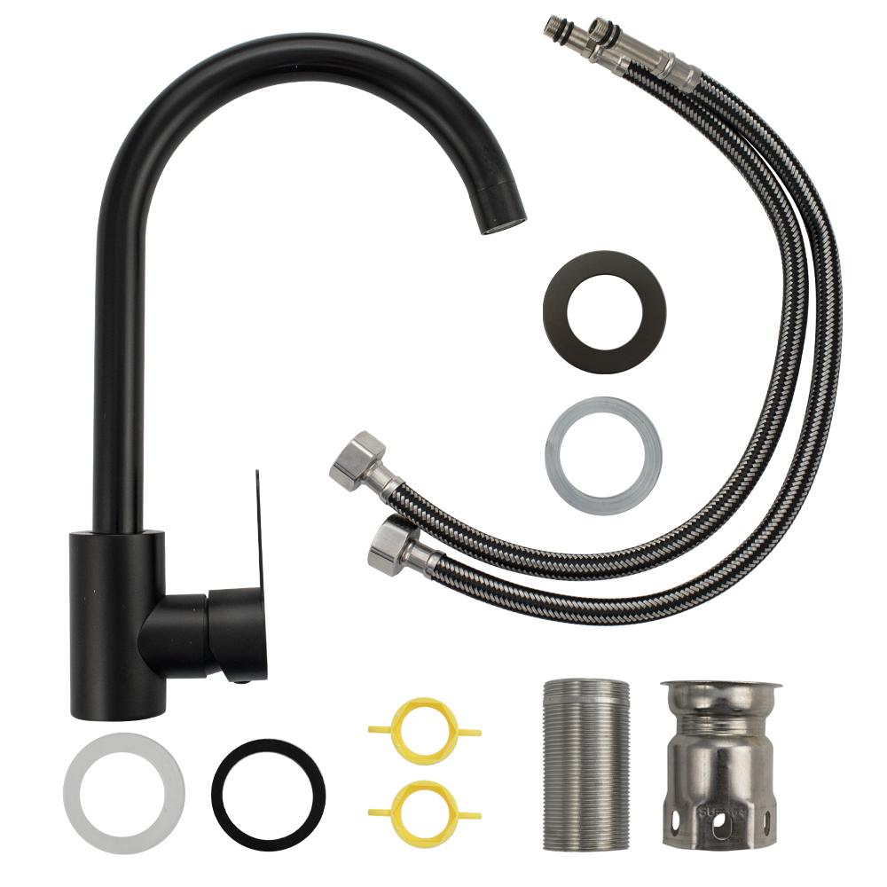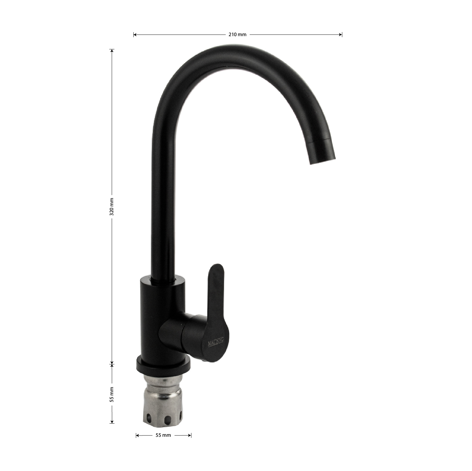 Смеситель для кухонной мойки и раковин, литой матовый корпус чёрного цвета, из нержавеющей стали марка 304, с высоким С-образным изливом, шаровый. Крепление резьба - гайка, картридж d = 35 мм, ручка литая. Аэратор для экономии воды. Такая модель может использоваться на домашней кухне, на даче, в медицинских учреждениях и общественных местах. Габаритные размеры: высота 320 мм, длина 210 мм, диаметр посадочного седла 55 мм, длина резьбы 55 мм, длина подводки 450 мм. Вес - 1,300 кг, объём - 0,00490 м3. В комплекте паспорт, корпус с изливом, подводка 1/2, крепеж, набор прокладок