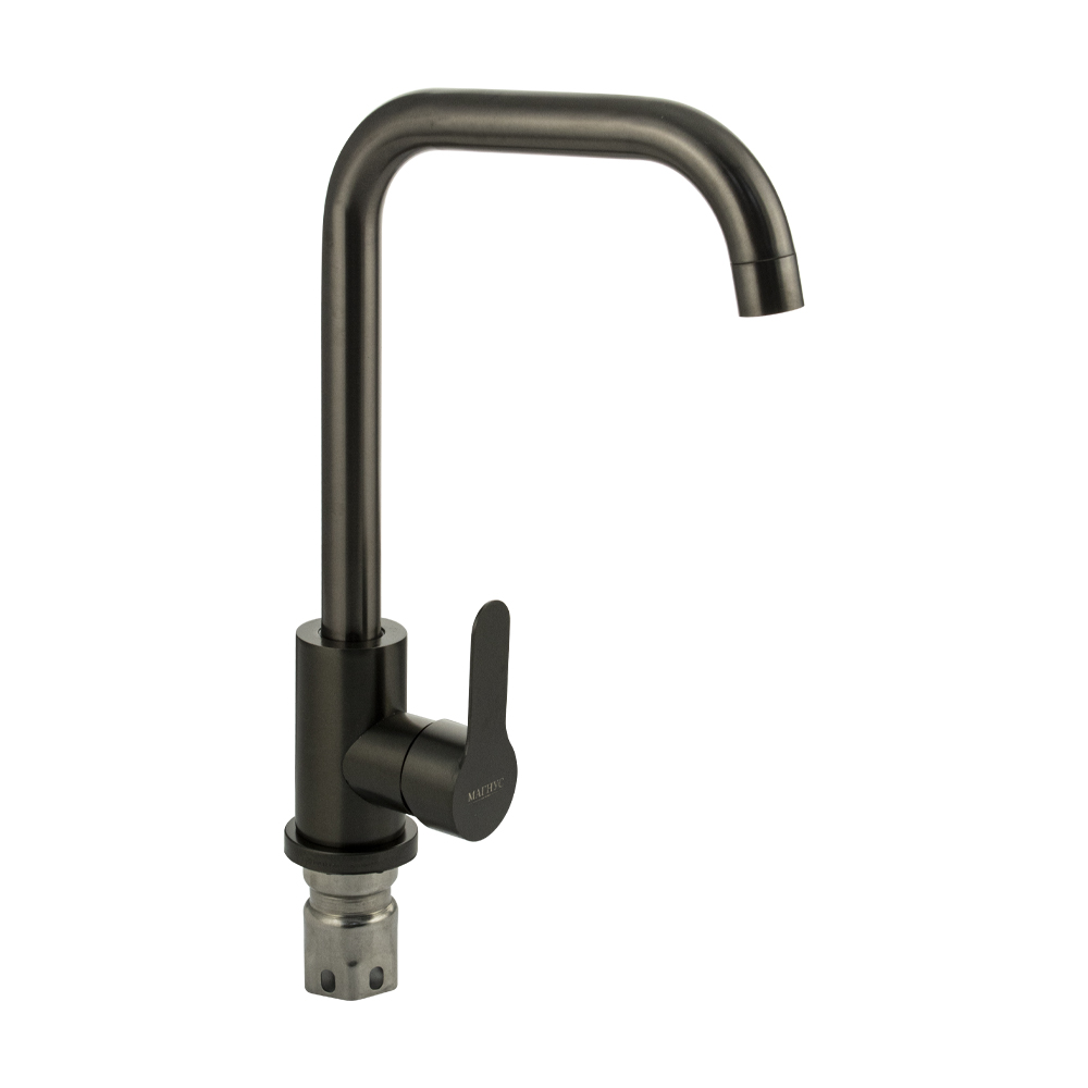 Смеситель для кухонной мойки и раковин, литой матовый корпус графитового цвета, из нержавеющей стали марки 304, с высоким П-образным изливом, шаровый. Крепление резьба - гайка, картридж d = 35 мм, ручка литая. Аэратор для экономии воды. Такая модель может использоваться на домашней кухне, на даче, в медицинских учреждениях и общественных местах. Габаритные размеры: высота 320 мм, длина 230 мм, диаметр посадочного седла 55 мм, длина резьбы 55 мм, длина подводки 450 мм. Вес - 1,4 кг, объём - 0,00490 м3. В комплекте паспорт, корпус с изливом, подводка 1/2, крепеж, набор прокладок