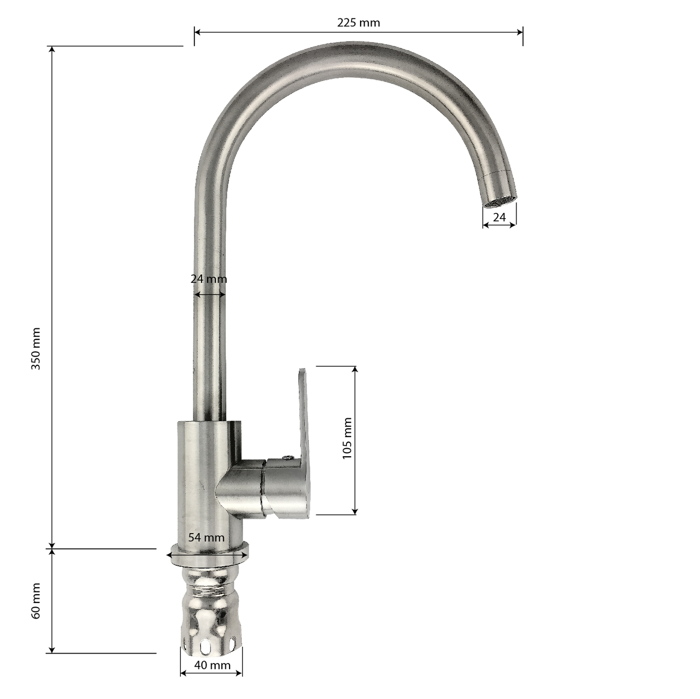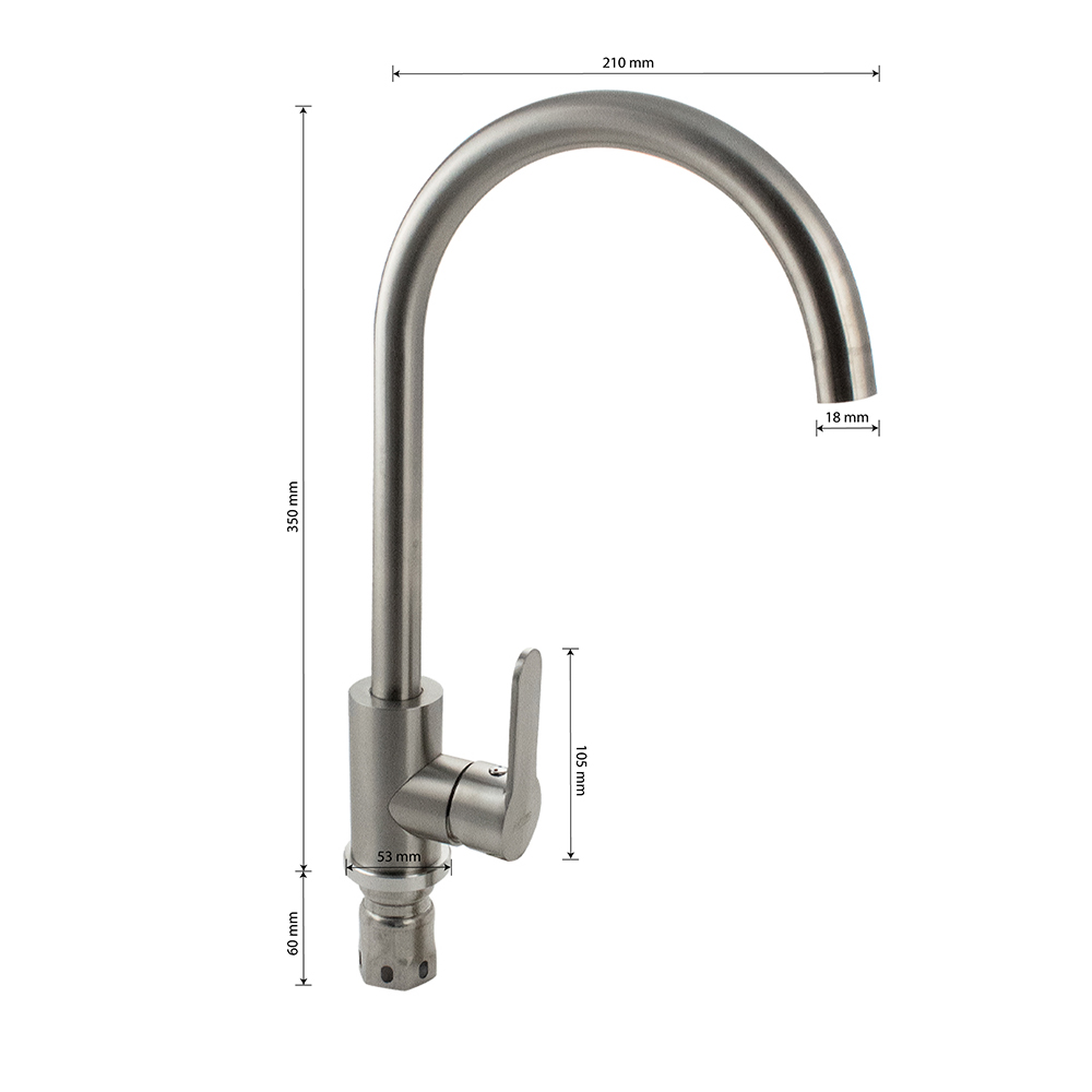 Смеситель для кухонной мойки и раковин, литой матовый корпус, из нержавеющей стали марки 304, с высоким С-образным изливом, шаровый. Крепление резьба - гайка, картридж d = 35 мм, ручка литая. Аэратор для экономии воды. Такая модель может использоваться на домашней кухне, на даче, в медицинских учреждениях и общественных местах. Габаритные размеры: высота 350 мм, длина 210 мм, диаметр посадочного седла 53 мм, длина резьбы 60 мм, длина подводки 500 мм. Вес - 1,500 кг, объём - 0,00635 м3. В комплекте паспорт, корпус с изливом, подводка 1/2, крепеж, набор прокладок.