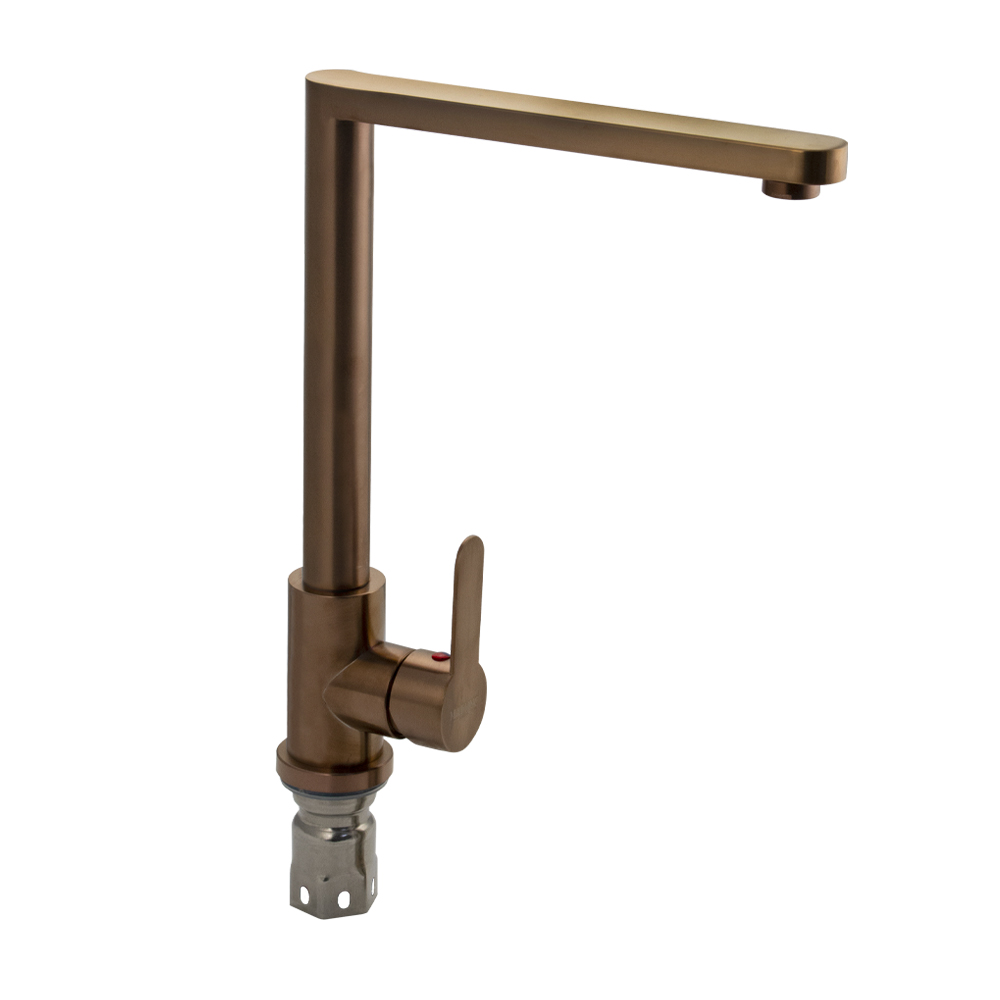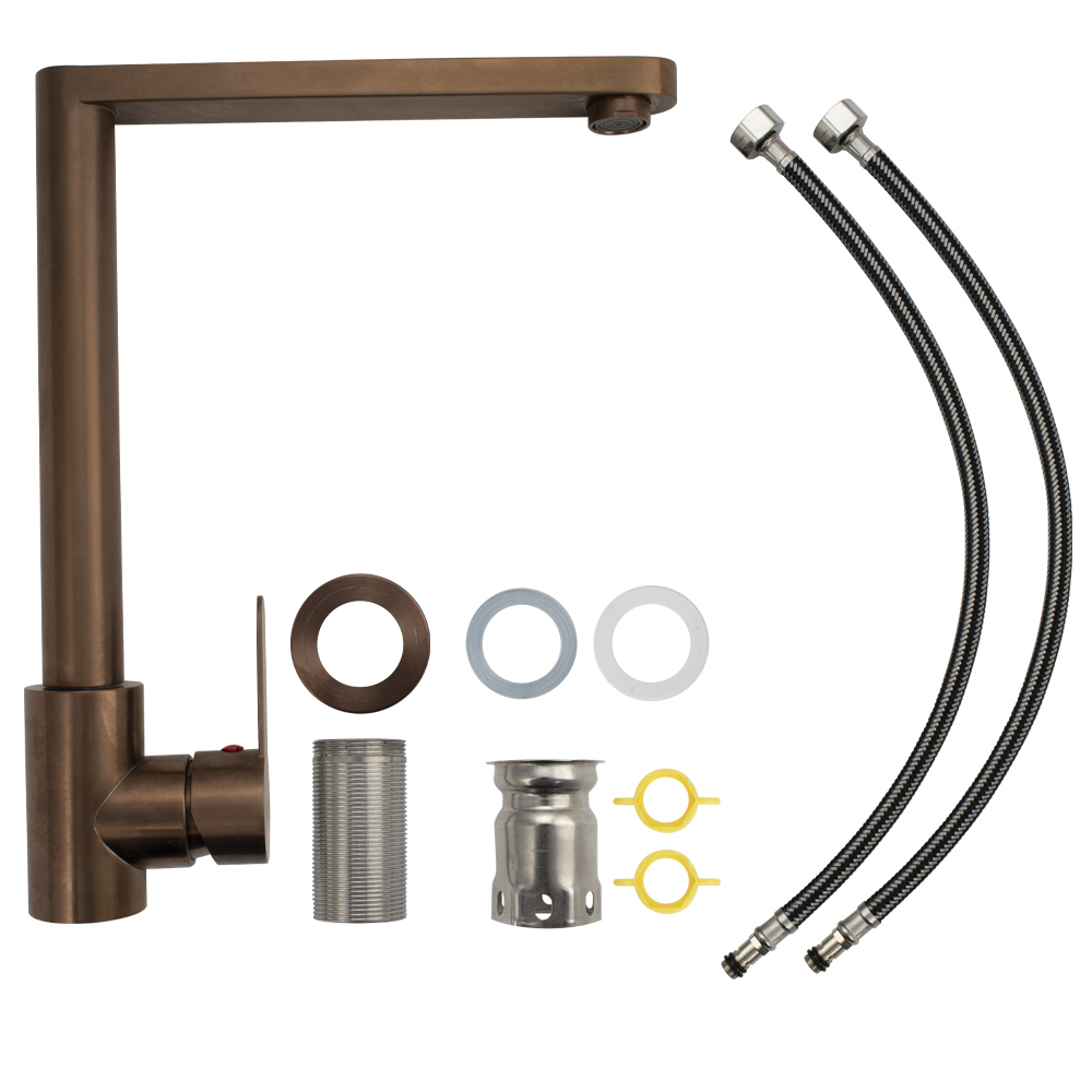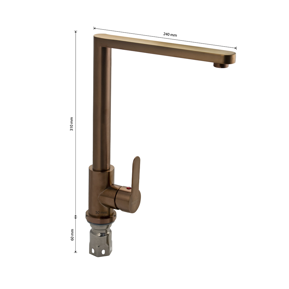 Смеситель для кухонной мойки и раковин, цвет под МЕДЬ, литой корпус, из нержавеющей стали марки 304, с высоким литым Г-образным изливом, шаровый. Крепление резьба - гайка, картридж d = 35 мм, ручка литая. Аэратор для экономии воды. Такая модель может использоваться на домашней кухне, на даче, в медицинских учреждениях и общественных местах. Габаритные размеры: высота 310 мм, длина 240 мм, диаметр посадочного седла 50 мм, длина резьбы 60 мм, длина подводки 450 мм. Вес - 1,700 кг, объём - 0,00647 м3. В комплекте паспорт, корпус с изливом, подводка 1/2, крепеж, набор прокладок.