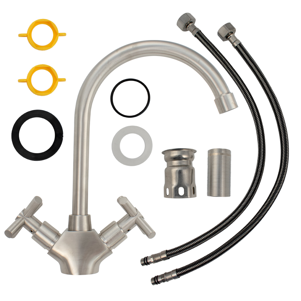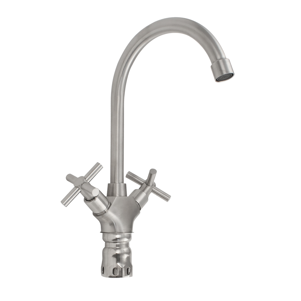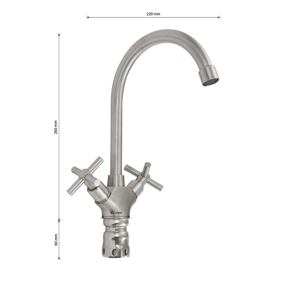 Смеситель для кухонной мойки и раковин, матовый, металлокерамика из нержавеющей стали марки 304, массивный корпус с высоким С-образным изливом, с аэратором для экономии воды. Крепление резьба - гайка. Кранбуксы металлокерамика 1/2, ручки крест, поворот на 90˚. Габаритные размеры: высота 260 мм, длина 220 мм, диаметр посадочного седла 40 мм, длина резьбы 60 мм, длина подводки 500 мм. Вес - 1,600 кг, объём - 0,00635 м3. В комплекте корпус с изливом, паспорт, подводка 1/2, крепёж.