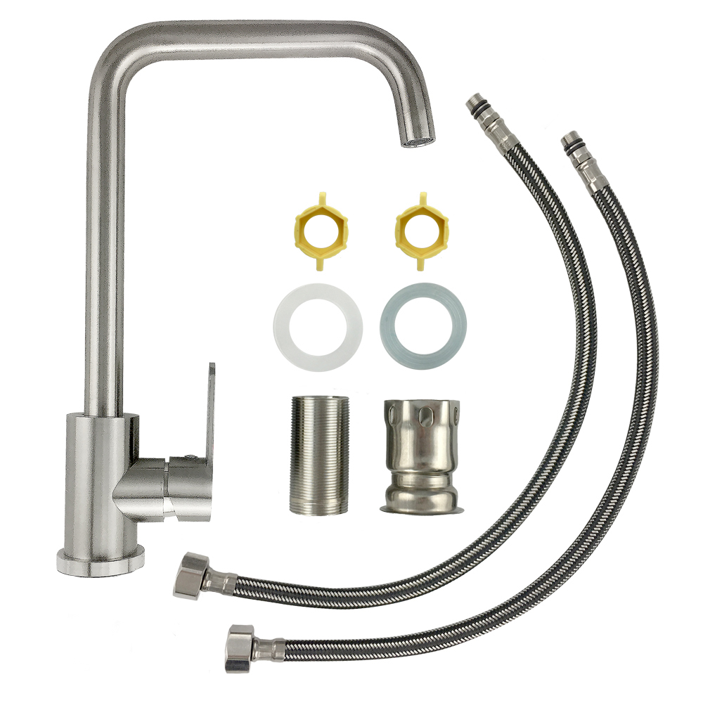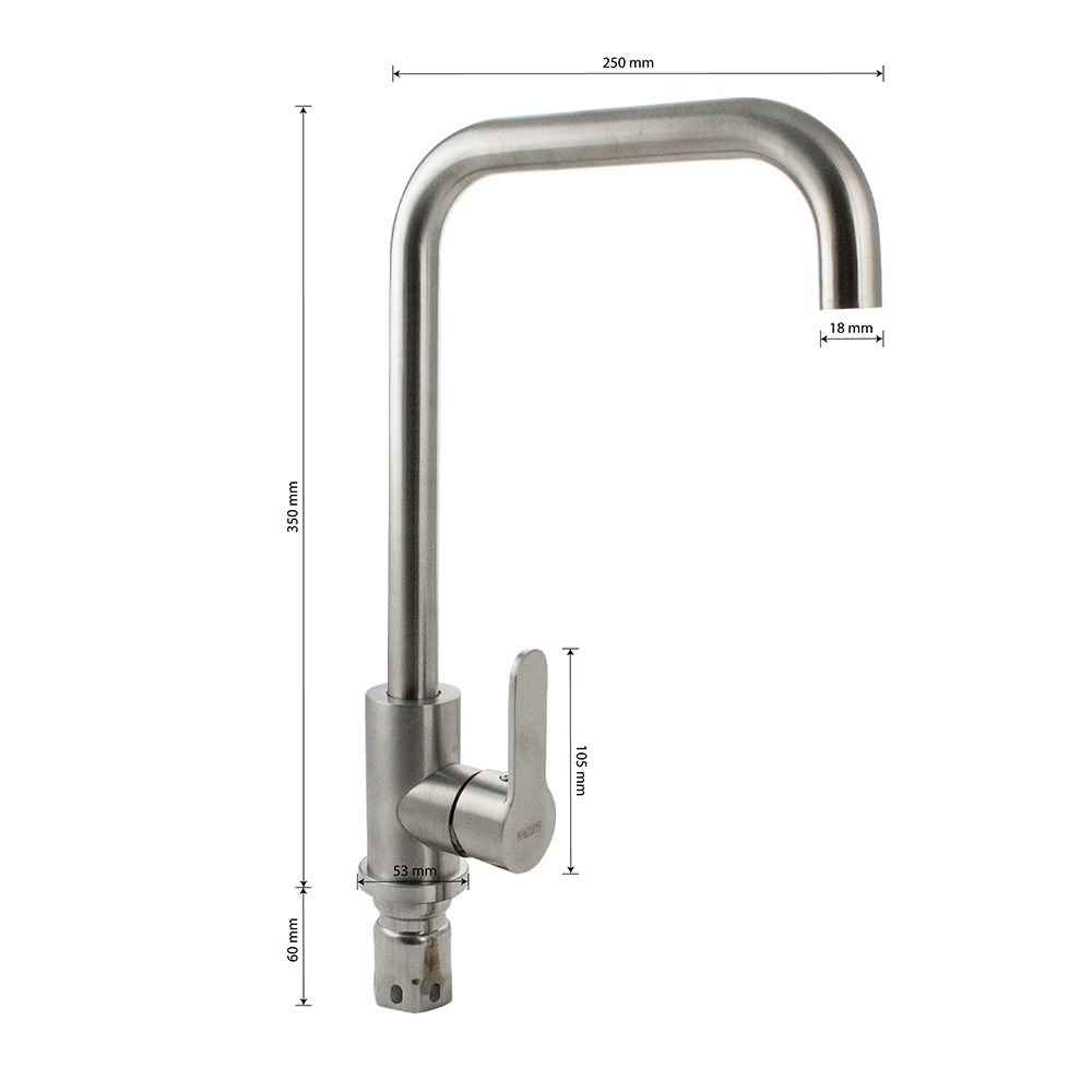 Смеситель для кухонной мойки и раковин, литой матовый корпус, из нержавеющей стали марка 304, с высоким литым П-образным изливом, шаровый. Крепление резьба - гайка, картридж d = 35 мм, ручка литая. Аэратор для экономии воды. Такая модель может использоваться на домашней кухне, на даче, в медицинских учреждениях и общественных местах. Габаритные размеры: высота 350 мм, длина 225 мм, диаметр посадочного седла 54 мм, длина резьбы 60 мм, длина подводки 500 мм. Вес - 1,500 кг, объём - 0,00635 м3. В комплекте паспорт, корпус с изливом, подводка 1/2, крепеж, набор прокладок.