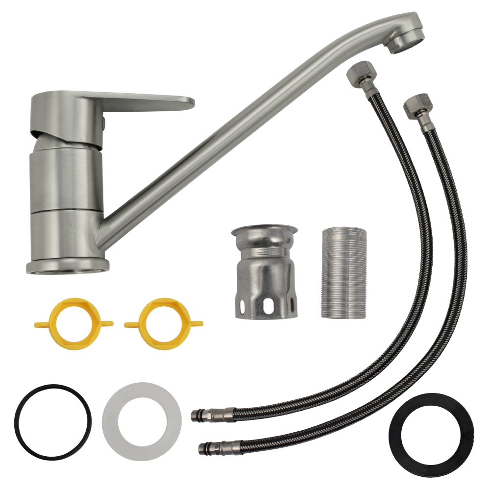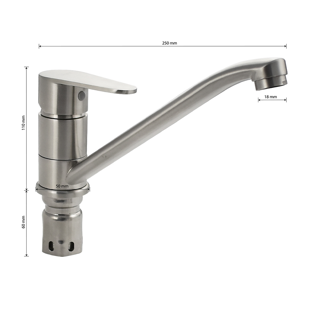 Смеситель для кухонной мойки и раковин, литой матовый корпус с длинным, поворотным изливом 25 см, из нержавеющей стали марки 304, шаровый. Крепление резьба - гайка, картридж d = 40 мм, ручка литая. Аэратор для экономии воды. Такая модель может использоваться на домашней кухне, на даче, в медицинских учреждениях и общественных местах. Габаритные размеры: высота 110 мм, длина 250 мм, длина излива 220 мм, диаметр посадочного седла 50 мм, длина резьбы 60 мм, длина подводки 450 мм. Вес - 1,200 кг, объём - 0,00319 м3. В комплекте паспорт, корпус с изливом, подводка 1/2, крепеж, набор прокладок.