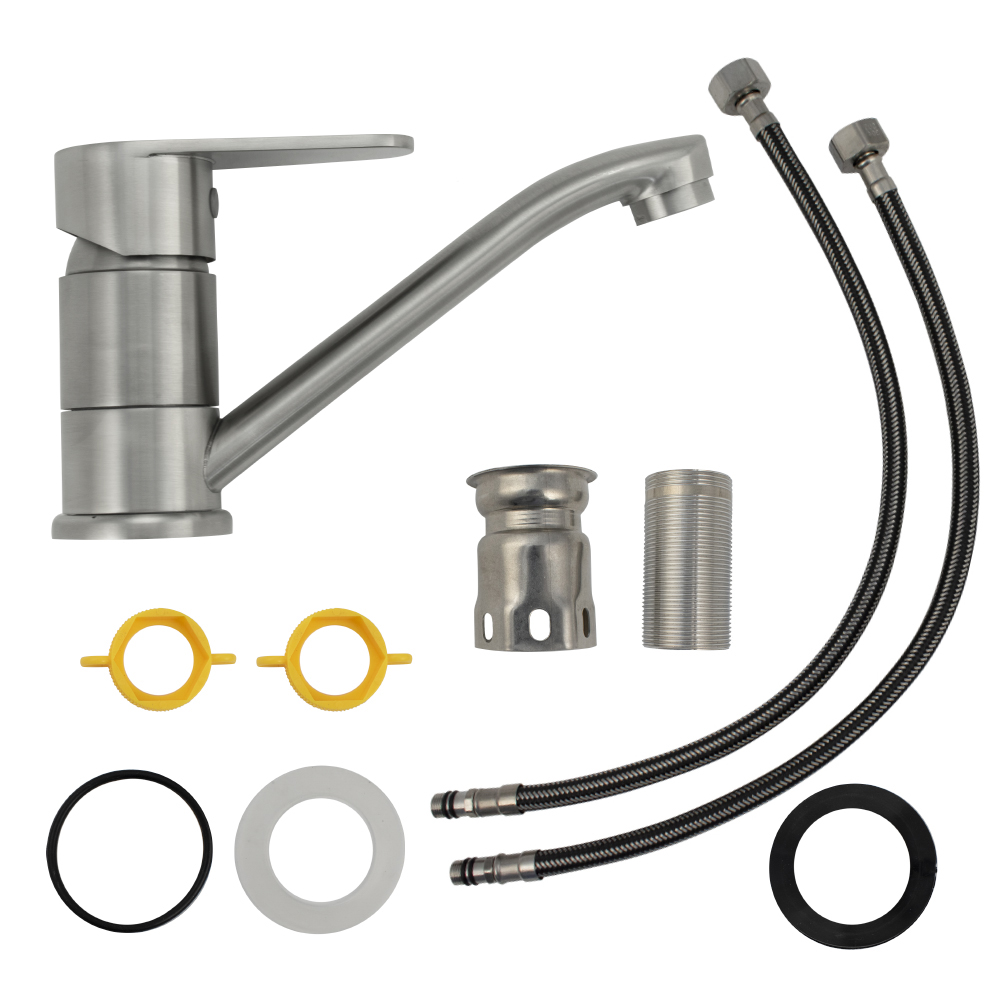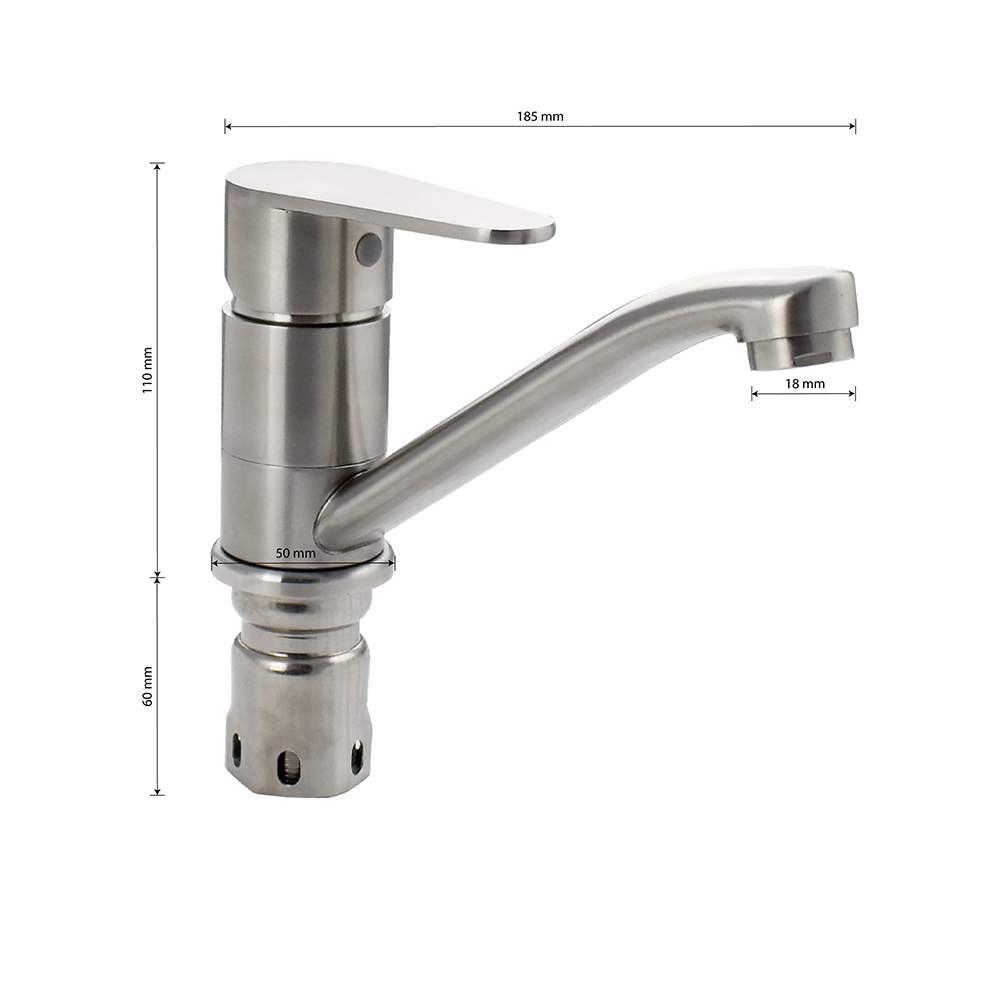 Смеситель для кухонной мойки и раковин, литой матовый корпус с коротким, поворотным изливом 15 см, из нержавеющей стали марки 304, шаровый. Крепление резьба - гайка, картридж d = 40 мм, ручка литая. Аэратор для экономии воды. Такая модель может использоваться на домашней кухне, на даче, в медицинских учреждениях и общественных местах. Габаритные размеры: высота 110 мм, длина 185 мм, длина излива 150 мм, диаметр посадочного седла 50 мм, длина резьбы 60 мм, длина подводки 450 мм. Вес - 1,100 кг, объём - 0,00237 м3. В комплекте паспорт, корпус с изливом, подводка 1/2, крепеж, набор прокладок.