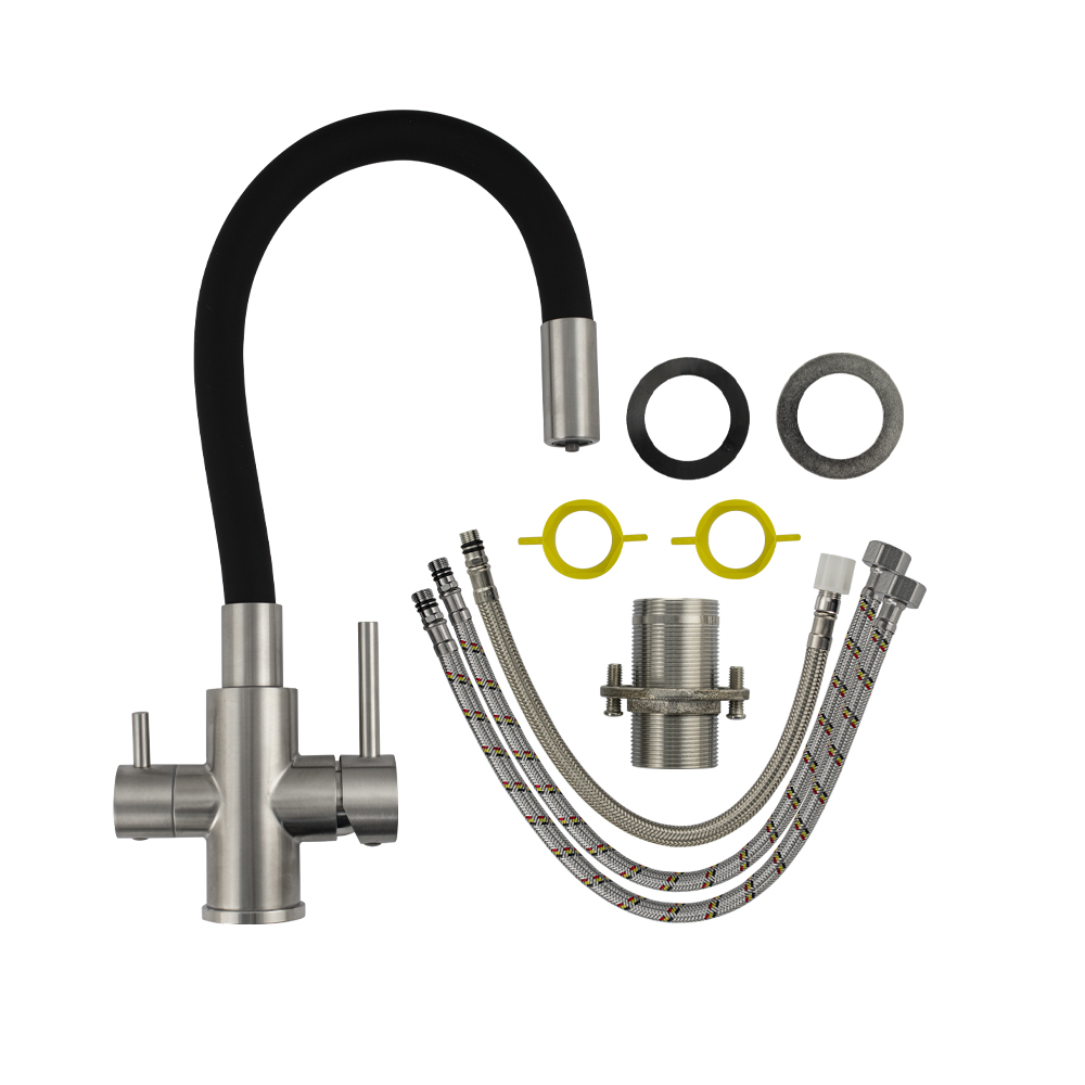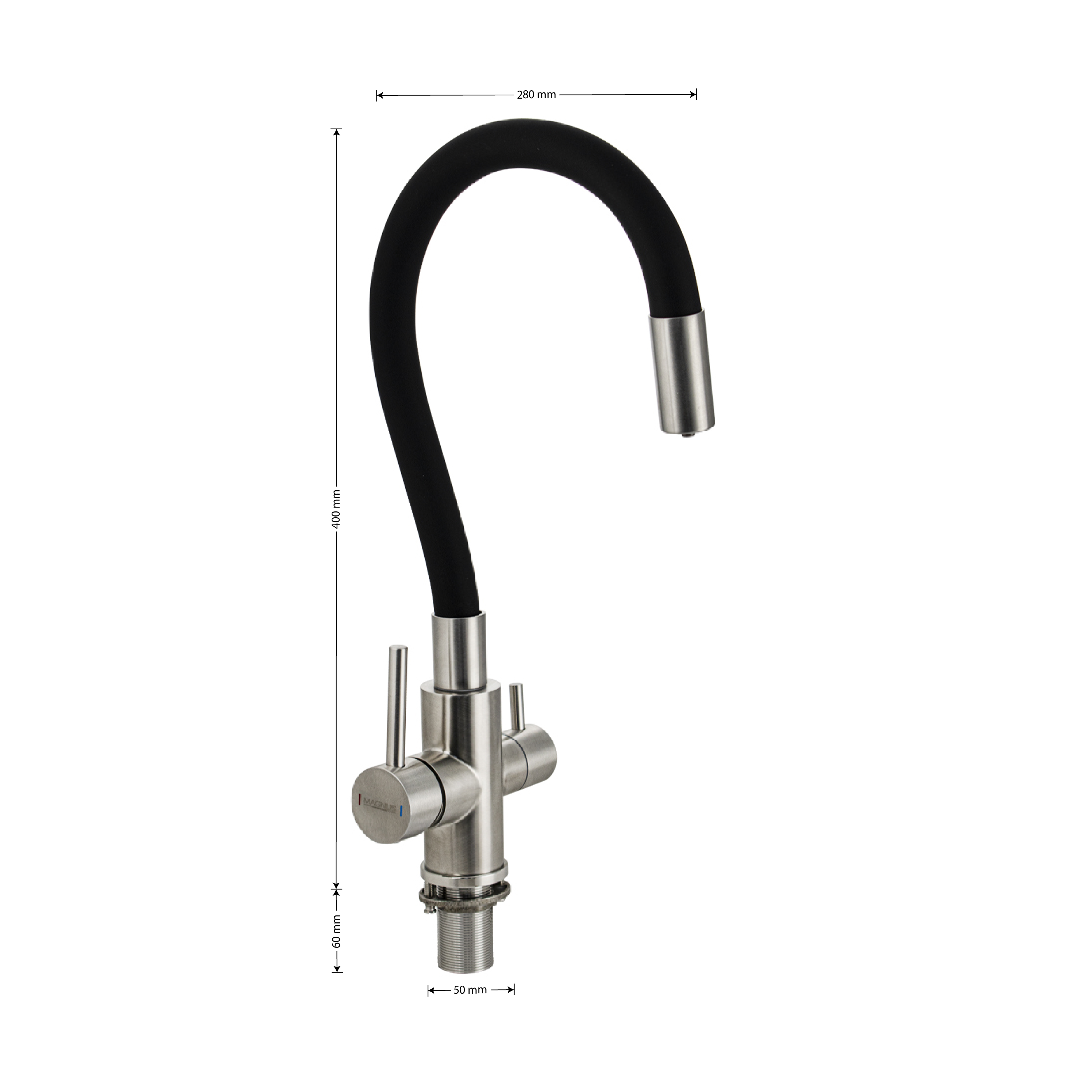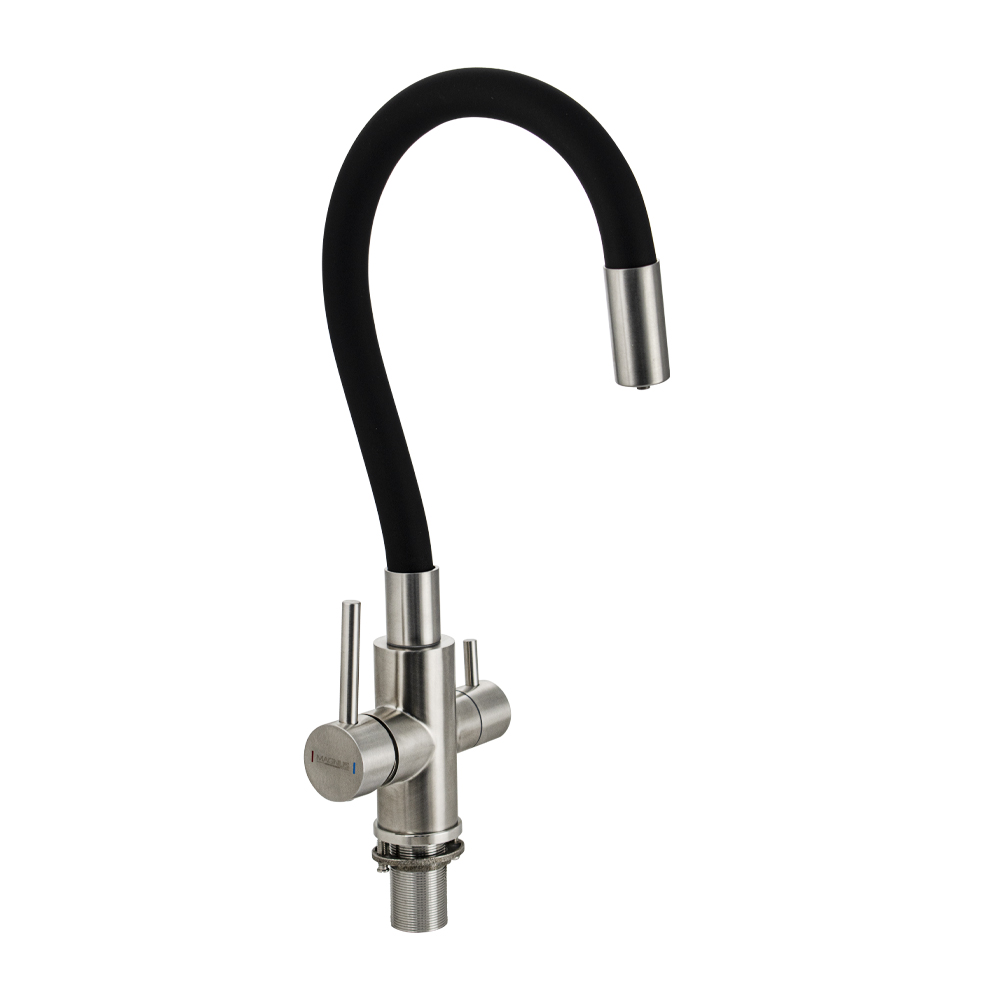 Смеситель для кухонной мойки и раковин с двойным выпуском воды для фильтра, литой матовый корпус, из нержавеющей стали марки 304, с высоким С-образным гибким изливом чёрного цвета, шаровый. Крепление резьба - гайка, картридж d = 40 мм, ручка шток. Аэратор для экономии воды. Такая модель может использоваться на домашней кухне, на даче, в медицинских учреждениях и общественных местах. Габаритные размеры: высота 400 мм, длина 280 мм, диаметр посадочного седла 50 мм, длина резьбы 60 мм, длина подводки 450 мм. Вес - 2.83 кг, объём - 0.0081 м3. В комплекте паспорт, корпус с изливом, подводка 1/2, крепеж, набор прокладок.