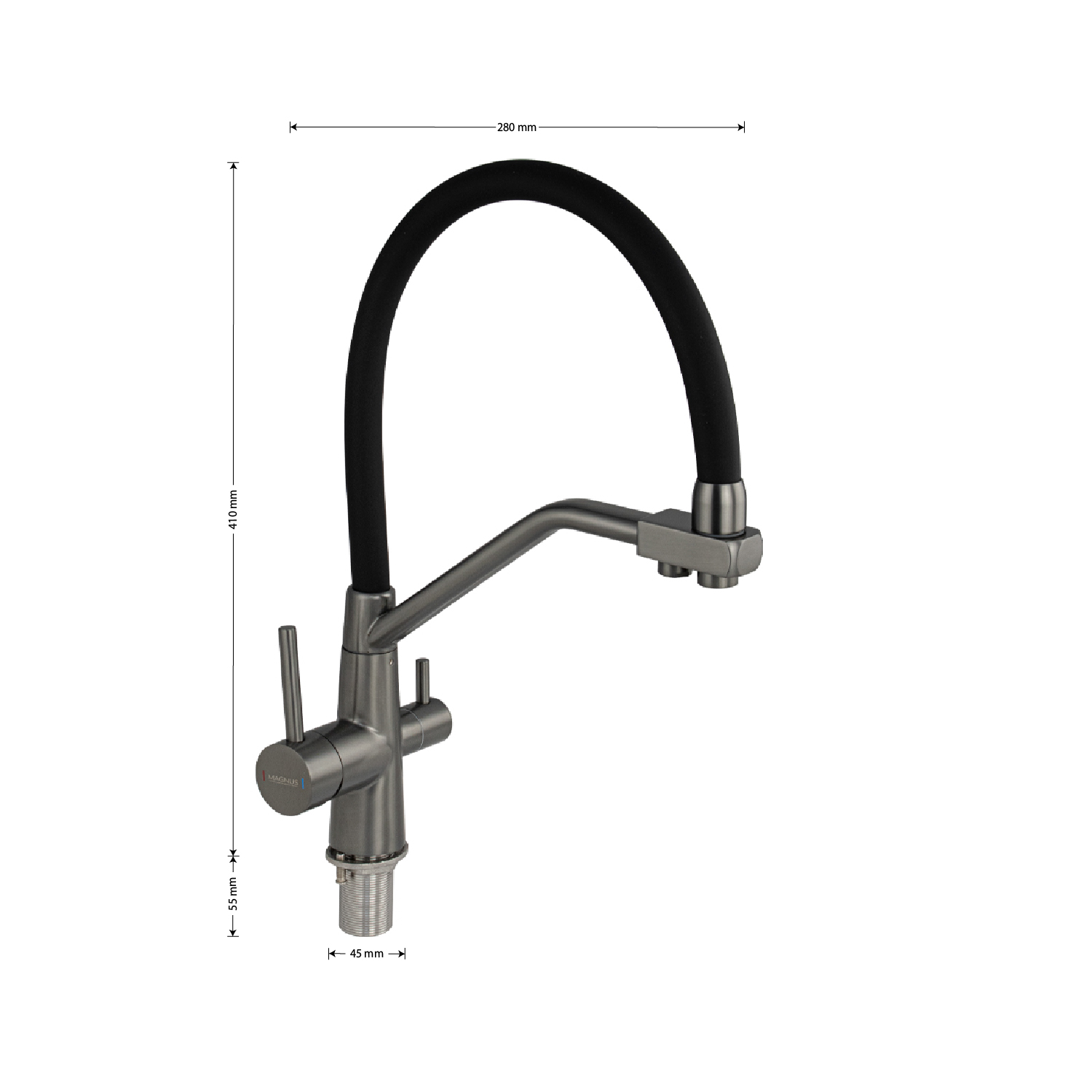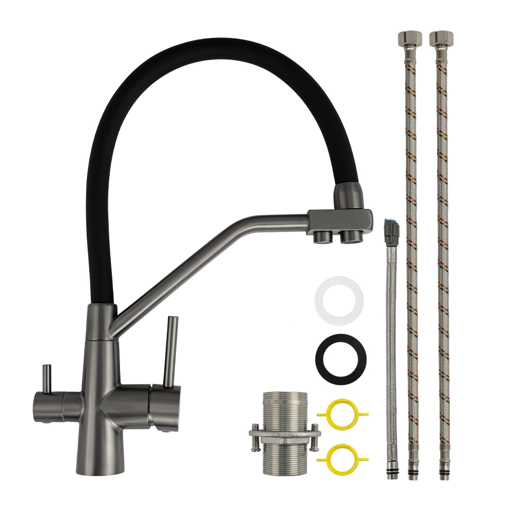 Смеситель для кухонной мойки и раковин с двойным выпуском воды для фильтра, литой матовый корпус, из нержавеющей стали марка 304, с высоким С-образным гибким изливом чёрного цвета с фиксацией на жёстком изливе, шаровый. Крепление резьба - гайка, картридж d = 40 мм, ручка шток. Аэратор для экономии воды. Такая модель может использоваться на домашней кухне, на даче, в медицинских учреждениях и общественных местах. Габаритные размеры: высота 410 мм, длина 280 мм, диаметр посадочного седла 45 мм, длина резьбы 55 мм, длина подводки 500 мм. Вес - 2,400 кг, объём - 0,00690 м3. В комплекте паспорт, корпус с изливом, подводка 1/2, крепеж, набор прокладок.