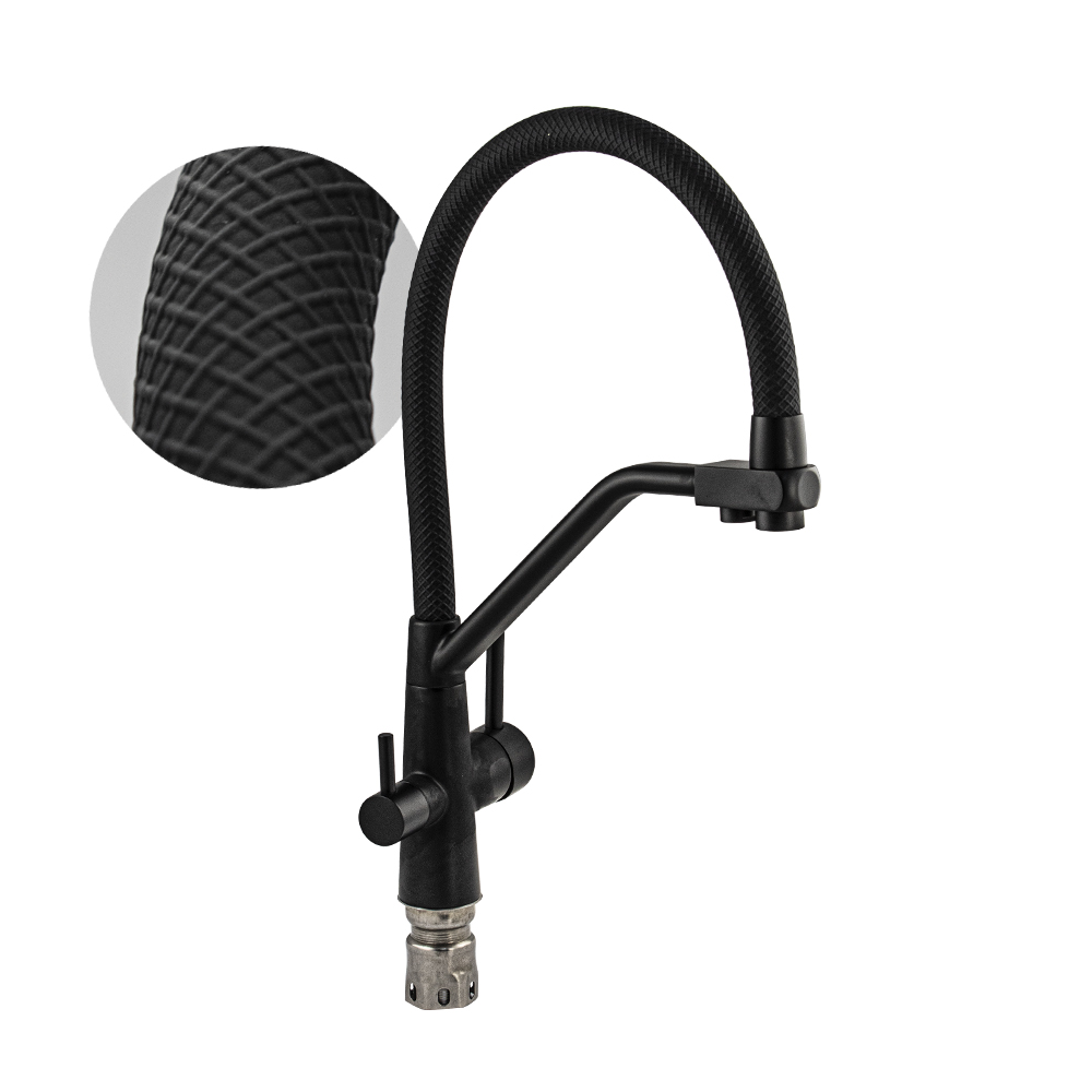Смеситель для кухонной мойки и раковин с двойным выпуском воды для фильтра, литой чёрный корпус, из нержавеющей стали марка SUS 304, с гибким изливом чёрного цвета с фиксацией на жёстком изливе, шаровый. Крепление резьба - гайка, картридж d = мм, ручка шток. Аэратор для экономии воды. Такая модель может использоваться на домашней кухне, на даче, в медицинских учреждениях и общественных местах. Габаритные размеры: высота 420 мм, длина 300 мм, диаметр посадочного седла 45 мм, длина резьбы 60 мм, длина подводки 500 мм. Вес - 2.3 кг, объём - 0.00746 м3. В комплекте паспорт, корпус с изливом, подводка 1/2, крепеж, набор прокладок.