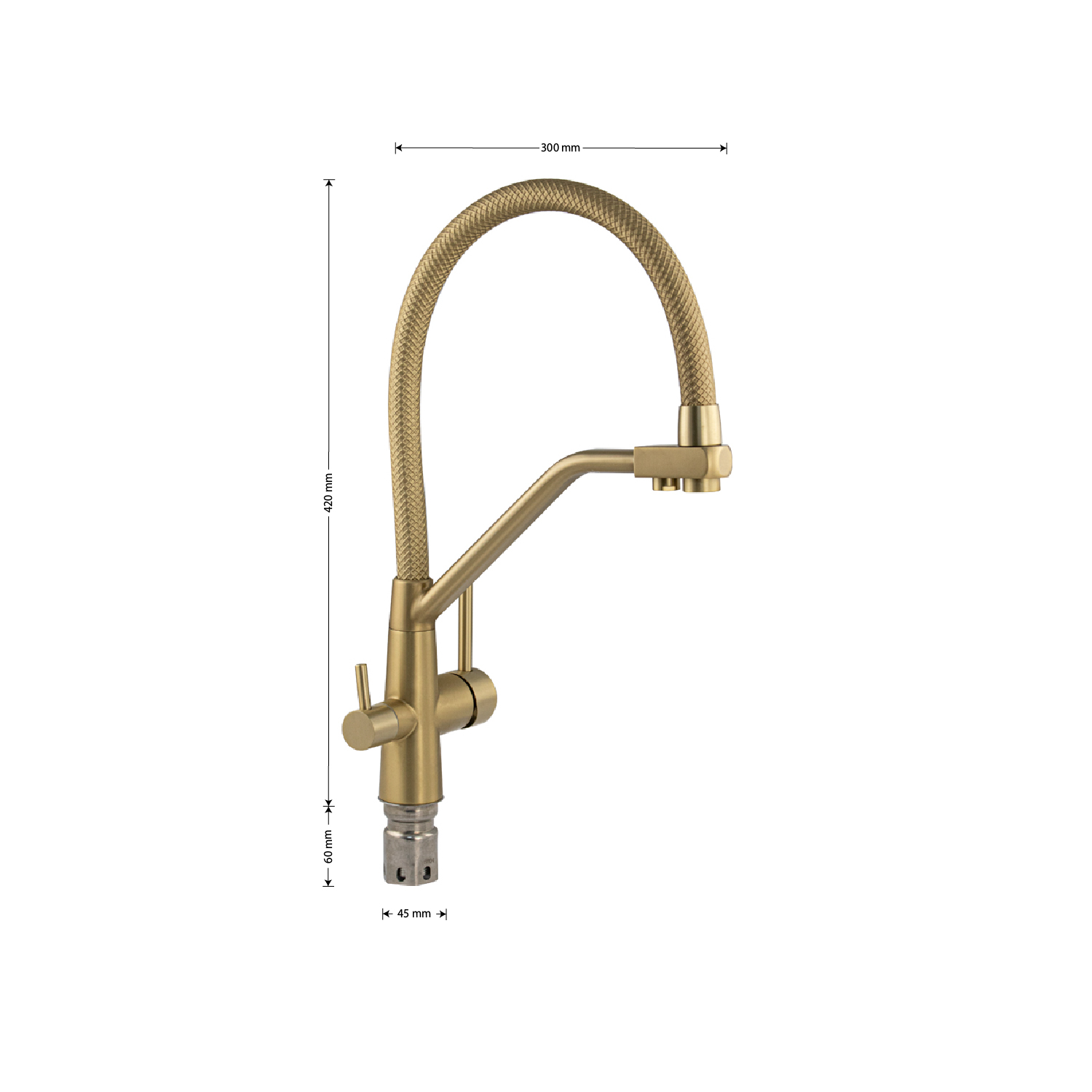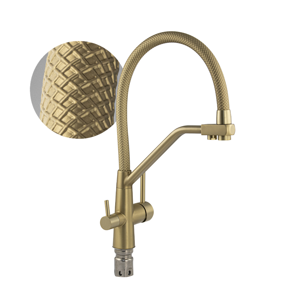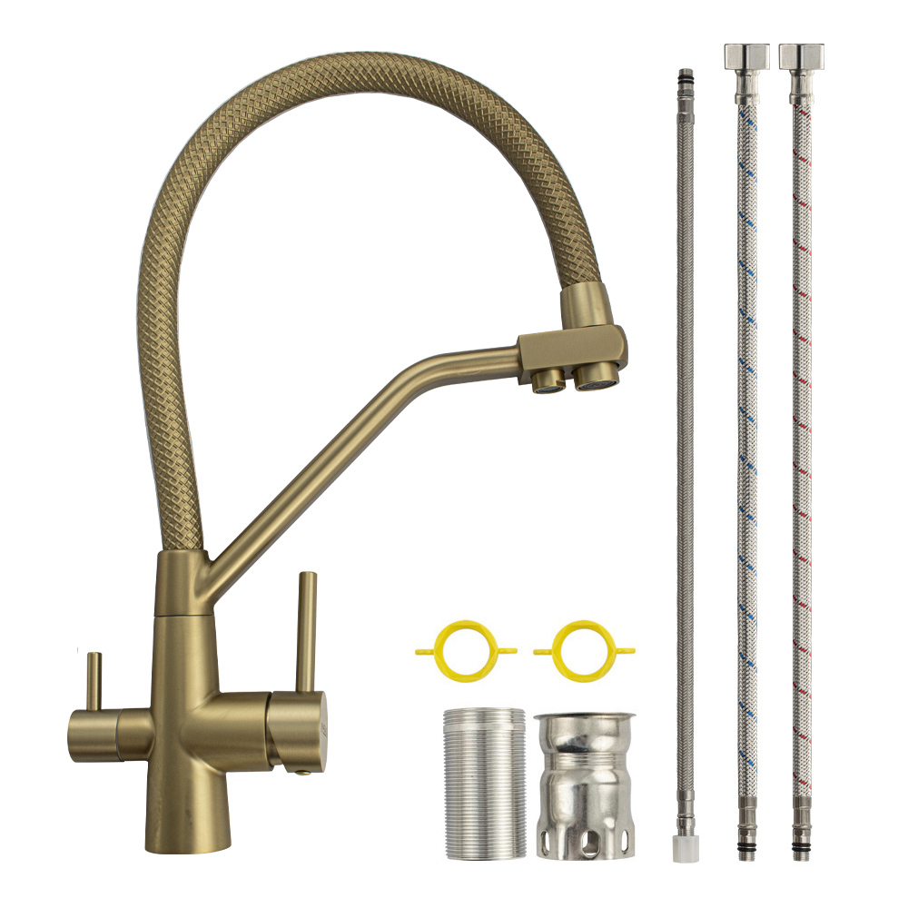 Смеситель для кухонной мойки и раковин с двойным выпуском воды для фильтра, литой корпус цвета матовое золото, из нержавеющей стали марка SUS 304, с гибким изливом золотого цвета с фиксацией на жёстком изливе, шаровый. Крепление резьба - гайка, картридж d = мм, ручка шток. Аэратор для экономии воды. Такая модель может использоваться на домашней кухне, на даче, в медицинских учреждениях и общественных местах. Габаритные размеры: высота 420 мм, длина 300 мм, диаметр посадочного седла 45 мм, длина резьбы 60 мм, длина подводки 500 мм. Вес - 2.3 кг, объём - 0.00746 м3. В комплекте паспорт, корпус с изливом, подводка 1/2, крепеж, набор прокладок.