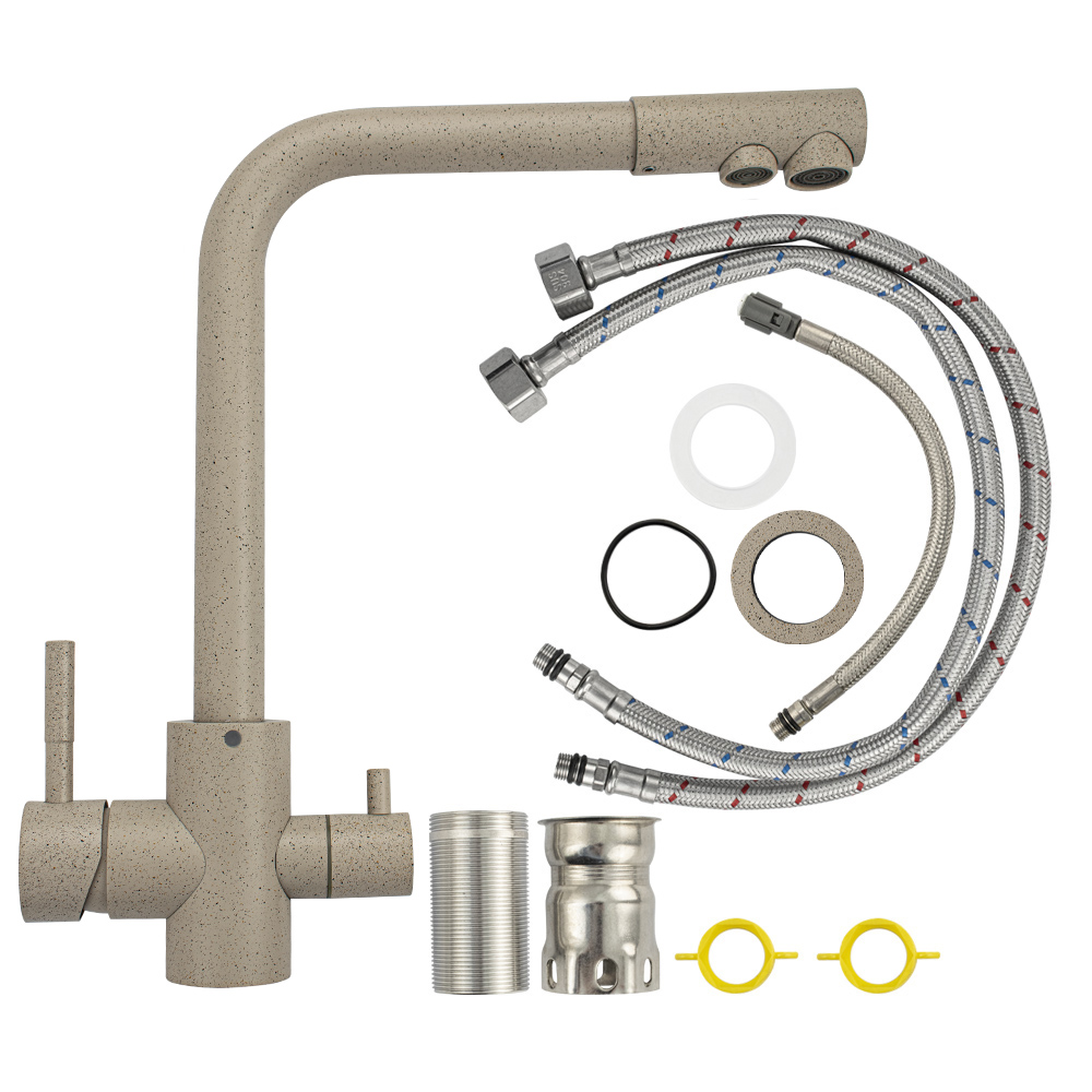 Смеситель для кухонной мойки и раковин, с двойным выпуском воды для фильтра, литой матовый корпус, из нержавеющей стали марки 304 темнокоричневый, с высоким Г - образным изливом, шаровый. Крепление резьба - гайка, картридж d = 40 мм, ручка шток. Аэратор для экономии воды. Такая модель может использоваться на домашней кухне, на даче, в медицинских учреждениях и общественных местах. Габаритные размеры: высота 300 мм, длина 230 мм, диаметр посадочного седла 40 мм, длина резьбы 45 мм, длина подводки 500 мм. Вес - 1.9 кг, объём - 0.009 м3. В комплекте паспорт, корпус с изливом, подводка 1/2, крепеж, набор прокладок