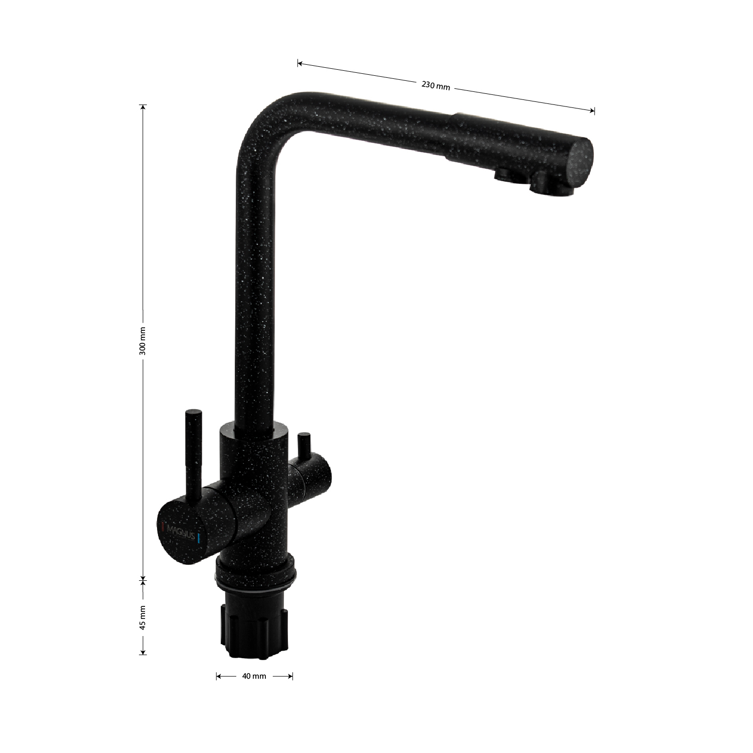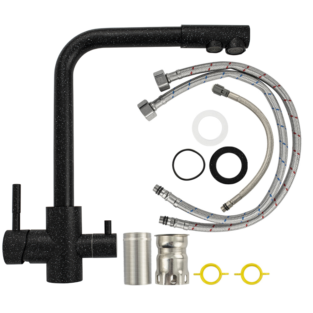 Смеситель для кухонной мойки и раковин, с двойным выпуском воды для фильтра, литой матовый корпус, из нержавеющей стали марки 304 черный, с высоким Г - образным изливом, шаровый. Крепление резьба - гайка, картридж d = 40 мм, ручка шток. Аэратор для экономии воды. Такая модель может использоваться на домашней кухне, на даче, в медицинских учреждениях и общественных местах. Габаритные размеры: высота 300 мм, длина 230 мм, диаметр посадочного седла 40 мм, длина резьбы 45 мм, длина подводки 500 мм. Вес - 1.9 кг, объём - 0.009 м3. В комплекте паспорт, корпус с изливом, подводка 1/2, крепеж, набор прокладок
