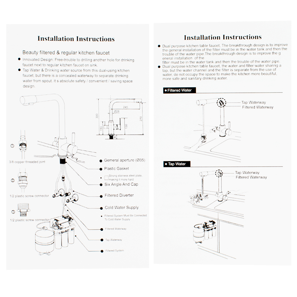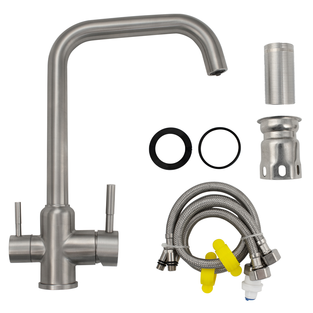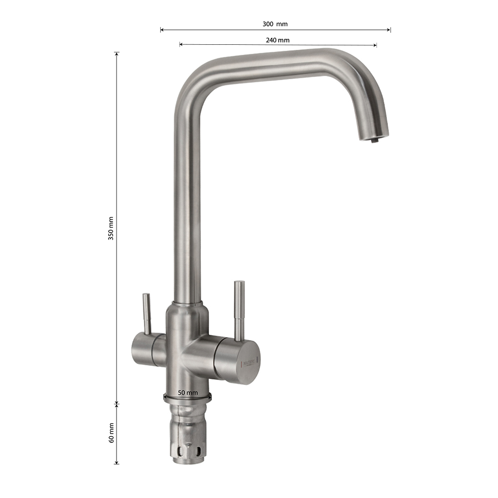 Смеситель для кухонной мойки и раковин, с двойным выпуском воды для фильтра, литой матовый корпус, из нержавеющей стали марки 304, с высоким Г-образным изливом, шаровый. Крепление резьба - гайка, картридж d = 40 мм, ручка шток. Аэратор для экономии воды. Такая модель может использоваться на домашней кухне, на даче, в медицинских учреждениях и общественных местах. Габаритные размеры: высота 350 мм, длина 300 мм, длина излива 240 мм, диаметр посадочного седла 50 мм, длина резьбы 60 мм, длина подводки 450 мм. Вес - 2,200 кг, объём - 0,00613 м3. В комплекте паспорт, корпус с изливом, подводка 1/2, крепеж, набор прокладок.