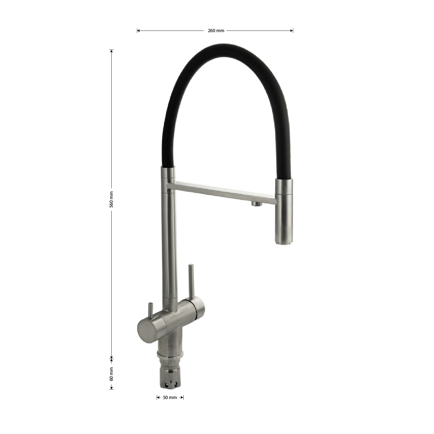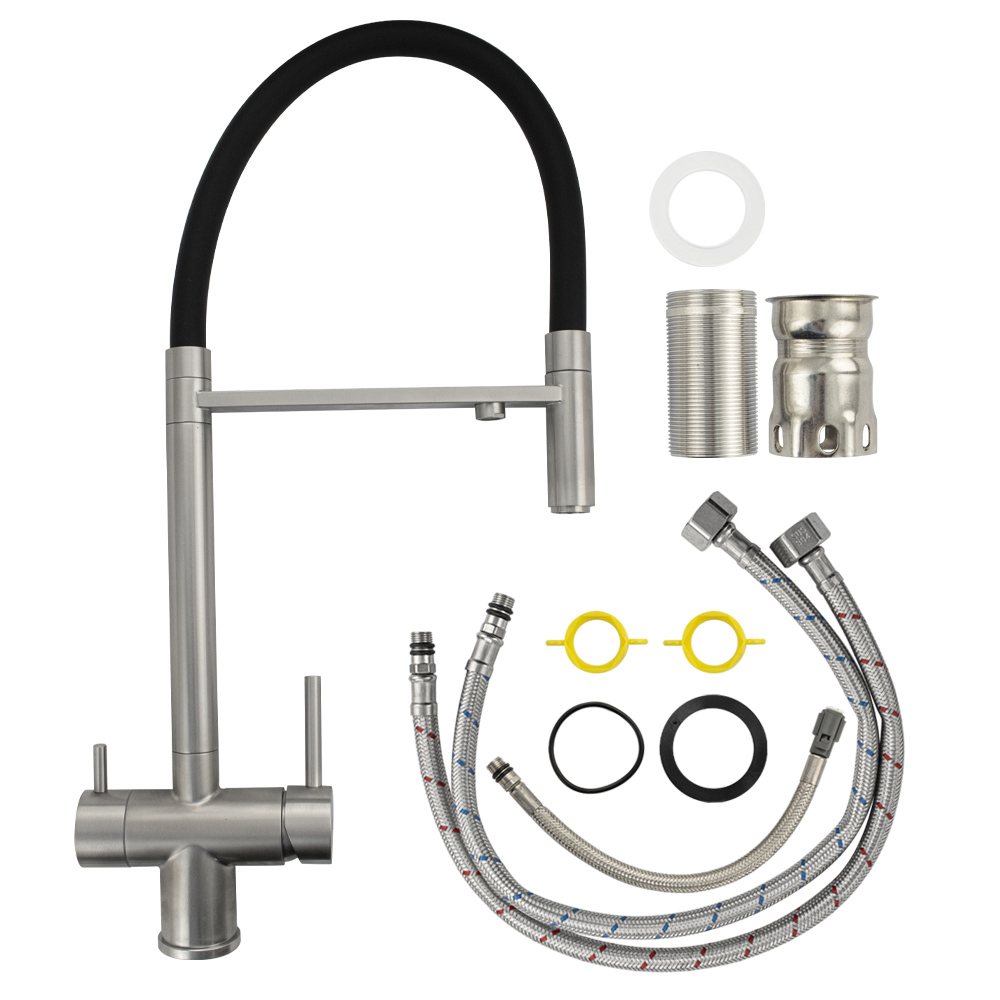 Смеситель для кухонной мойки и раковин с двойным выпуском воды для фильтра, литой матовый корпус, из нержавеющей стали марка 304, с высоким С-образным гибким изливом чёрного цвета, шаровый. Крепление резьба - гайка, картридж d = 40 мм, ручка шток. Аэратор для экономии воды. Такая модель может использоваться на домашней кухне, на даче, в медицинских учреждениях и общественных местах. Габаритные размеры: высота 560 мм, длина 260 мм, диаметр посадочного седла 50 мм, длина резьбы 60 мм, длина подводки 500 мм. Вес - 2,700 кг, объём - 0,01300 м3. В комплекте паспорт, корпус с изливом, подводка 1/2, крепеж, набор прокладок