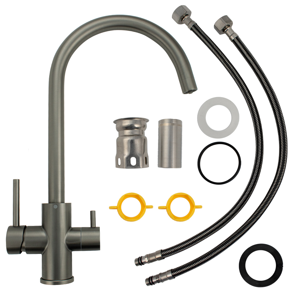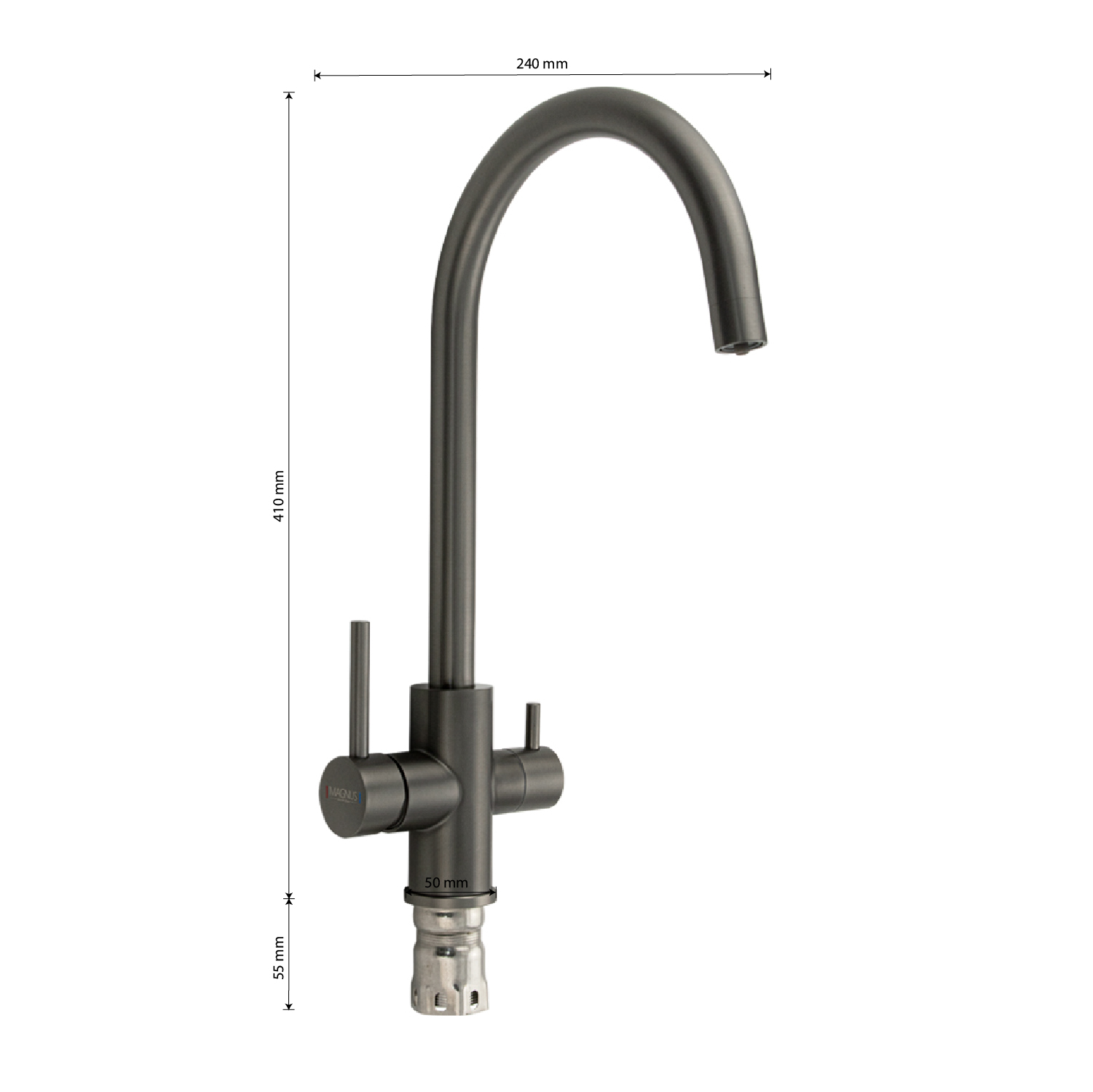 Смеситель для кухонной мойки и раковин с двойным выпуском воды для фильтра, литой корпус, цвет ГРАФИТ, из нержавеющей стали марки 304, с высоким С-образным изливом, шаровый. Крепление резьба - гайка, картридж d = 40 мм, ручка шток. Аэратор для экономии воды. Такая модель может использоваться на домашней кухне, на даче, в медицинских учреждениях и общественных местах. Габаритные размеры: высота 410 мм, длина 240 мм, диаметр посадочного седла 50 мм, длина резьбы 55 мм, длина подводки 450 мм. Вес - 2,300 кг, объём - 0,00900 м3. В комплекте паспорт, корпус с изливом, подводка 1/2, крепеж, набор прокладок.