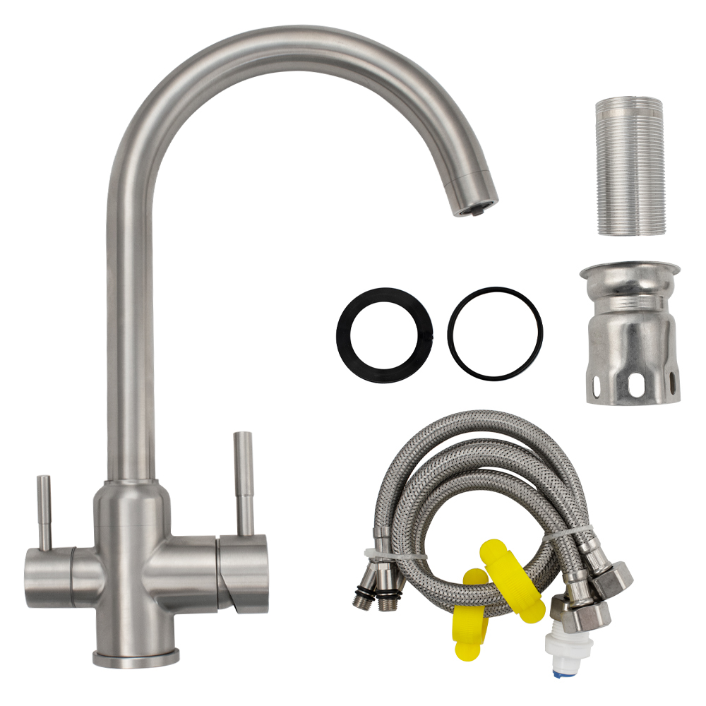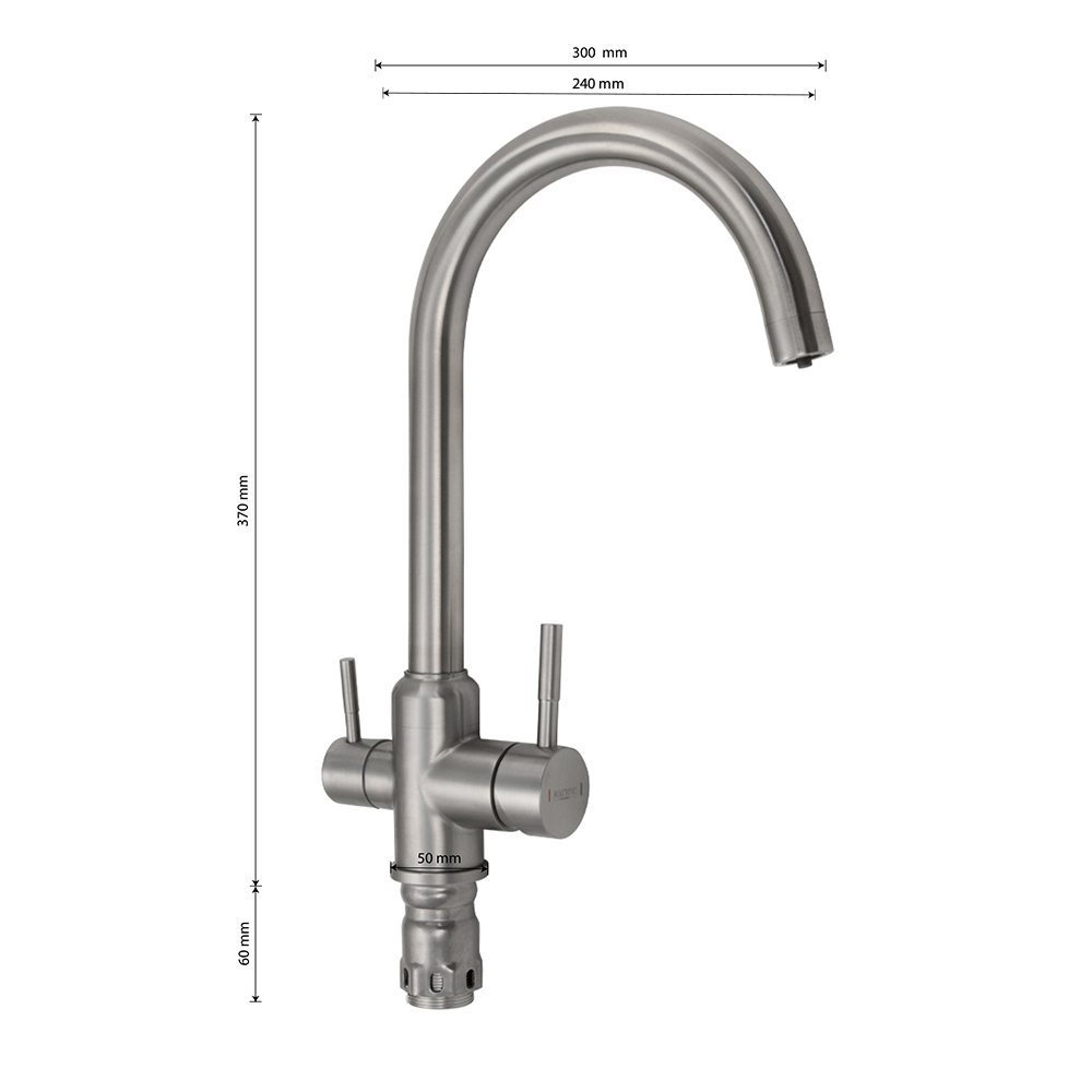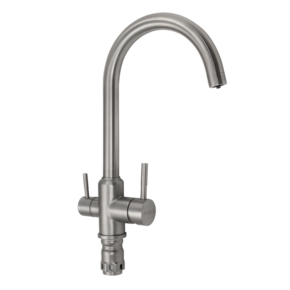 Смеситель для кухонной мойки и раковин, с двойным выпуском воды для фильтра, литой матовый корпус, из нержавеющей стали марки 304, с высоким С-образным изливом, шаровый. Крепление резьба - гайка, картридж d = 40 мм, ручка шток. Аэратор для экономии воды. Такая модель может использоваться на домашней кухне, на даче, в медицинских учреждениях и общественных местах. Габаритные размеры: высота 370 мм, длина 300 мм, длина излива 240 мм, диаметр посадочного седла 50 мм, длина резьбы 60 мм, длина подводки 450 мм. Вес - 2,100 кг, объём - 0,00613 м3. В комплекте паспорт, корпус с изливом, подводка 1/2, крепеж, набор прокладок.