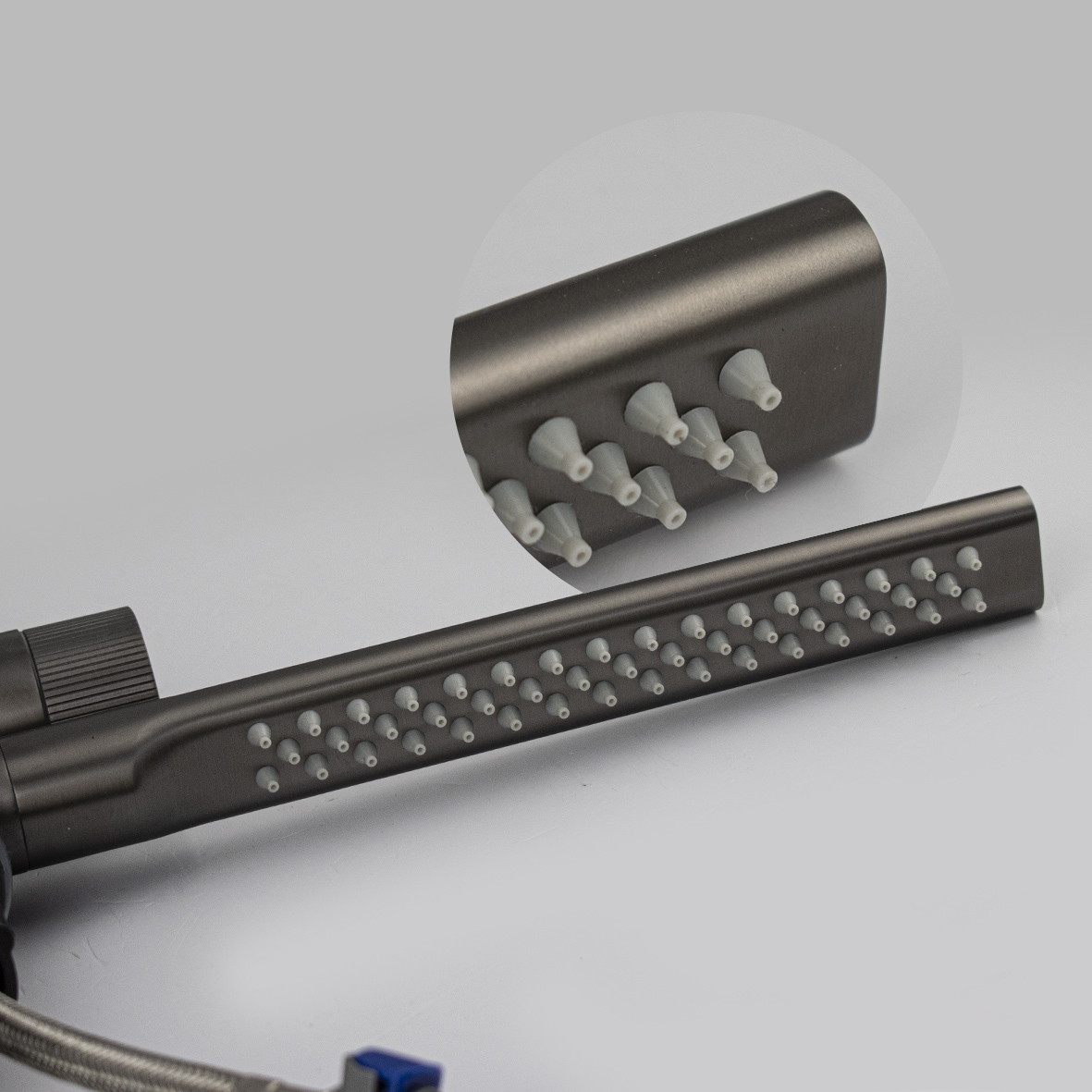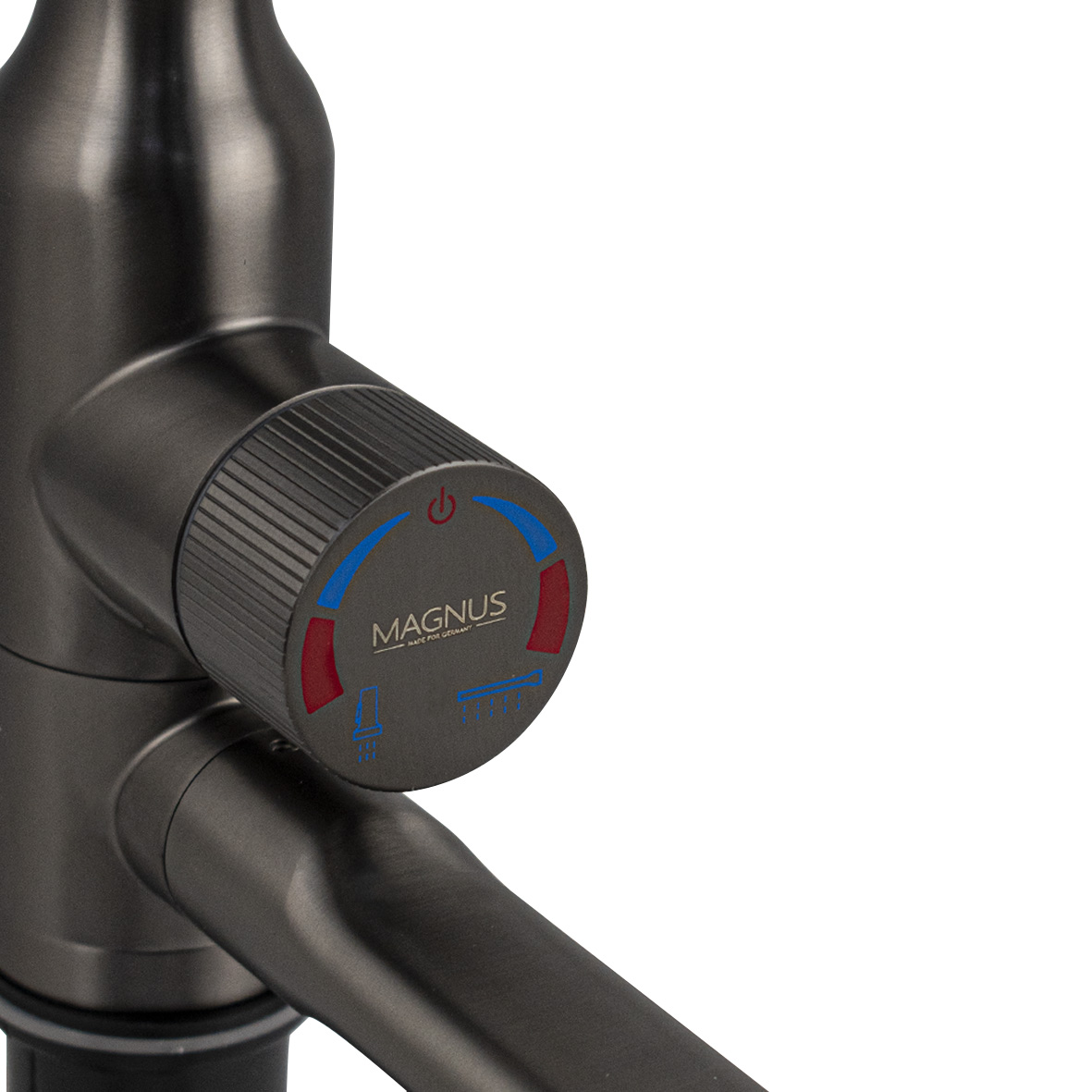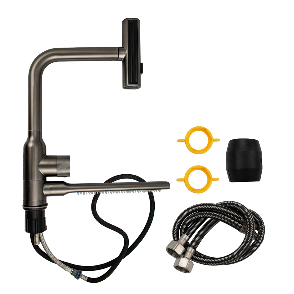 Смеситель для кухонной мойки и раковин, вытяжной излив - лейка с переключением режимов подачи воды и с горизонтальной каскадной лейкой, литой матовый корпус, из нержавеющей стали, цвет графит, шаровый. Крепление резьба - гайка, картридж d = 35 мм, ручка литая. Аэратор для экономии воды. Такая модель может использоваться на домашней кухне, на даче, в медицинских учреждениях и общественных местах. Габаритные размеры: высота 370 мм, длина 230 мм, посадочное седло 45 мм, длина резьбы 50 мм. Вес - 2,1 кг, объём - 0,01 м3. В комплекте паспорт, корпус с изливом, подводка 1/2, крепеж, набор прокладок.