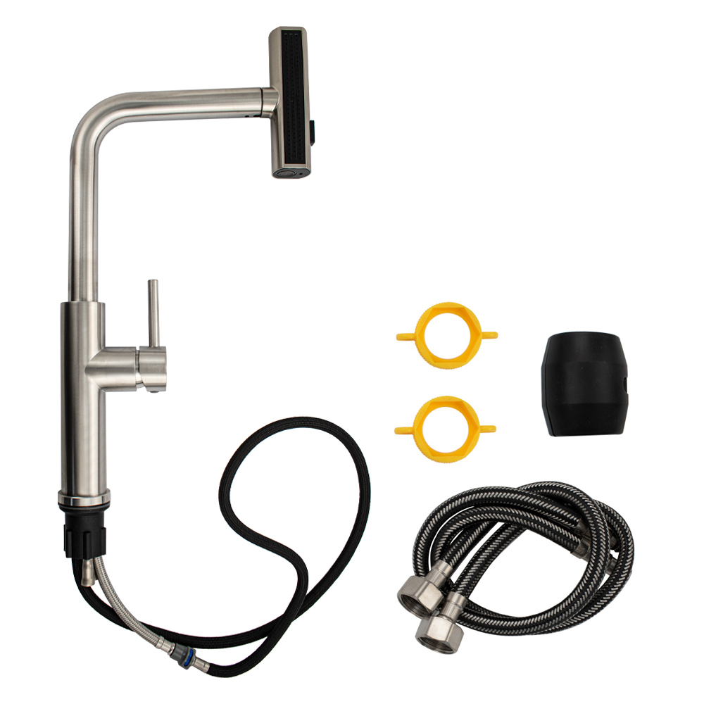 Смеситель для кухонной мойки и раковин, вытяжной излив - лейка с переключением режимов подачи воды, литой матовый корпус, из нержавеющей стали, цвет сатин, шаровый. Крепление резьба - гайка, картридж d = 35 мм, ручка литая. Аэратор для экономии воды. Такая модель может использоваться на домашней кухне, на даче, в медицинских учреждениях и общественных местах. Габаритные размеры: высота 450 мм, длина 230 мм, посадочное седло 45 мм, длина резьбы 50 мм. Вес - 1,85 кг, объём - 0,01 м3. В комплекте паспорт, корпус с изливом, подводка 1/2, крепеж, набор прокладок.