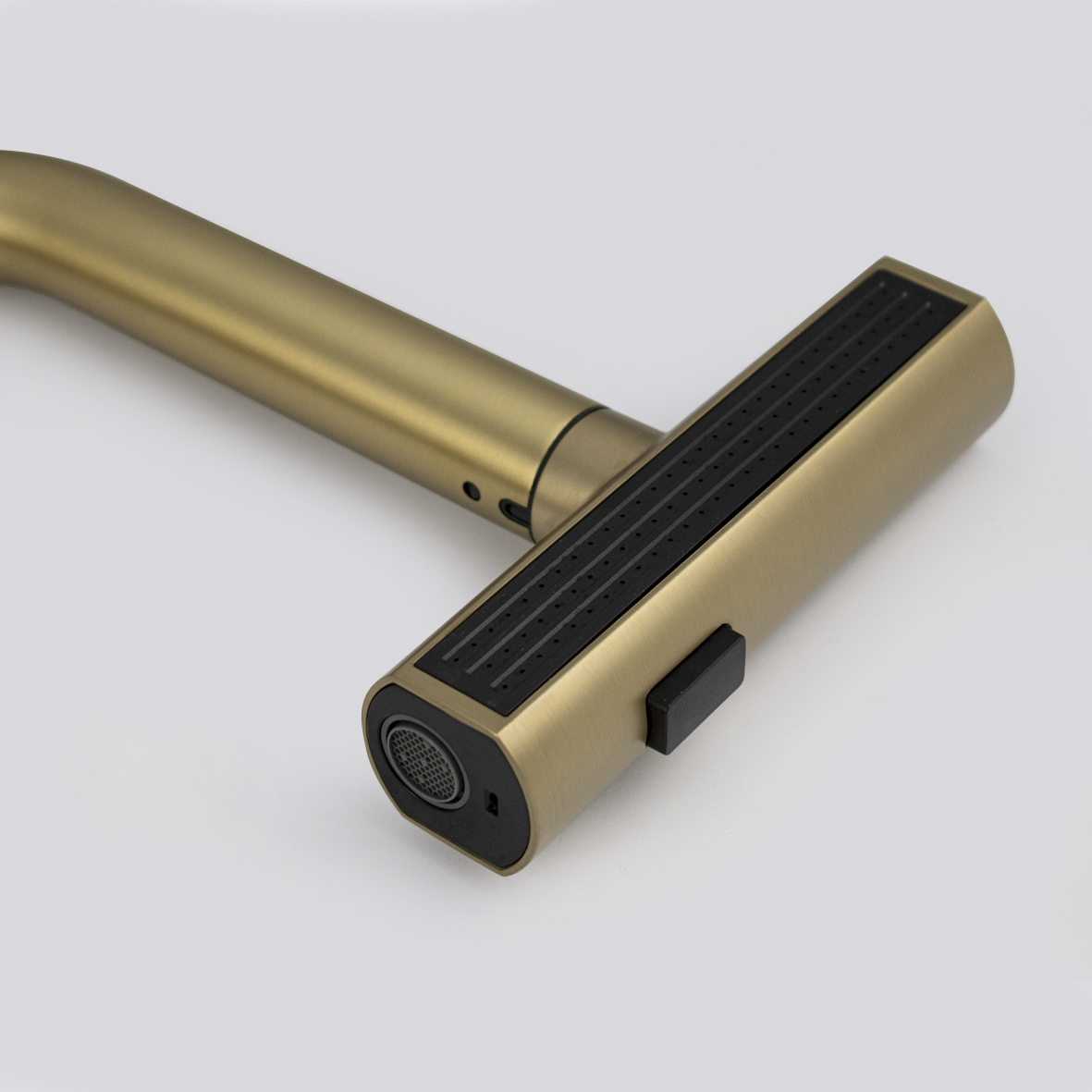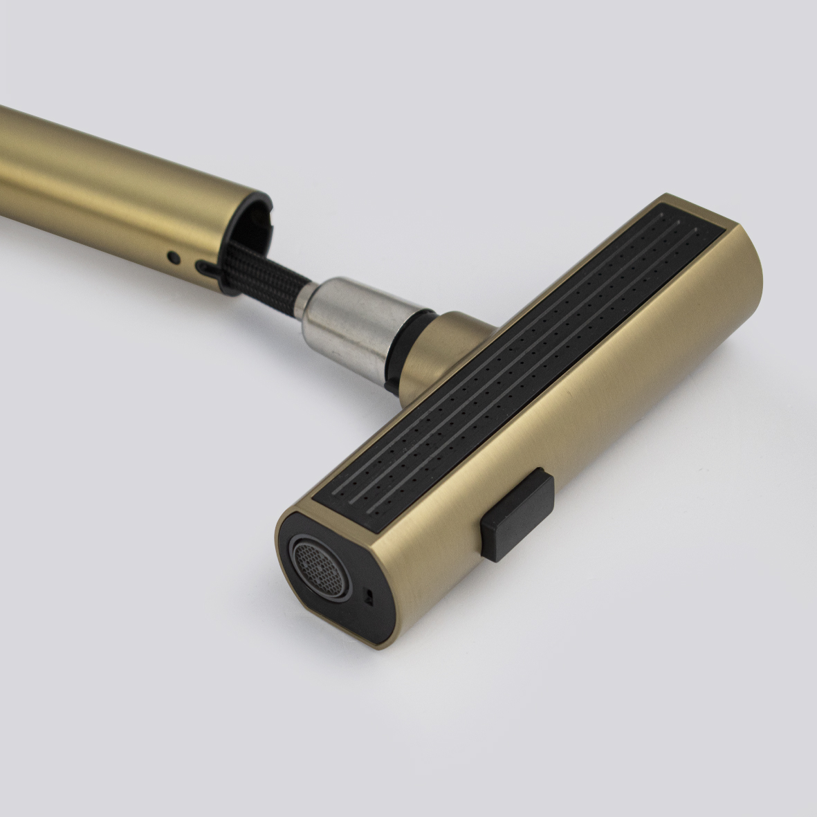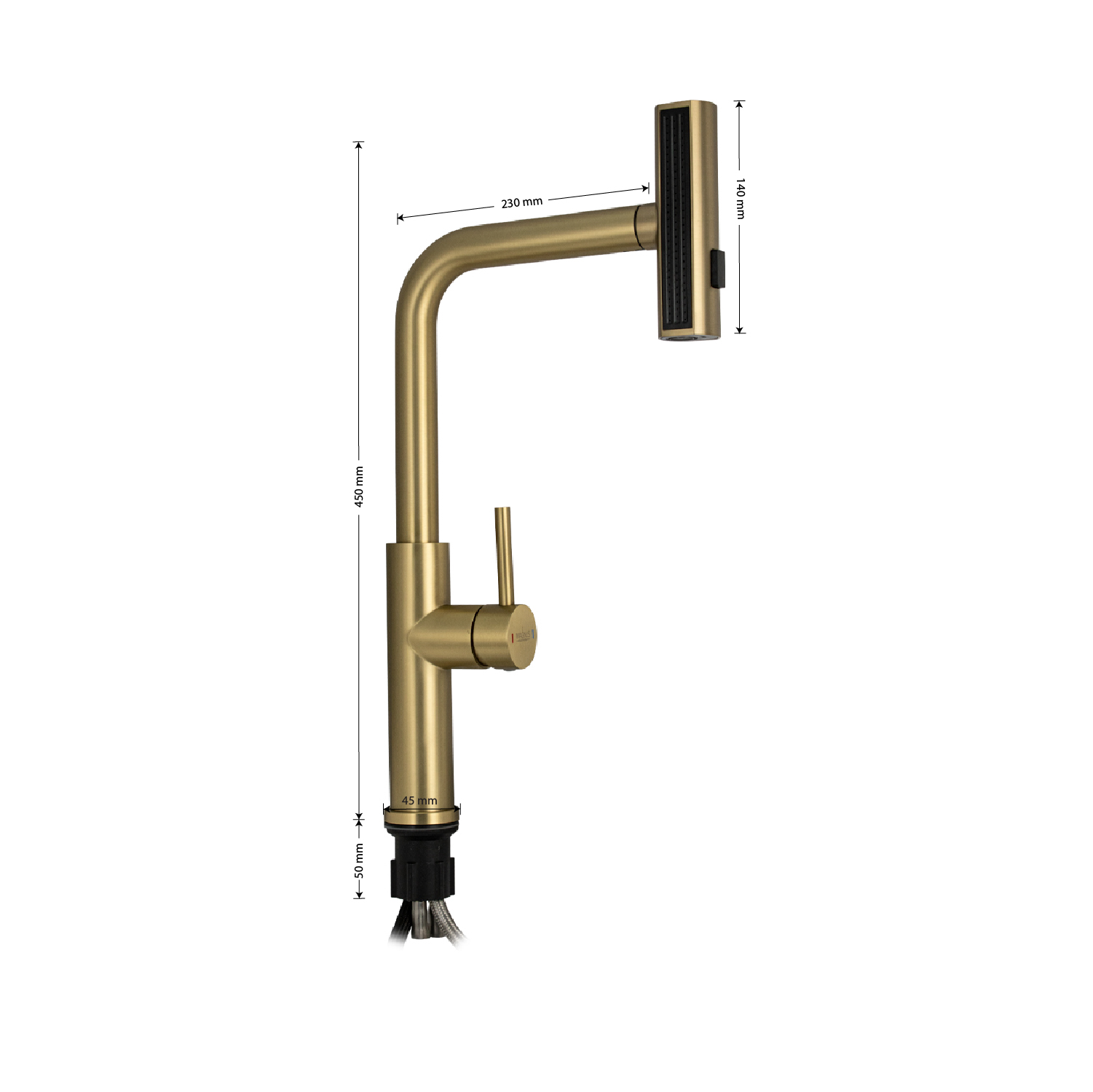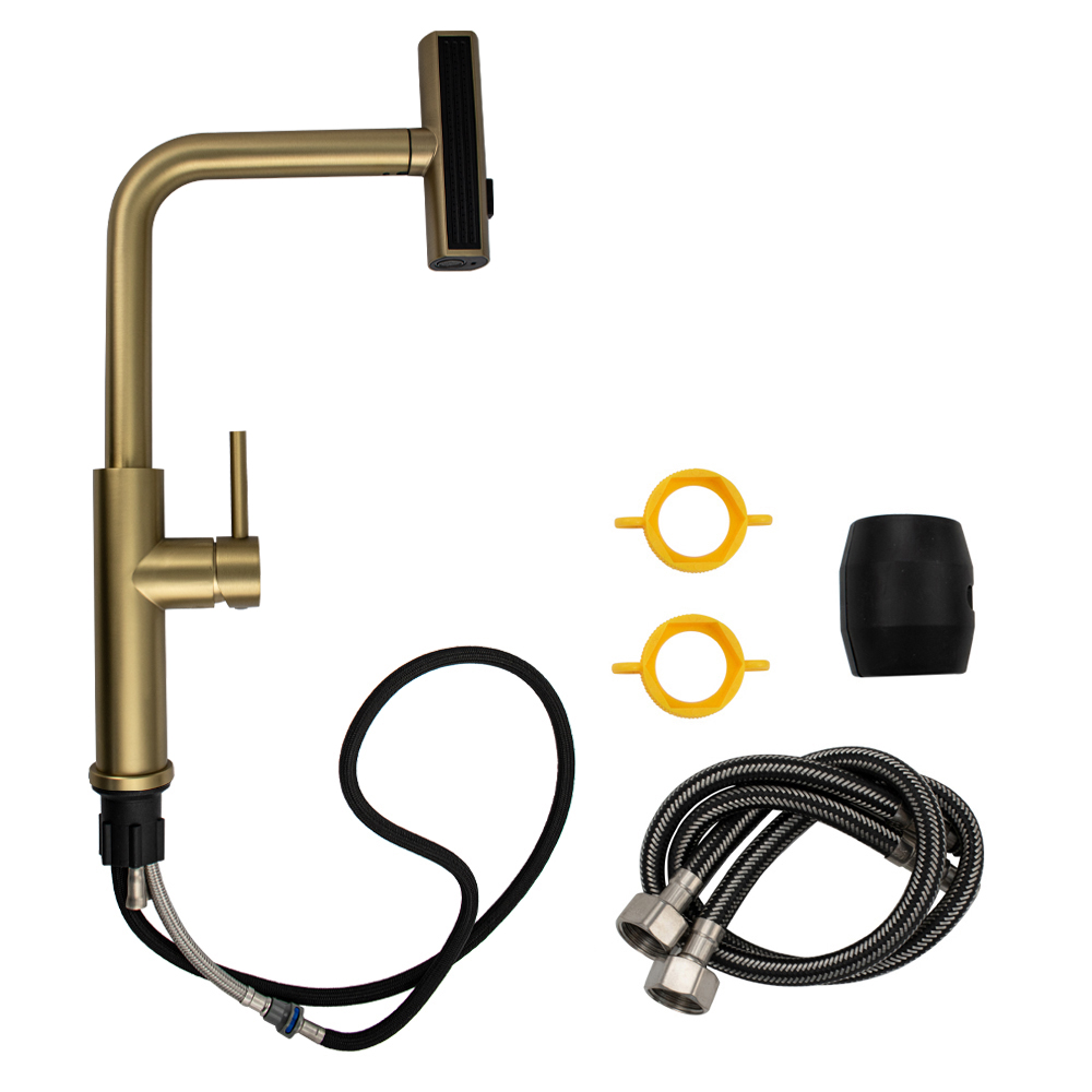 Смеситель для кухонной мойки и раковин, вытяжной излив - лейка с переключением режимов подачи воды, литой матовый корпус, из нержавеющей стали, цвет матовое золото, шаровый. Крепление резьба - гайка, картридж d = 35 мм, ручка литая. Аэратор для экономии воды. Такая модель может использоваться на домашней кухне, на даче, в медицинских учреждениях и общественных местах. Габаритные размеры: высота 450 мм, длина 230 мм, посадочное седло 45 мм, длина резьбы 50 мм. Вес - 1,85 кг, объём - 0,01 м3. В комплекте паспорт, корпус с изливом, подводка 1/2, крепеж, набор прокладок.