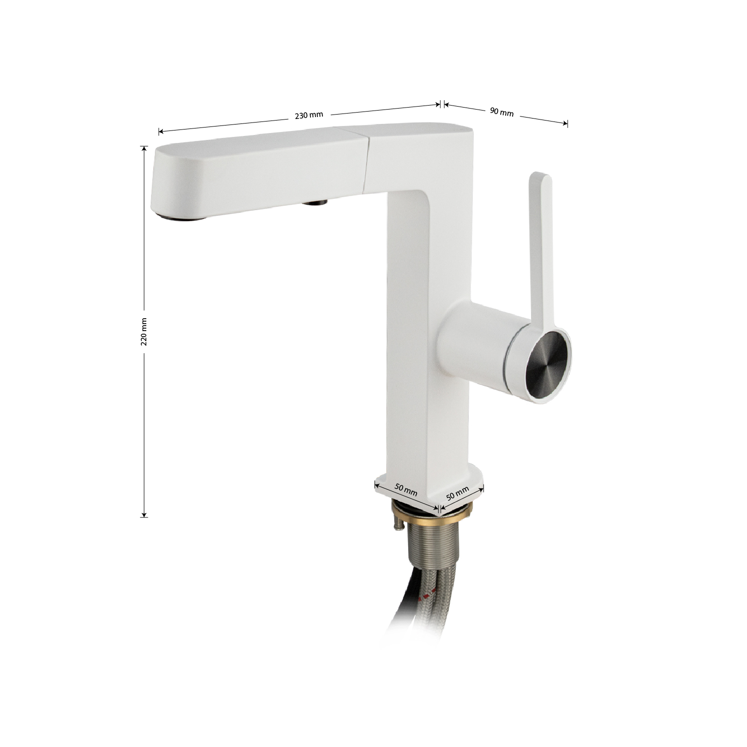Смеситель для кухонной мойки и раковин, вытяжной излив - лейка с переключением режимов подачи воды, литой корпус белого цвета, из латуни, шаровый. Крепление резьба - гайка, картридж d = 35 мм, ручка литая. Аэратор для экономии воды. Такая модель может использоваться на домашней кухне, на даче, в медицинских учреждениях и общественных местах. Габаритные размеры: высота 220 мм, длина 230 мм, посадочное седло 50*50 мм. Вес - 2,450 кг, объём - 0,01633 м3. В комплекте паспорт, корпус с изливом, подводка 1/2, крепеж, набор прокладок