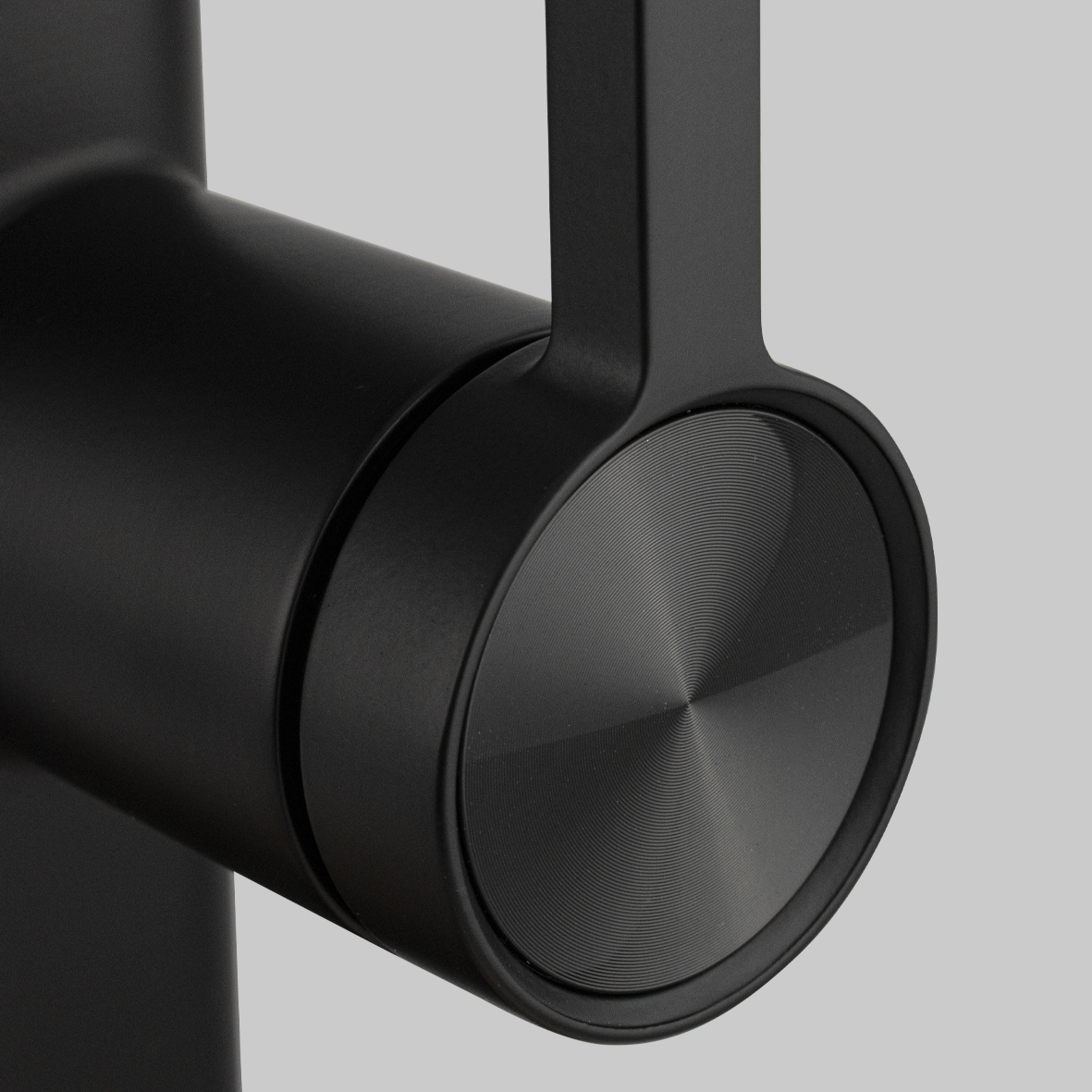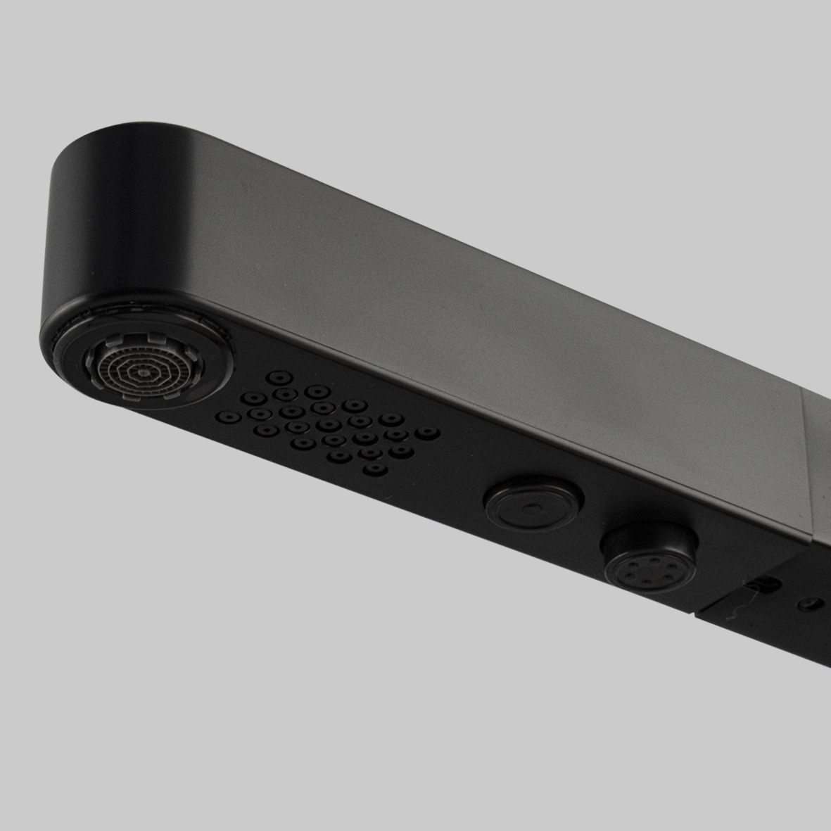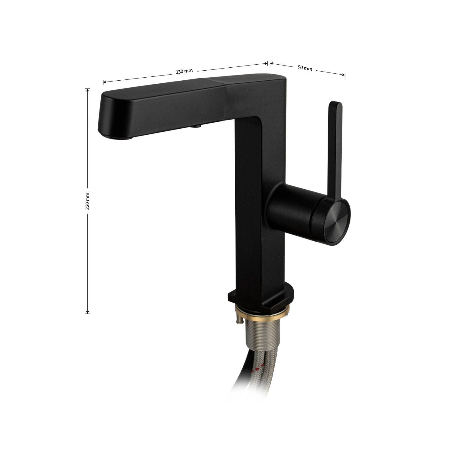 Смеситель для кухонной мойки и раковин, вытяжной излив - лейка с переключением режимов подачи воды, литой корпус черного цвета, из латуни, шаровый. Крепление резьба - гайка, картридж d = 35 мм, ручка литая. Аэратор для экономии воды. Такая модель может использоваться на домашней кухне, на даче, в медицинских учреждениях и общественных местах. Габаритные размеры: высота 220 мм, длина 230 мм, посадочное седло 50*50 мм. Вес - 2,450 кг, объём - 0,01633 м3. В комплекте паспорт, корпус с изливом, подводка 1/2, крепеж, набор прокладок.