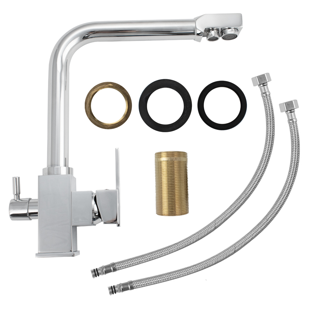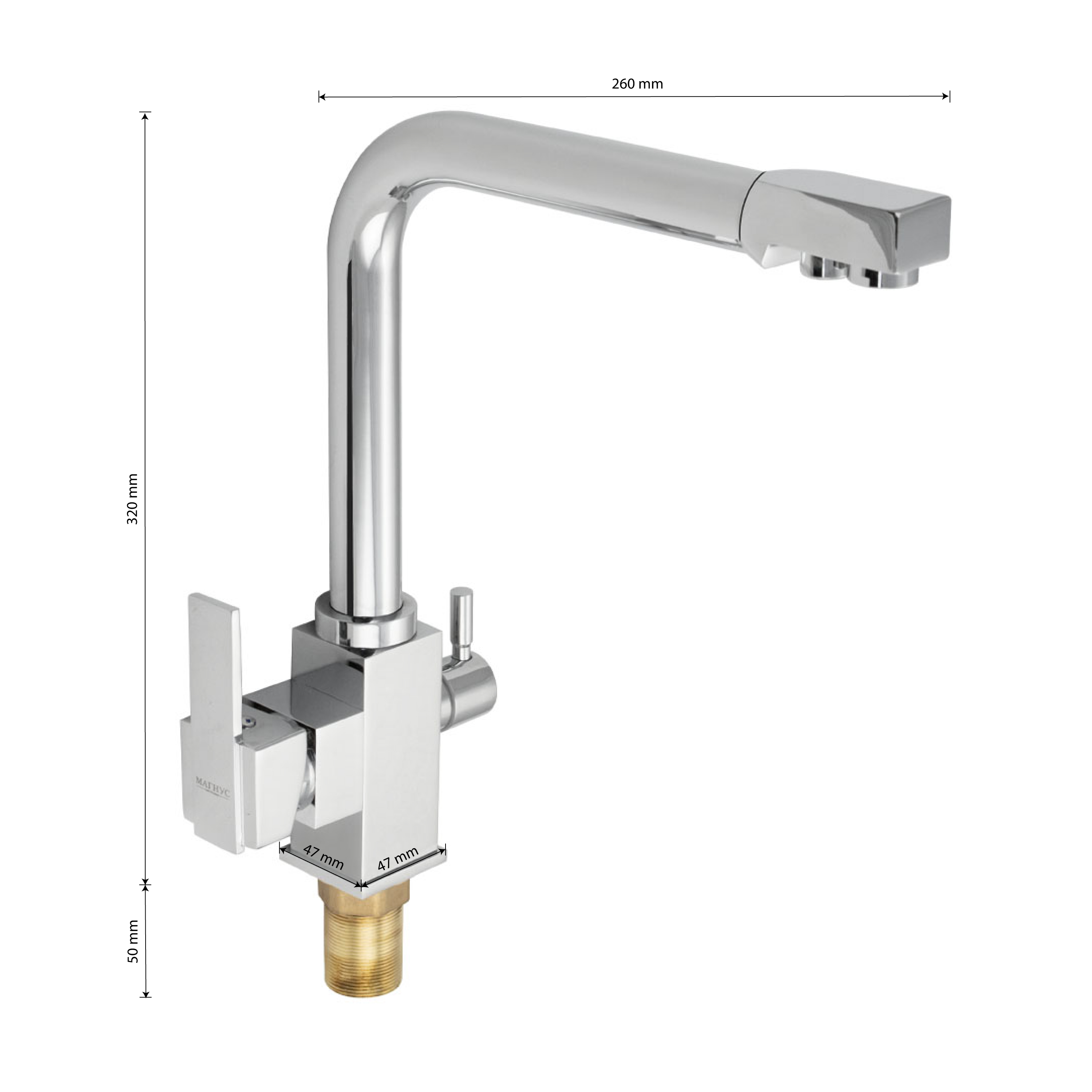 Смеситель для кухонной мойки и раковин, с двойным выпуском воды для фильтра, литой хромированный корпус, из латуни, с высоким Г-образным изливом, шаровый, с отдельным переключением от фильтра и проточной воды. Крепление резьба - гайка, картридж d = 40 мм, литая ручка. Аэратор для экономии воды. Такая модель может использоваться на домашней кухне, на даче, в медицинских учреждениях и общественных местах. Габаритные размеры: высота 320 мм, длина 260 мм, размер посадочного седла 47х47 мм, длина резьбы 50 мм, длина подводки 450 мм. Вес - 2,100 кг, объём - 0,00650 м3. В комплекте, корпус с изливом, подводка 1/2, крепеж, набор прокладок.