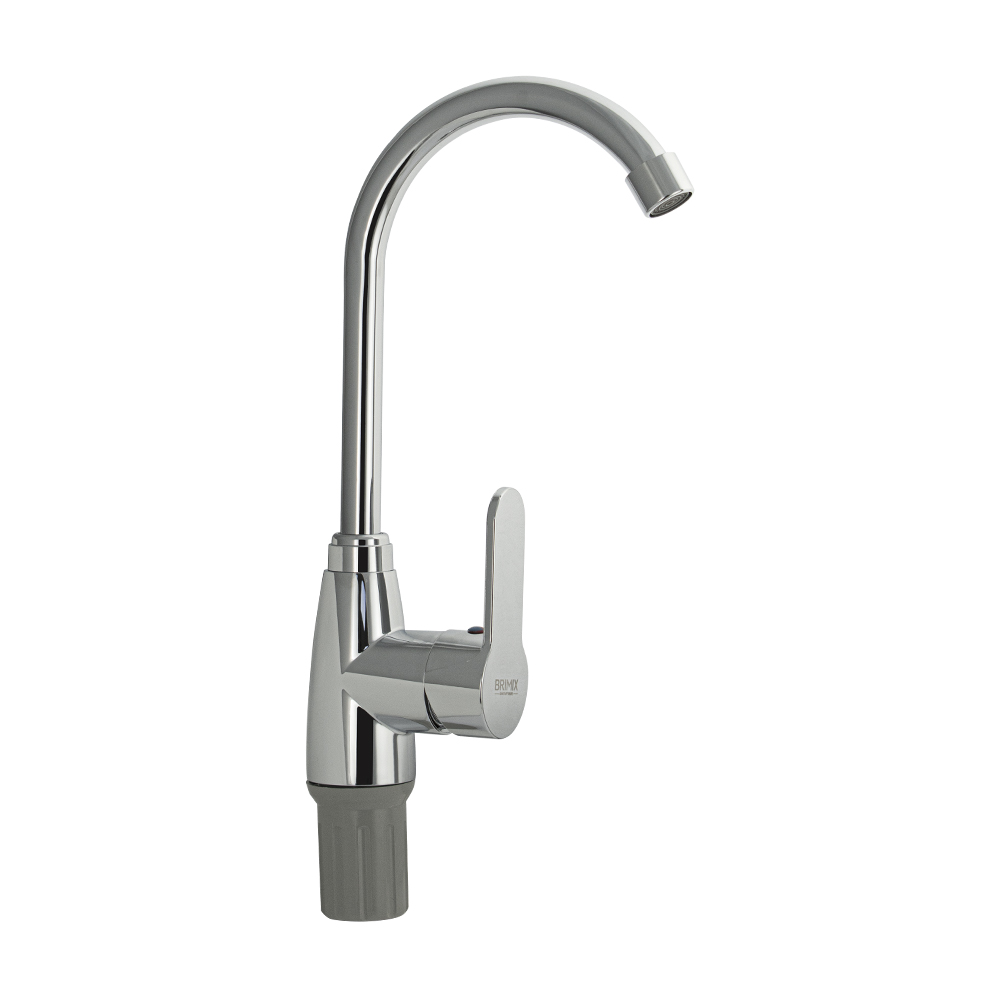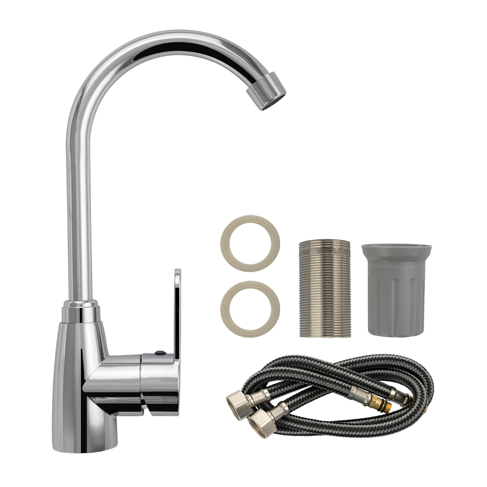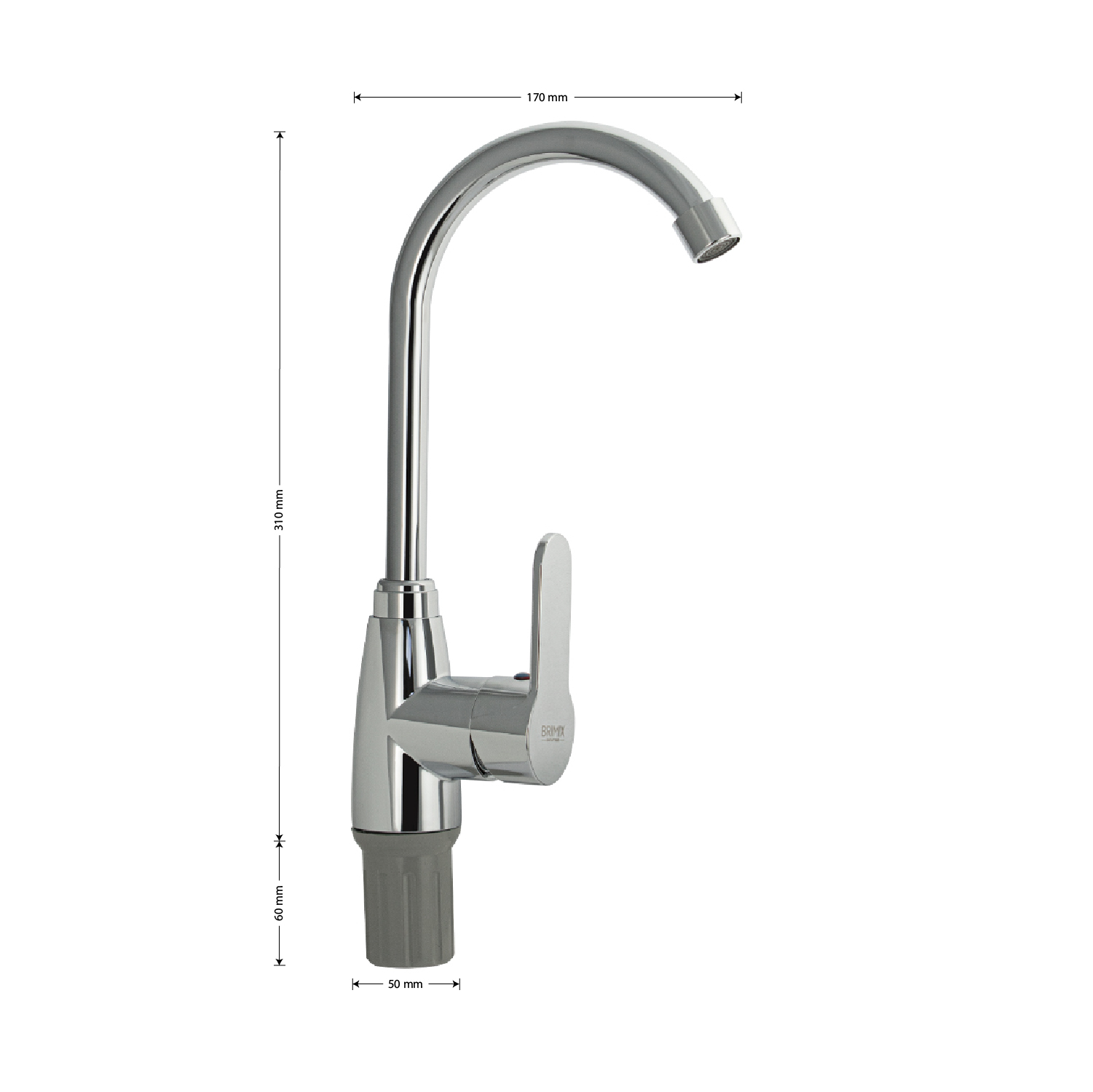 Смеситель для кухонной мойки и раковин, из высокопрочного пластика АБС, хромированный, боковой, с высоким С-образным изливом, шаровый. Крепление резьба - гайка, картридж d = мм, литая ручка. Хромированный аэратор для экономии воды. Габаритные размеры: высота 310 мм, длина 170 мм, диаметр посадочного седла 50 мм, длина резьбы 60 мм, длина подводки 450 мм. Вес - 0.53 кг, объём - 0.00385 м3. В комплекте паспорт, корпус с изливом, пластиковая подводка с латунными штуцерами 1/2, крепеж, набор прокладок.