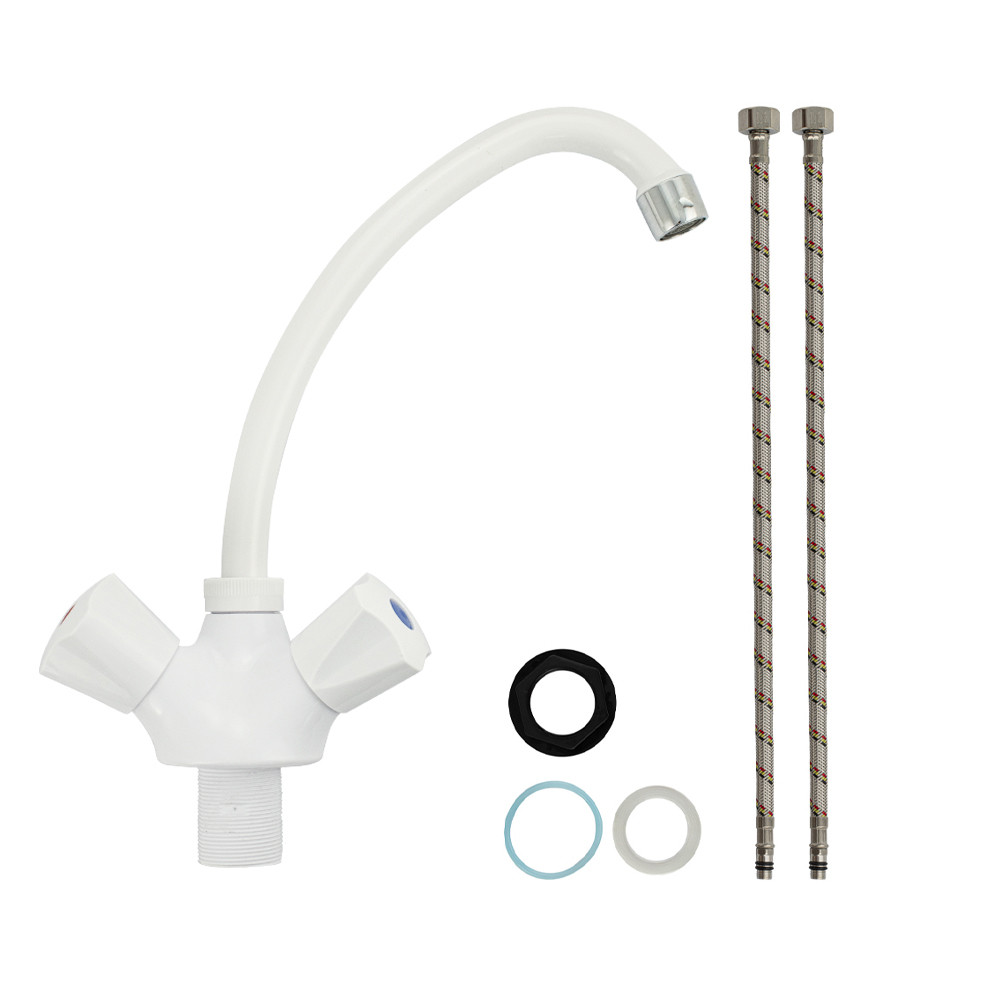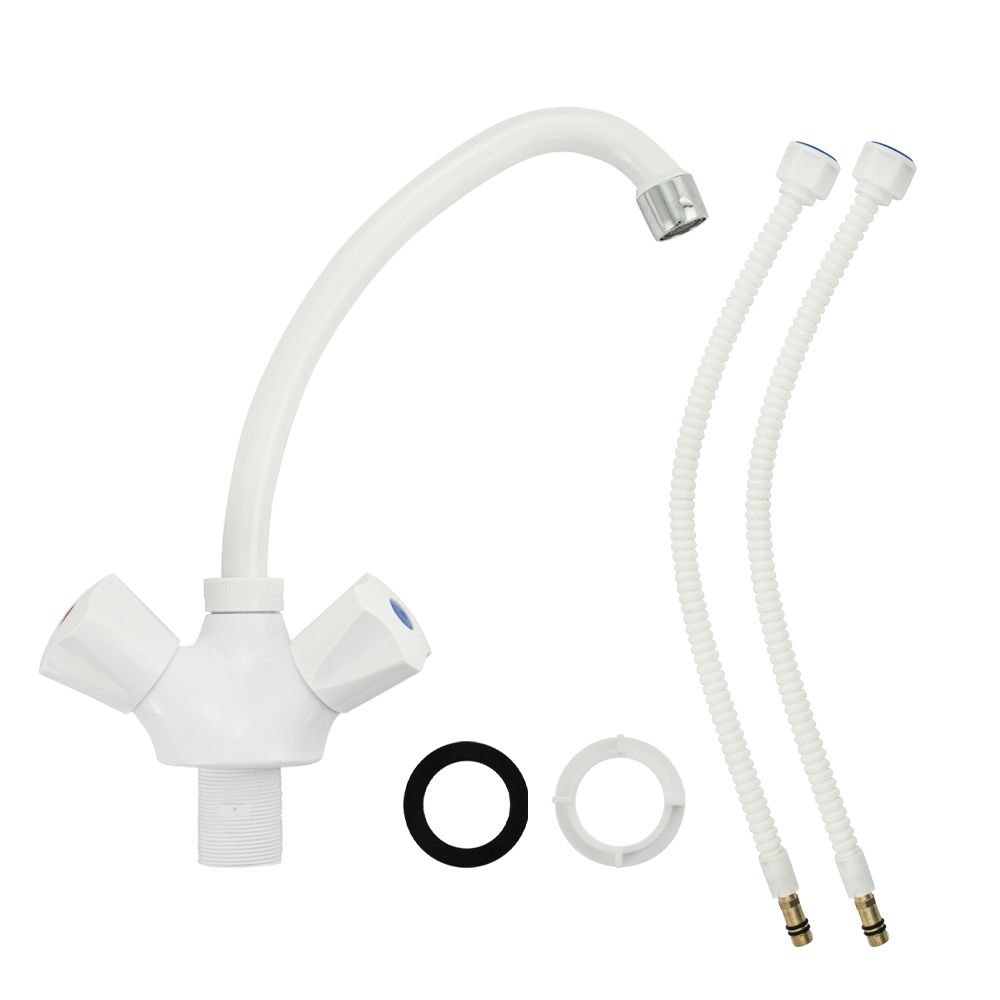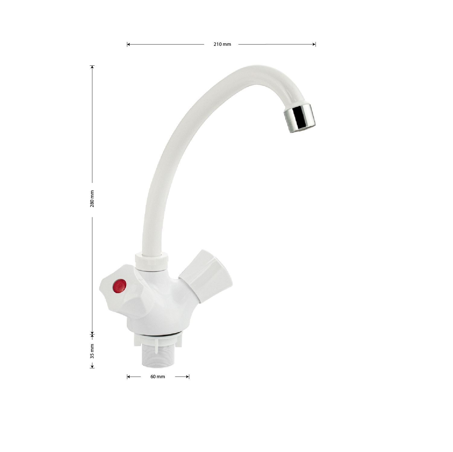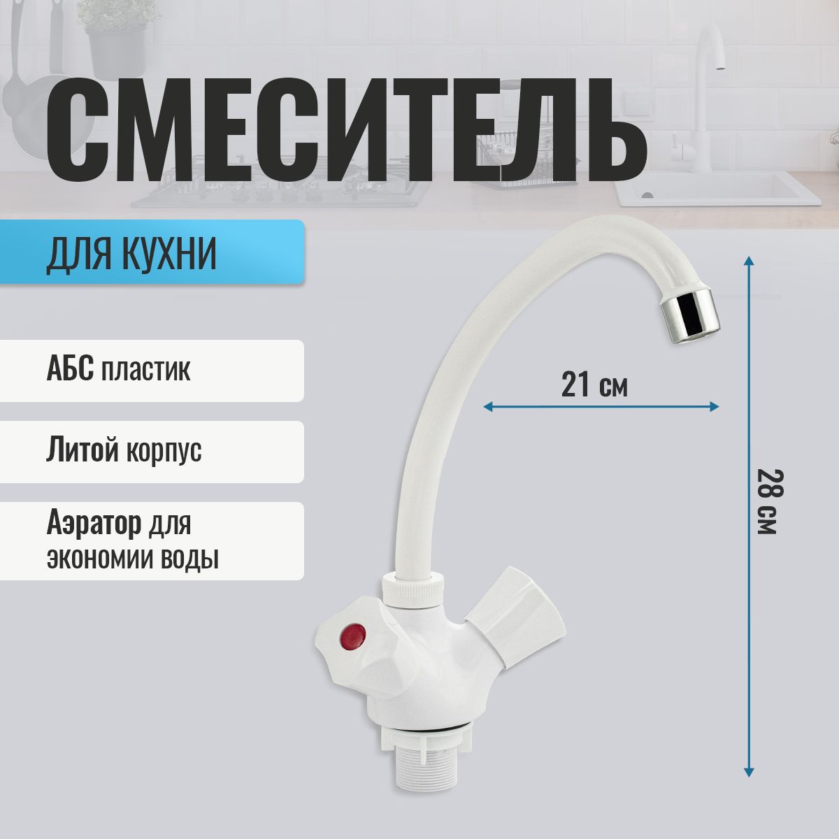 Смеситель из высокопрочного пластика АБС - белый, для кухонной мойки и раковин, с аэратором для экономии воды. Материал изготовления — пластик. Кранбуксы металлокерамика 1/2, ручки ромб поворот на 90˚, крепление резьба - гайка. Габаритные размеры: высота 280 мм, длина 210 мм, диаметр посадочного седла 60 мм, длина резьбы 35 мм, длина подводки 400 мм. Вес - 0,500 кг, объём - 0,00350 м3. В комплекте корпус с изливом, паспорт, подводка, крепёж. Габаритные размеры упаковки: ширина 260 мм, высота 76 мм, глубина 150 мм.
