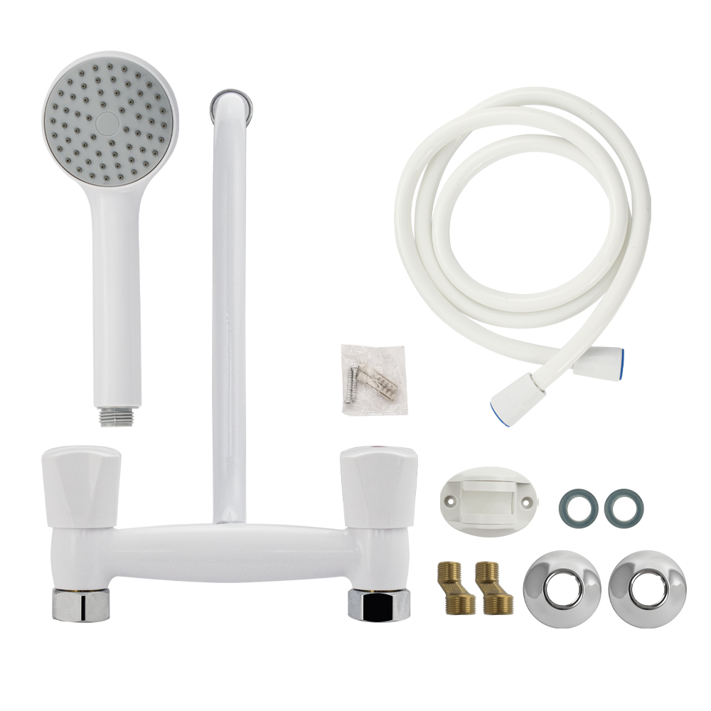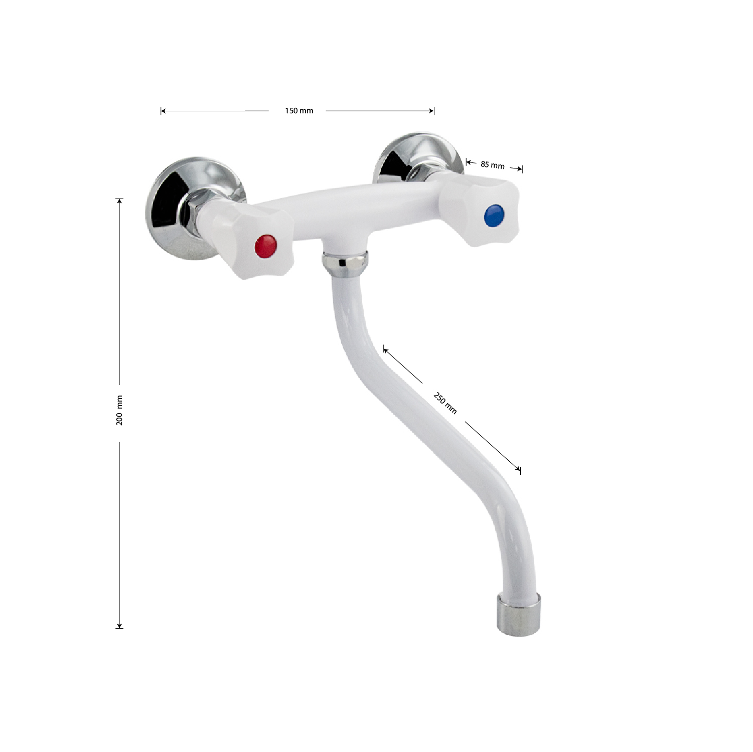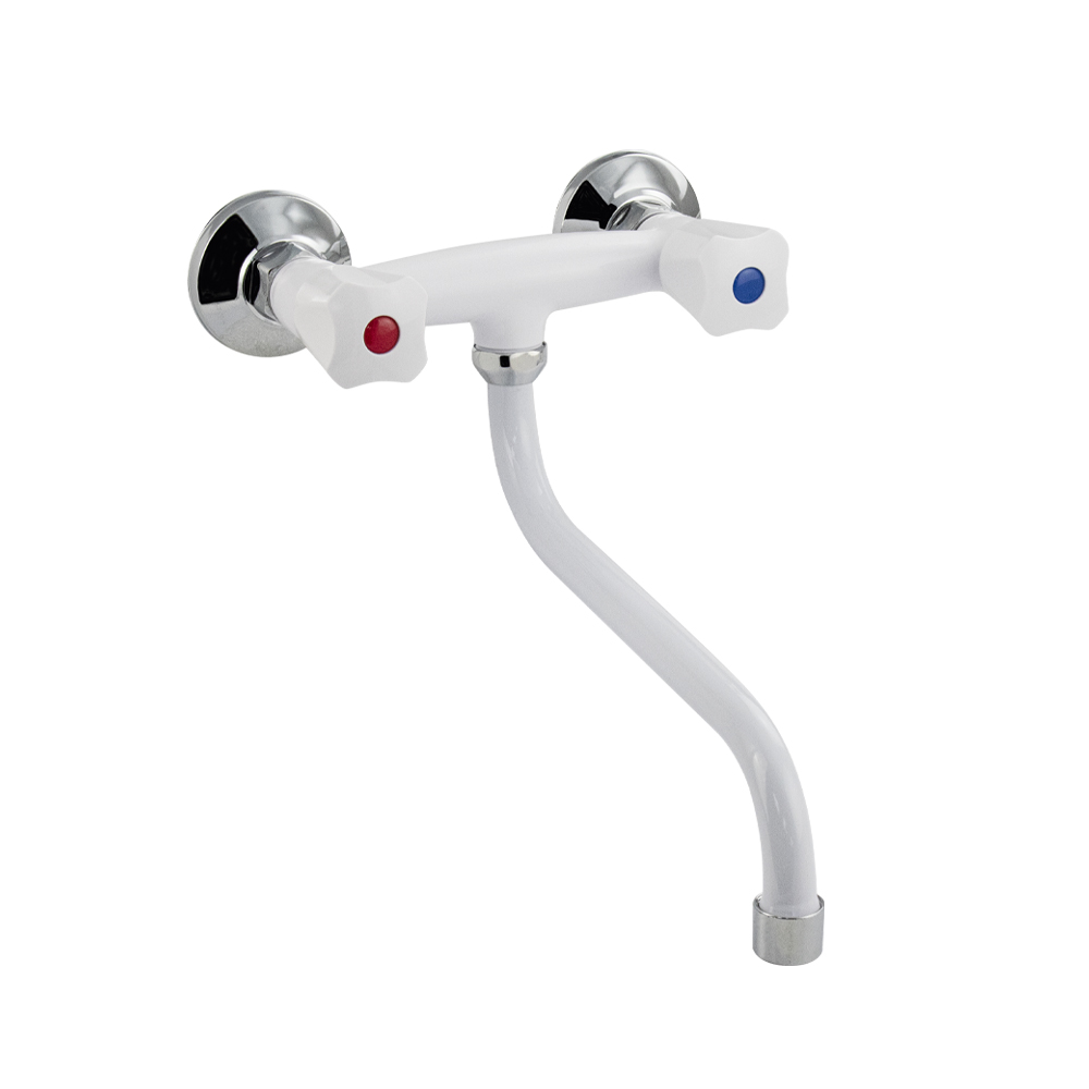 Смеситель из высокопрочного пластика АБС - от стены, для кухонной мойки и раковин, с аэратором для экономии воды. Материал изготовления — пластик. Кранбуксы металлокерамика 1/2, ручки ромб поворот на 90˚. Габаритные размеры: ширина 155 мм, высота 200 мм, длина излива 250 мм, диаметр чашки 65 мм. Вес - 0,600 кг, объём - 0,00300 м3. В комплекте корпус с изливом, паспорт, крепёж.