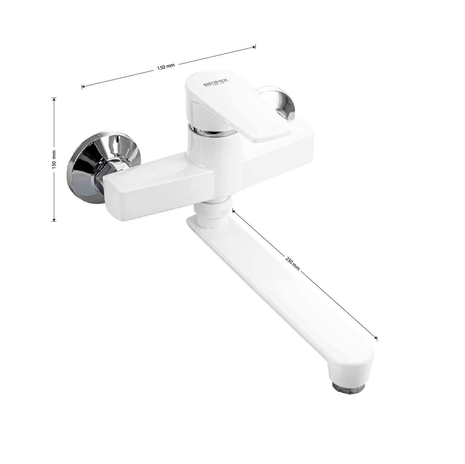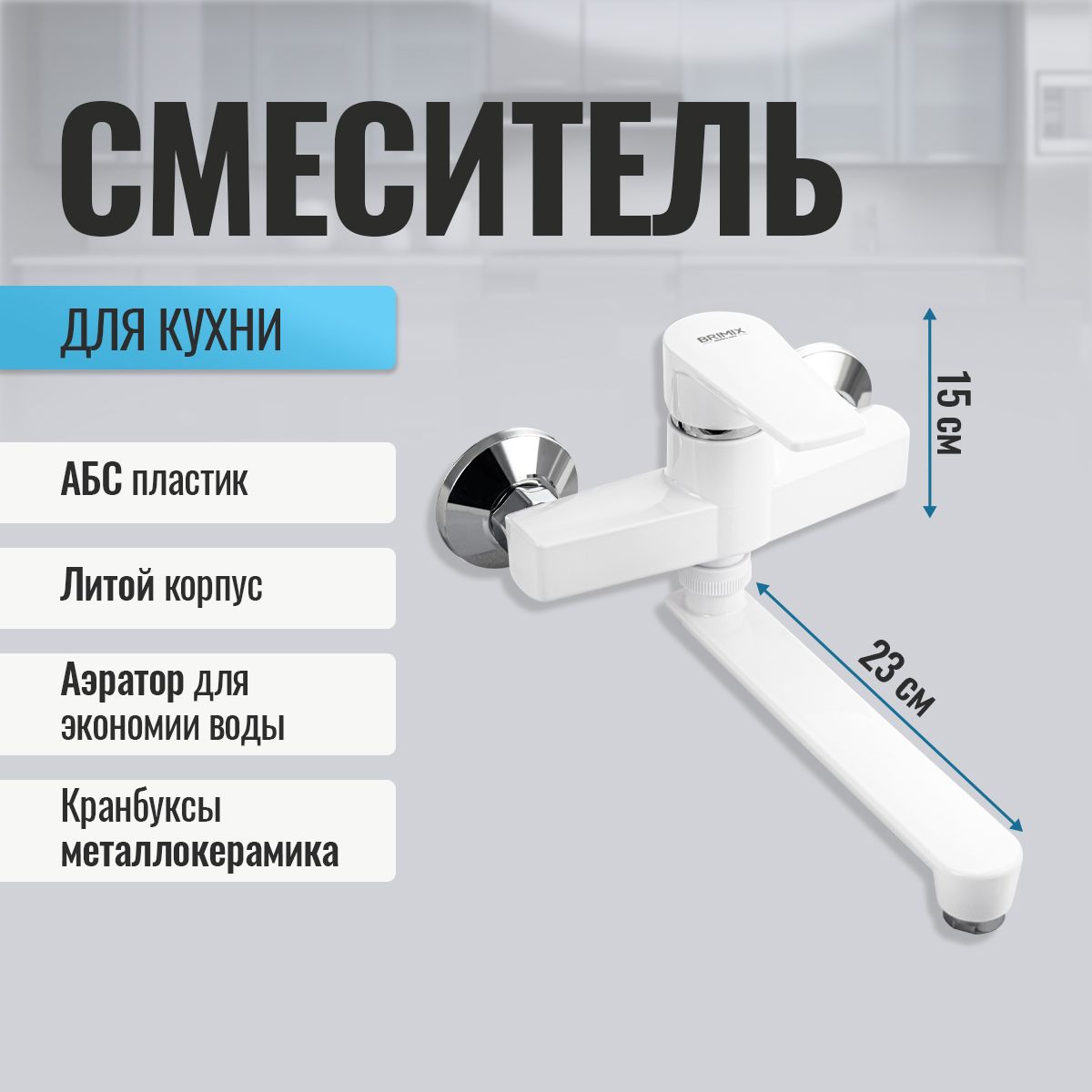 Смеситель из высокопрочного пластика АБС - от стены, шаровый для кухонной мойки и раковин с длинным, плоским изливом, с аэратором для экономии воды. Материал изготовления — пластик. Картридж d = 40 мм, литая ручка, хромированный, аэратор для экономии воды, хромированные чашки и эксцентрики.. Габаритные размеры: ширина 150 мм, высота 150 мм, длина излива 230 мм, диаметр чашки 65 мм. Вес - 0,75 кг, объём - 0,0035 м3. В комплекте корпус с изливом, паспорт, крепёж .