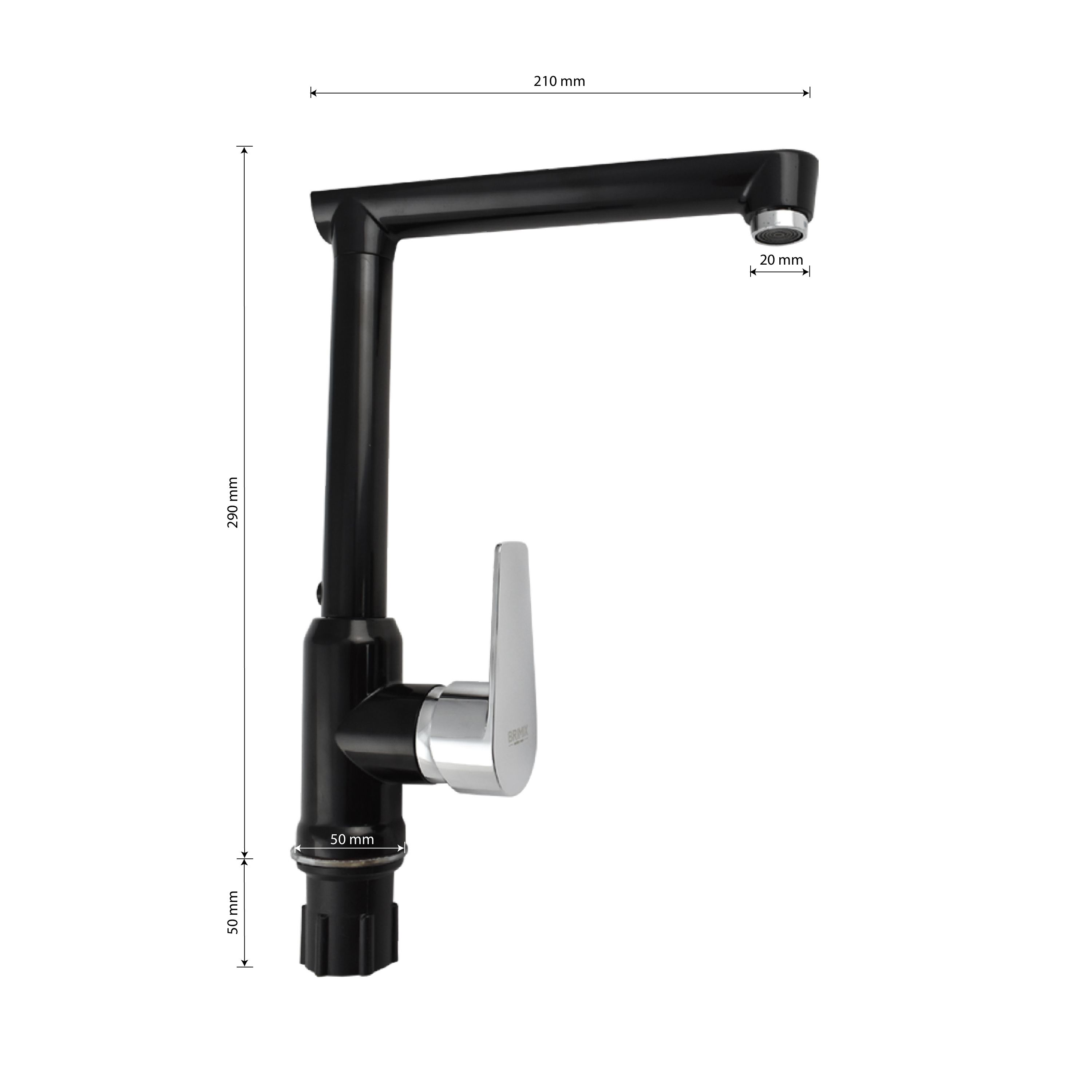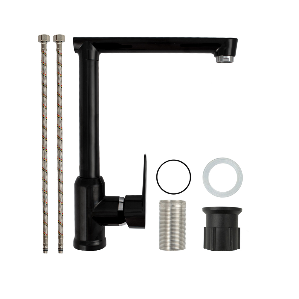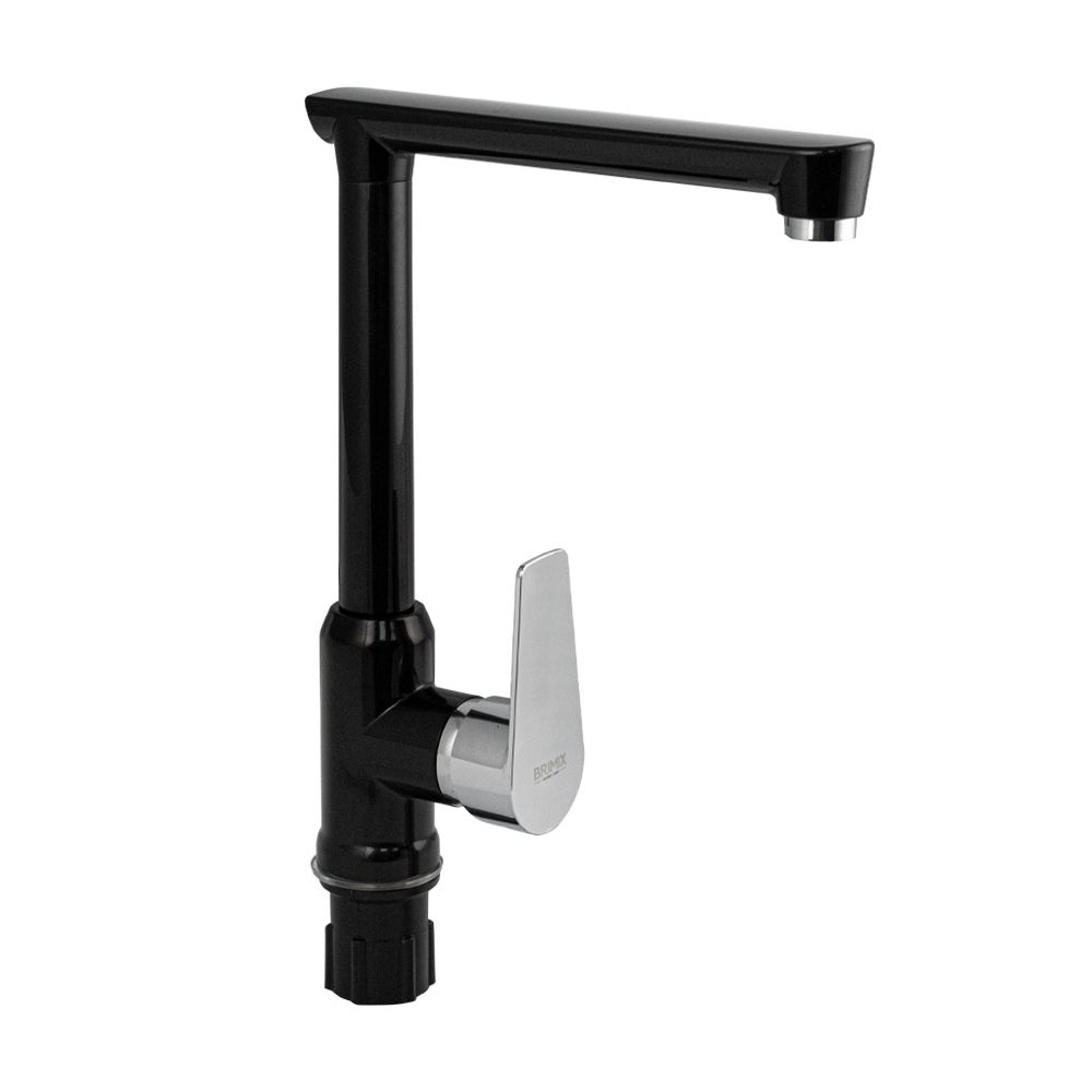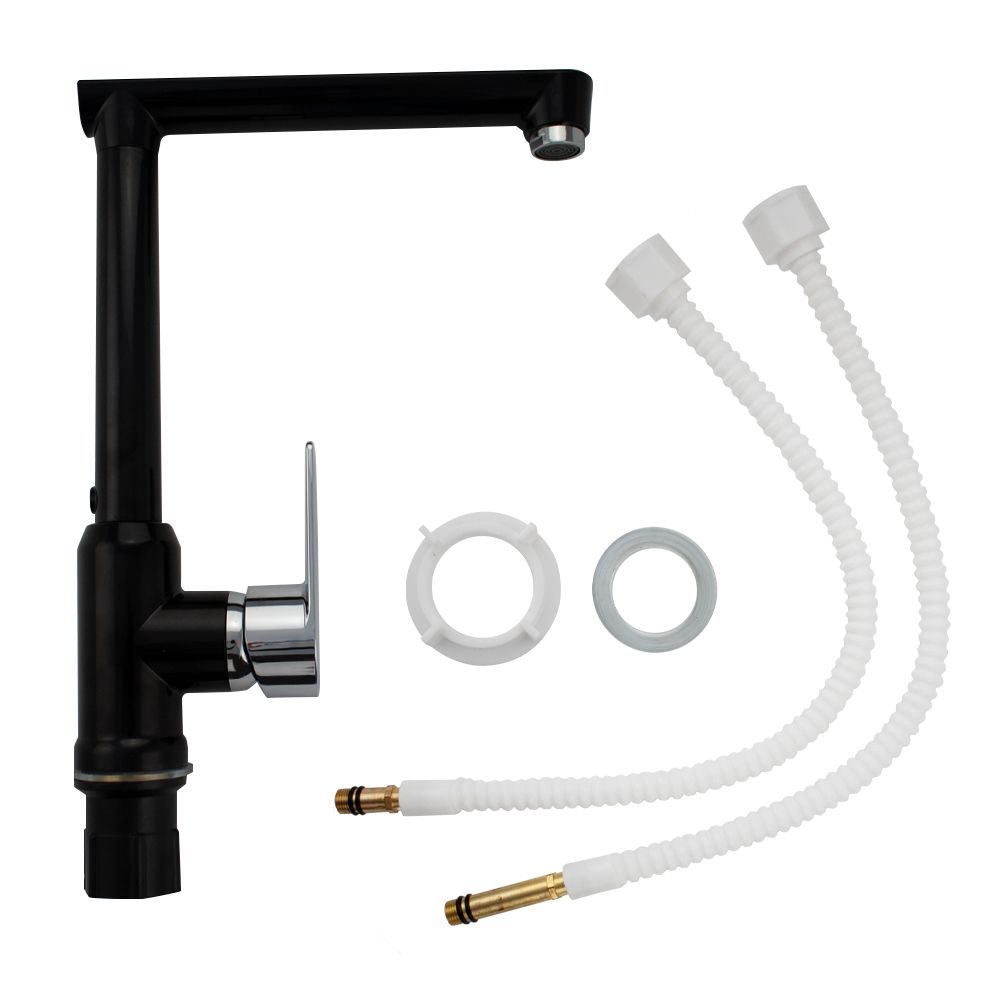 Смеситель для кухонной мойки и раковин, из высокопрочного пластика АБС, ЧЁРНЫЙ, боковой, с высоким Г-образным изливом, шаровый. Крепление резьба - гайка, картридж d = 40 мм, литая хромированная ручка. Хромированный аэратор для экономии воды. Габаритные размеры: высота 290 мм, длина 220 мм, диаметр посадочного седла 45 мм, длина резьбы 45 мм, длина подводки 450 мм. Вес - 0,730 кг, объём - 0,00550 м3. В комплекте паспорт, корпус с изливом, пластиковая подводка с латунными штуцерами 1/2, крепеж, набор прокладок.