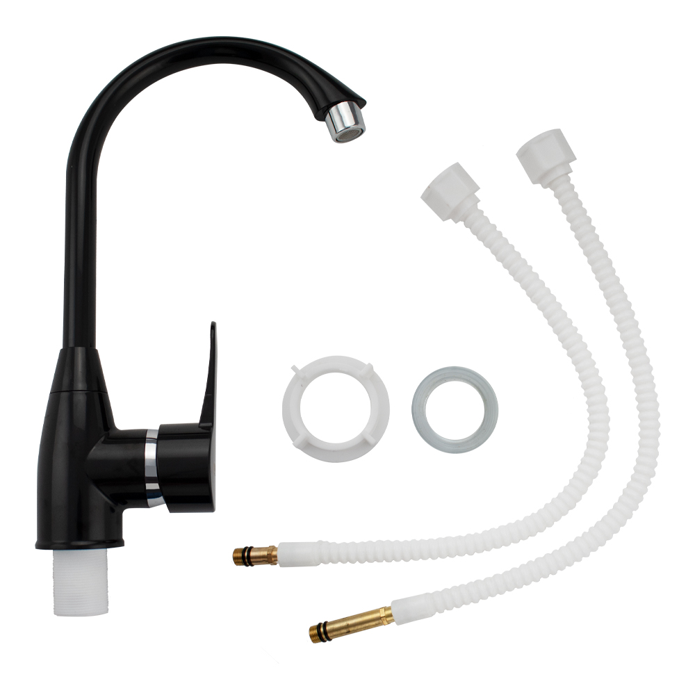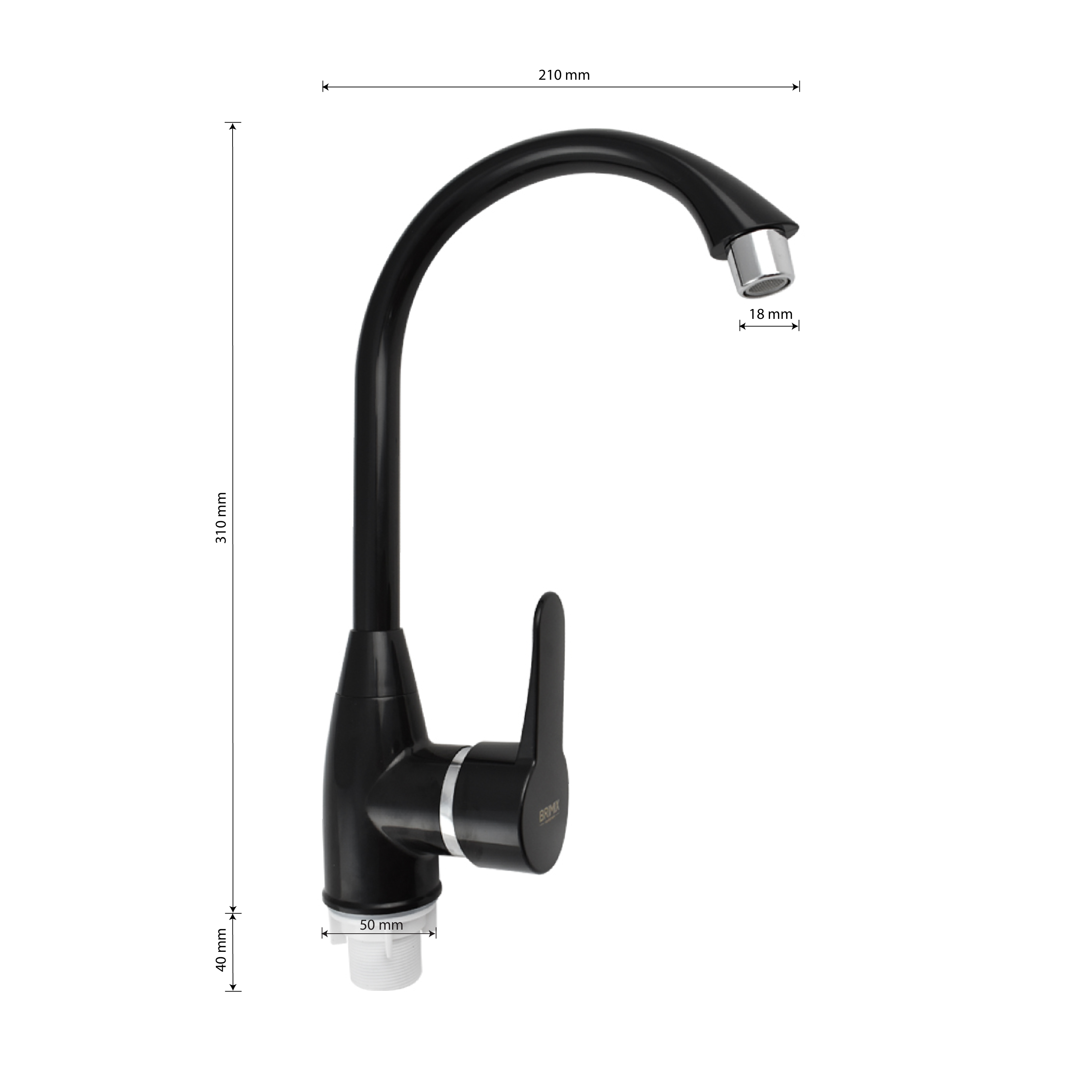 Смеситель для кухонной мойки и раковин, из высокопрочного пластика АБС, ЧЁРНЫЙ, боковой, с высоким С-образным изливом, шаровый. Крепление резьба - гайка, картридж d = 40 мм, литая ручка. Хромированный аэратор для экономии воды. Габаритные размеры: высота 310 мм, длина 210 мм, диаметр посадочного седла 50 мм, длина резьбы 40 мм, длина подводки 400 мм. Вес - 0,600 кг, объём - 0,00491 м3. В комплекте паспорт, корпус с изливом, пластиковая подводка с латунными штуцерами 1/2, крепеж, набор прокладок.