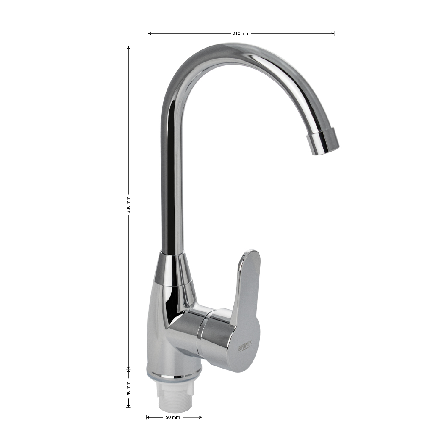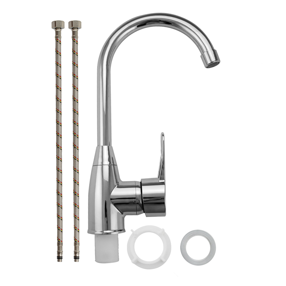Смеситель для кухонной мойки и раковин, из высокопрочного пластика АБС, хромированный, боковой, с высоким С-образным изливом, шаровый. Крепление резьба - гайка, картридж d = 40 мм, литая ручка. Хромированный аэратор для экономии воды. Габаритные размеры: высота 330 мм, длина 210 мм, диаметр посадочного седла 50 мм, длина резьбы 40 мм, длина подводки 400 мм. Вес - 0,600 кг, объём - 0,00491 м3. В комплекте паспорт, корпус с изливом, пластиковая подводка с латунными штуцерами 1/2, крепеж, набор прокладок.