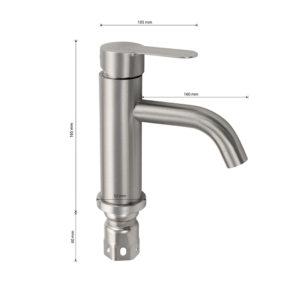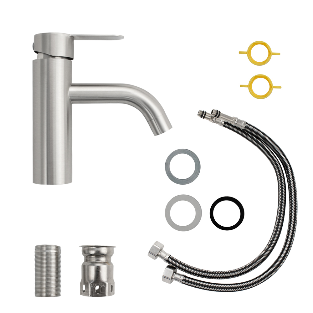 Смеситель для раковины, матовый литой корпус, из нержавеющей стали марки 304, с коротким литым изогнутым изливом, литая ручка, шаровый. Крепление резьба - гайка, картридж d = 35 мм. Аэратор для экономии воды. Такая модель может использоваться на домашней кухне, на даче, в медицинских учреждениях и общественных местах. Габаритные размеры: высота 165 мм, длина 160 мм, длина излива 55 мм, диаметр посадочного седла 52 мм, длина резьбы 60 мм, длина подводки 450 мм. Вес - 1,000 кг, объём - 0,0024 м3. В комплекте паспорт, корпус, подводка 1/2, крепеж, набор прокладок.
