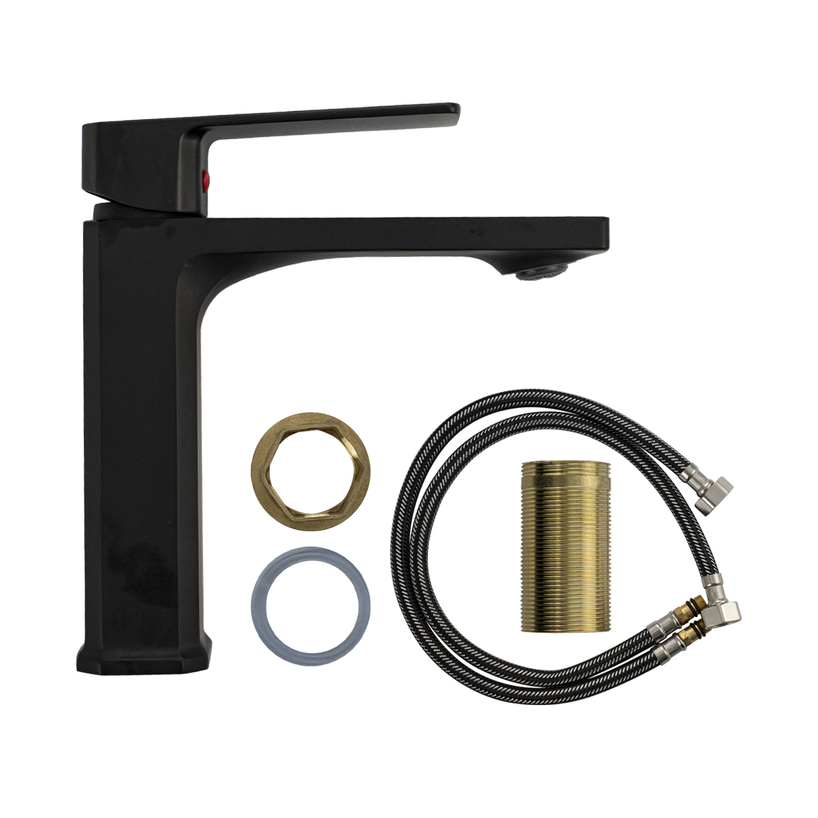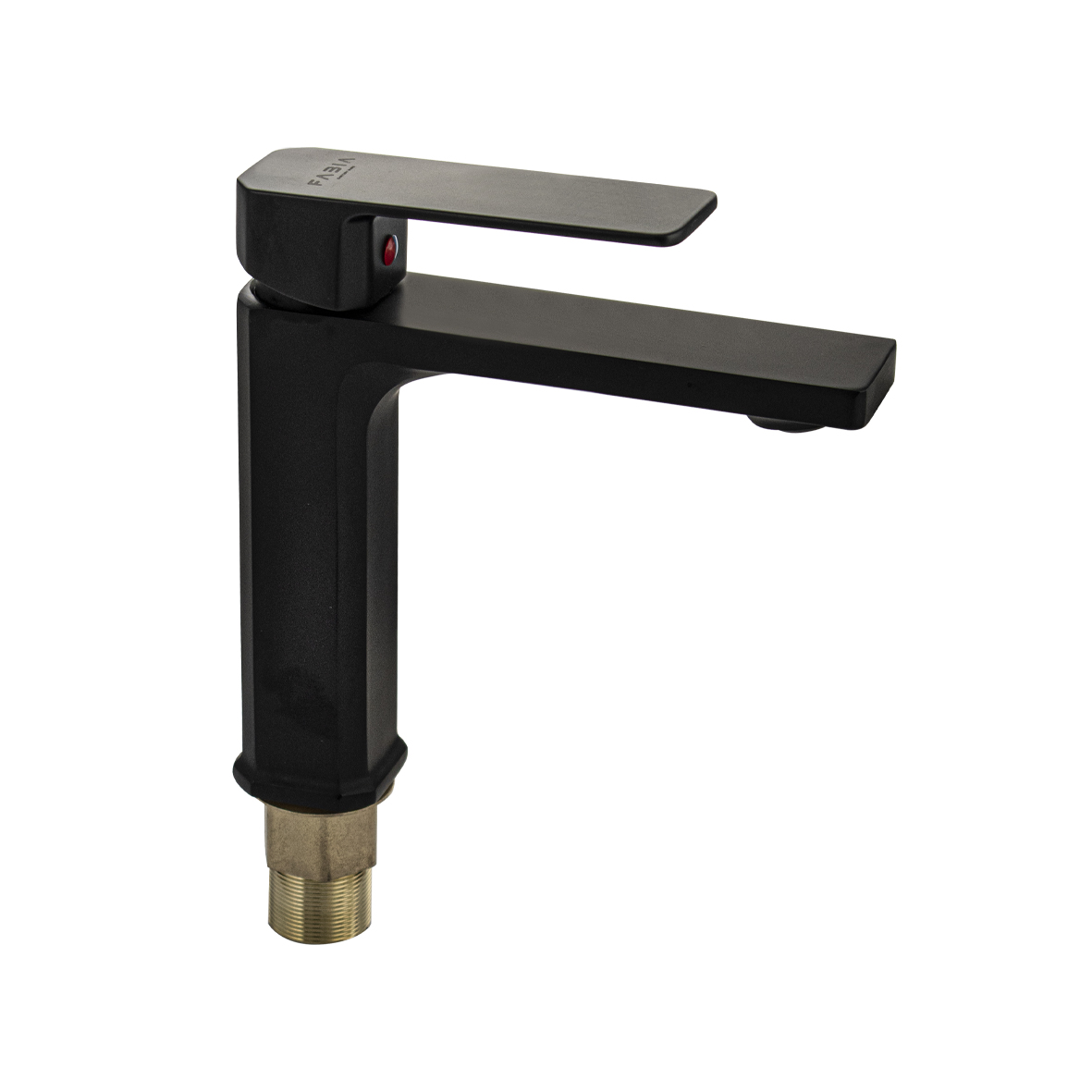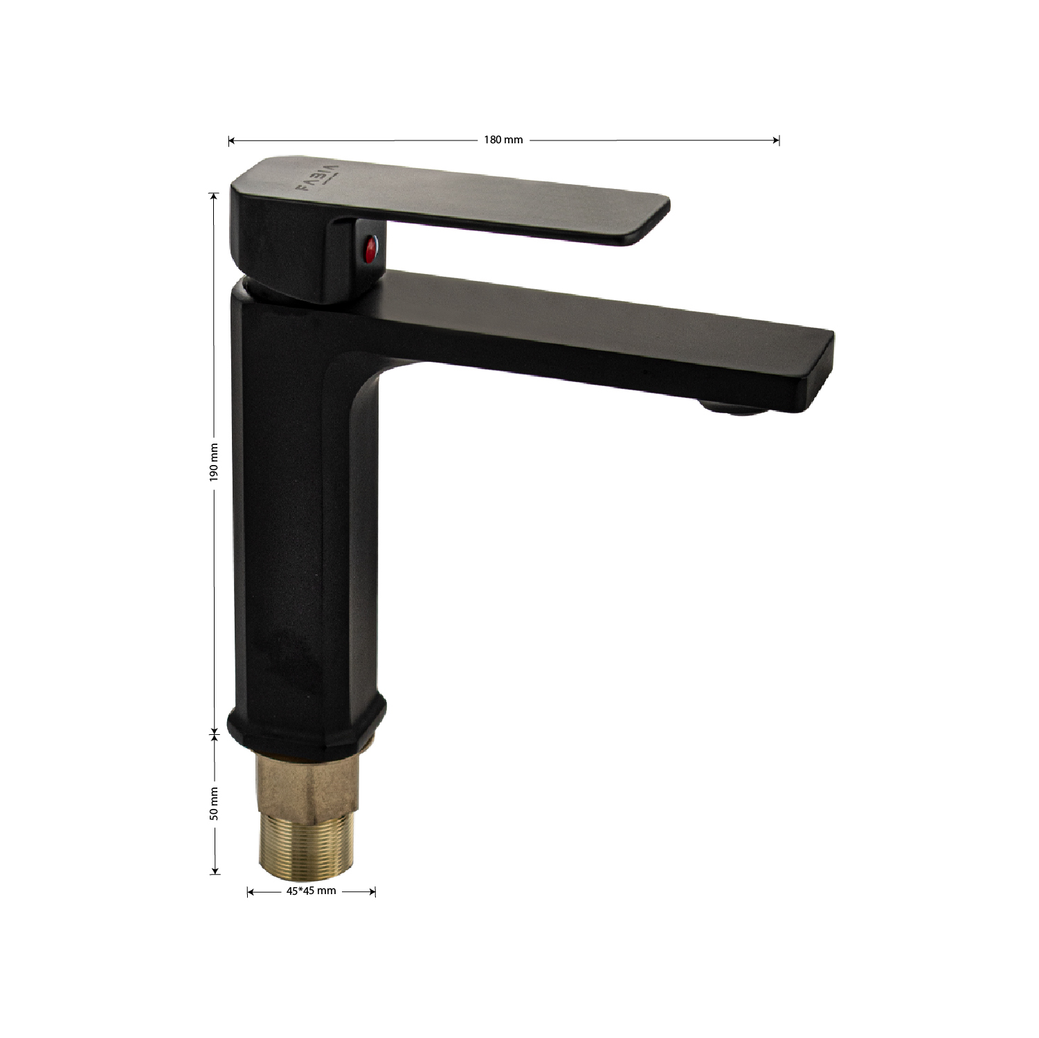 Смеситель для раковины, квадратный литой корпус, цвет черный, с прямым плоским изливом, ручка литая, шаровый. Крепление резьба - гайка, картридж d = 35 мм. Аэратор для экономии воды. Такая модель может использоваться на домашней кухне, на даче, в медицинских учреждениях и общественных местах. Габаритные размеры: высота 190 мм, длина 180 мм, посадочное седло 45 мм, длина резьбы 50 мм, длина подводки 500 мм. Вес - 1,45 кг, объём - 0,00307 м3. В комплекте паспорт, корпус, подводка 1/2, крепеж, набор прокладок.