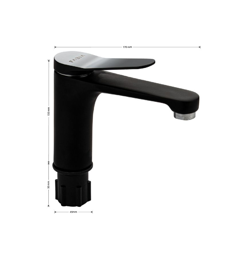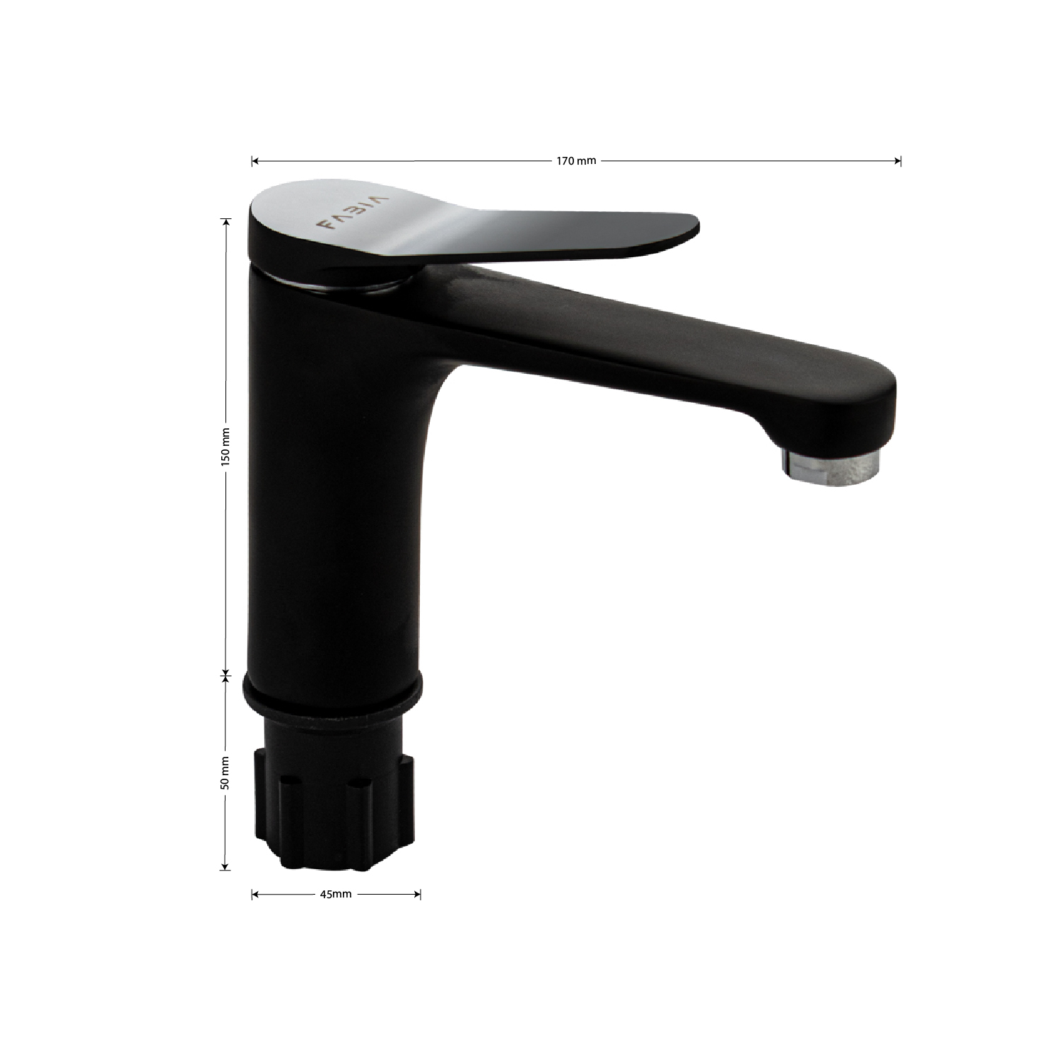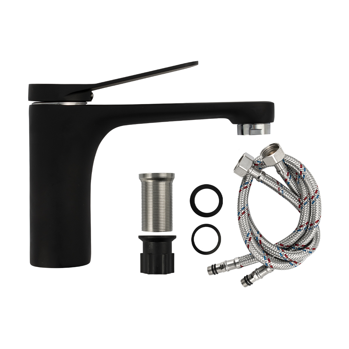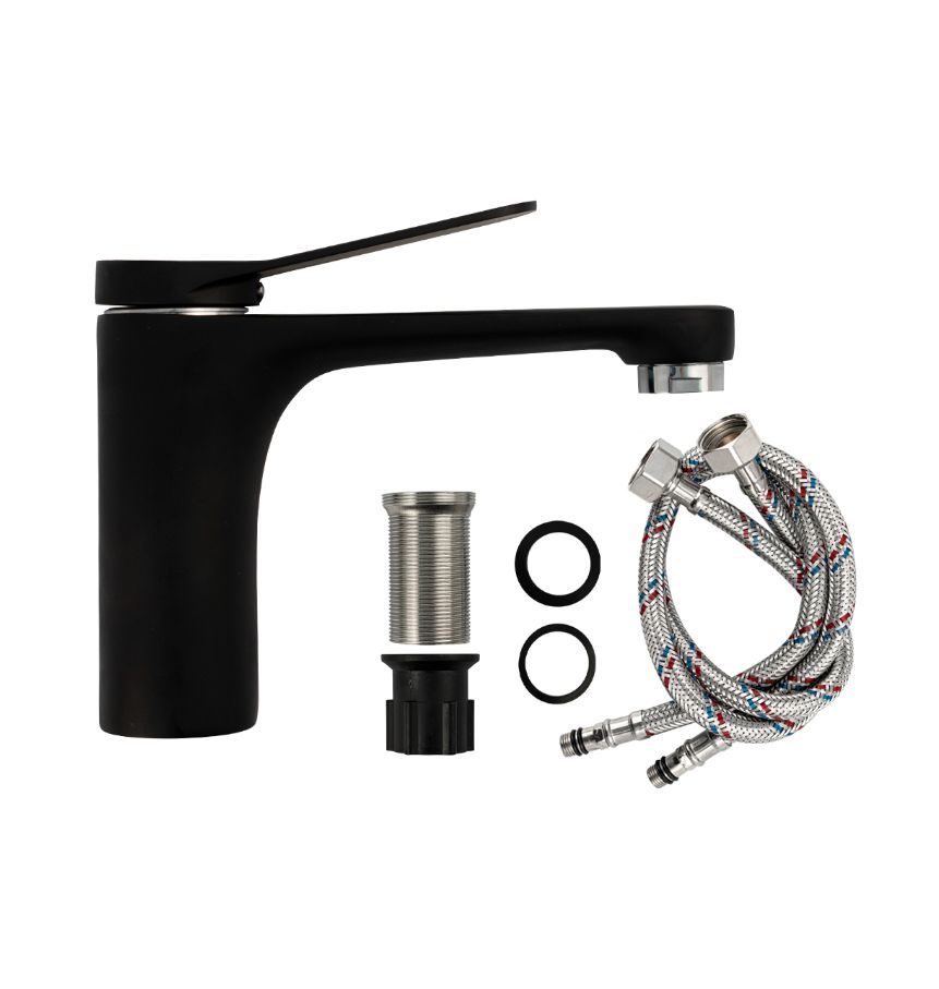 Смеситель для раковины, литой корпус, цвет хром с покрытием черная эмаль, с прямым плоским изливом, ручка литая, шаровый. Крепление резьба - гайка, картридж d = 35 мм. Аэратор для экономии воды. Такая модель может использоваться на домашней кухне, на даче, в медицинских учреждениях и общественных местах. Габаритные размеры: высота 150 мм, длина 170 мм, посадочное седло 45 мм, длина резьбы 50 мм, длина подводки 500 мм. Вес - 1.00 кг, объём - 0,00201 м3. В комплекте паспорт, корпус, подводка 1/2, крепеж, набор прокладок.