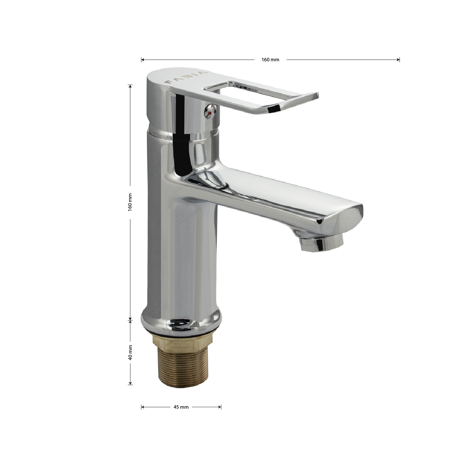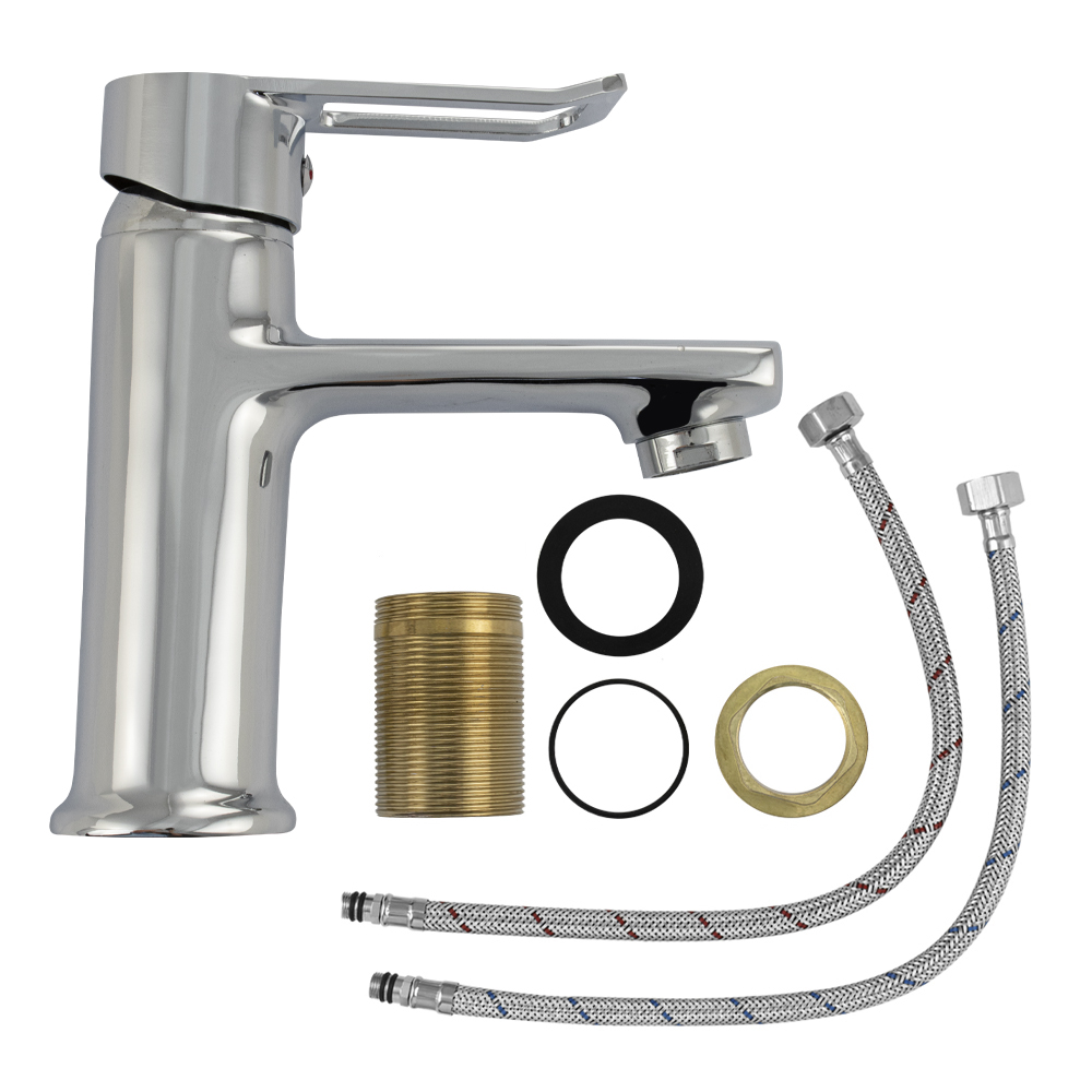 Смеситель для раковины, хромированный, с коротким изливом, литой корпус, плоская ручка с декоративным вырезом, шаровый. Материал изготовления — ЦАМ (цинк-алюминий-медь) + нержавеющая сталь. Крепление резьба - гайка, картридж d = 35 мм. Аэратор для экономии воды. Габаритные размеры: высота 160 мм, длина 160 мм, диаметр посадочного седла 45 мм, длина подводки 400 мм. Вес - 1,00 кг, объём - 0.0026 м3. В комплекте паспорт, корпус, подводка 1/2, крепеж, набор прокладок.