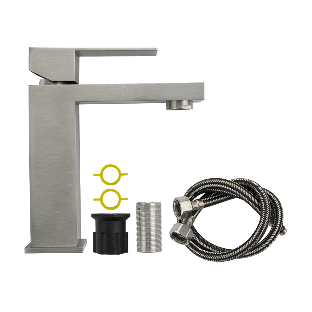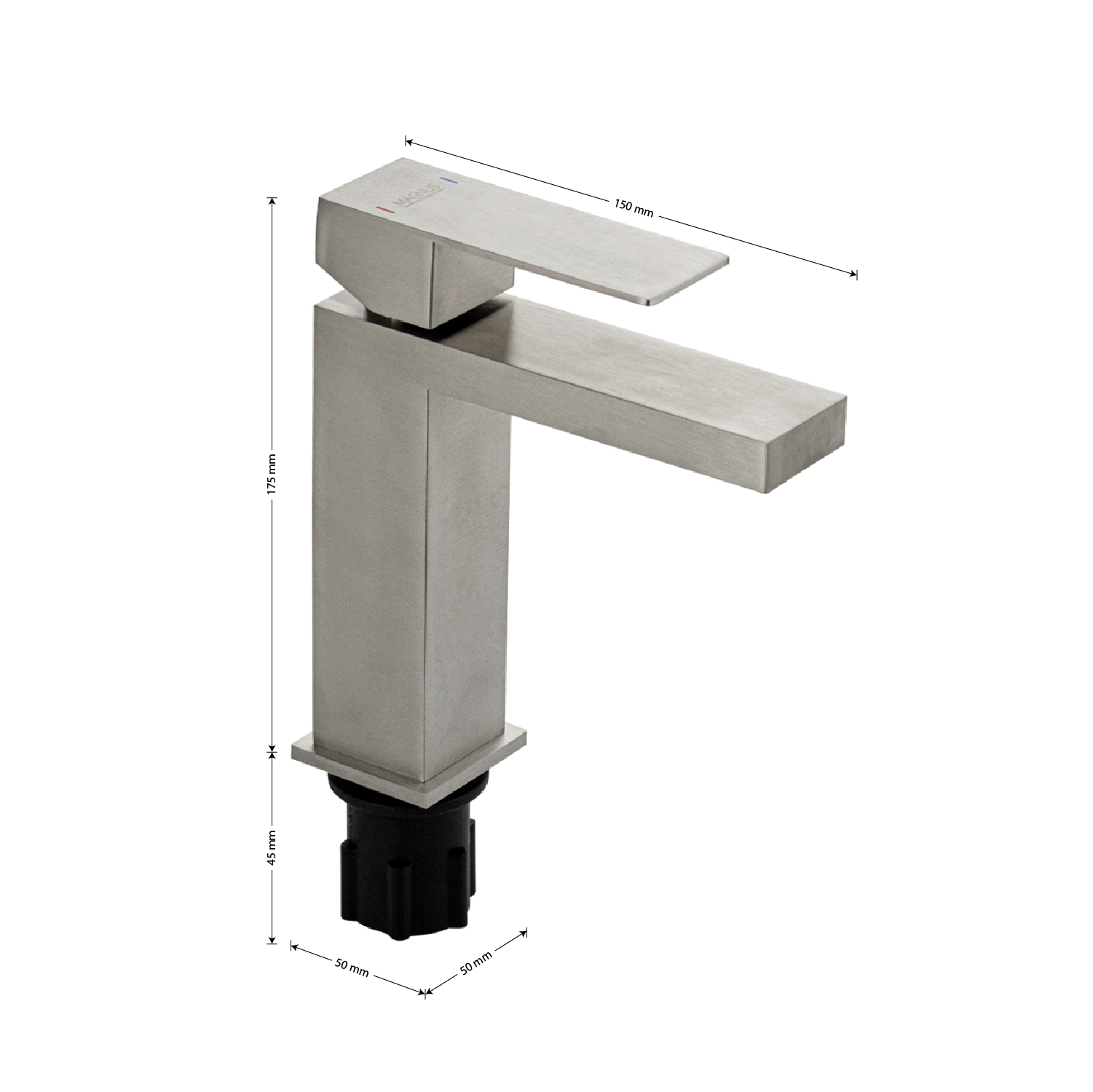 Смеситель для раковины, матовый квадратный корпус, из нержавеющей стали марки 304, с длинным изливом, литая ручка, шаровый. Крепление резьба - гайка, картридж d = 35 мм. Аэратор для экономии воды. Такая модель может использоваться на домашней кухне, на даче, в медицинских учреждениях и общественных местах. Габаритные размеры: высота 175 мм, длина 150 мм, посадочное седло 50*50 мм, длина резьбы 45 мм, длина подводки 450 мм. Вес - 1.05 кг, объём - 0.00247 м3. В комплекте паспорт, корпус, подводка 1/2, крепеж, набор прокладок.