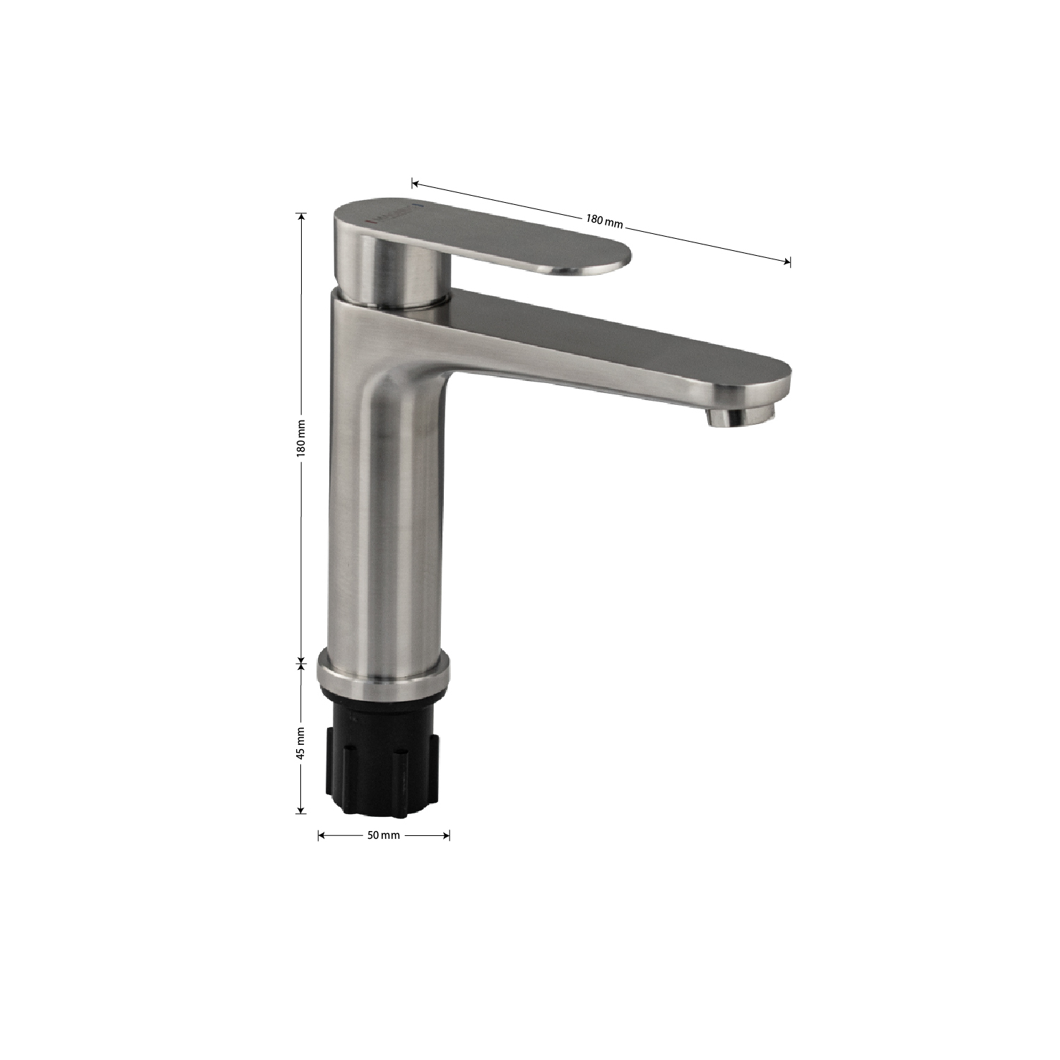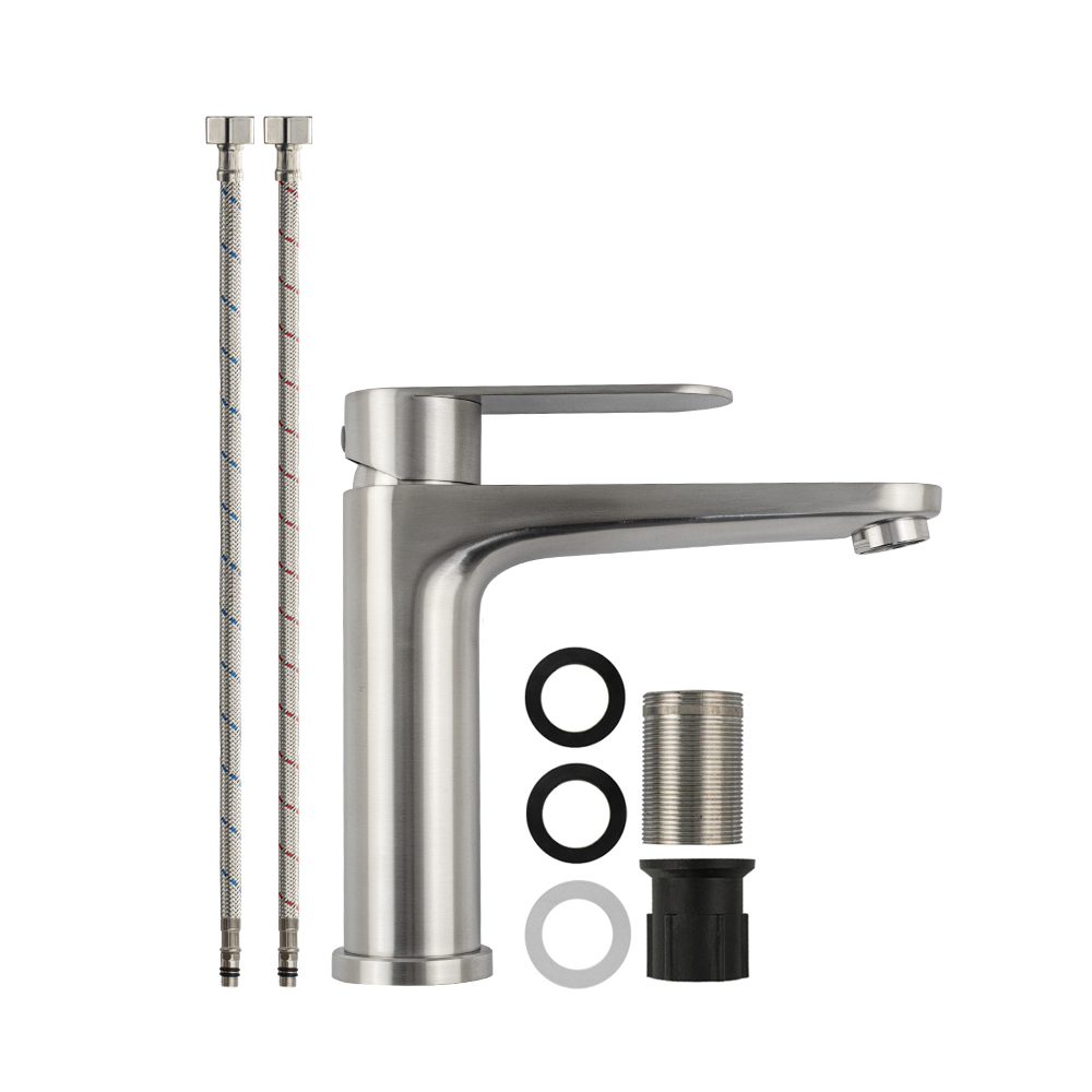 Смеситель для раковины, матовый литой корпус, из нержавеющей стали марки SUS 304, с коротким литым изливом, литая ручка, шаровый. Крепление резьба - гайка, картридж d =  мм. Аэратор для экономии воды. Такая модель может использоваться на домашней кухне, на даче, в медицинских учреждениях и общественных местах. Габаритные размеры: высота 190 мм, длина 180 мм, диаметр посадочного седла 50 мм, длина резьбы 50 мм, длина подводки 500 мм. Вес -  кг, объём -  м3. В комплекте паспорт, корпус, подводка 1/2, крепеж, набор прокладок.