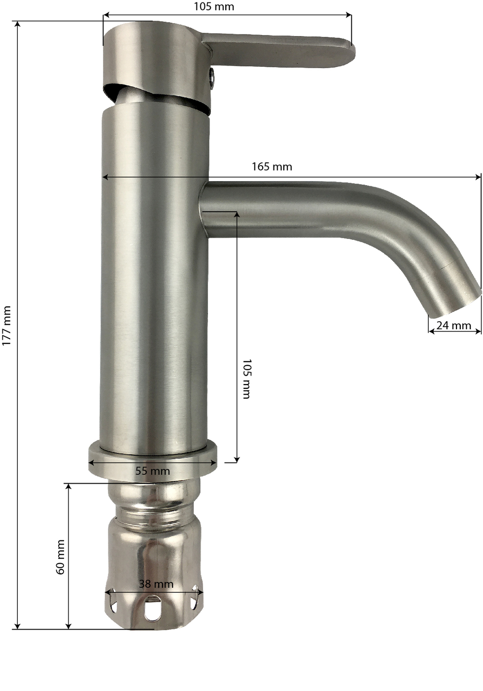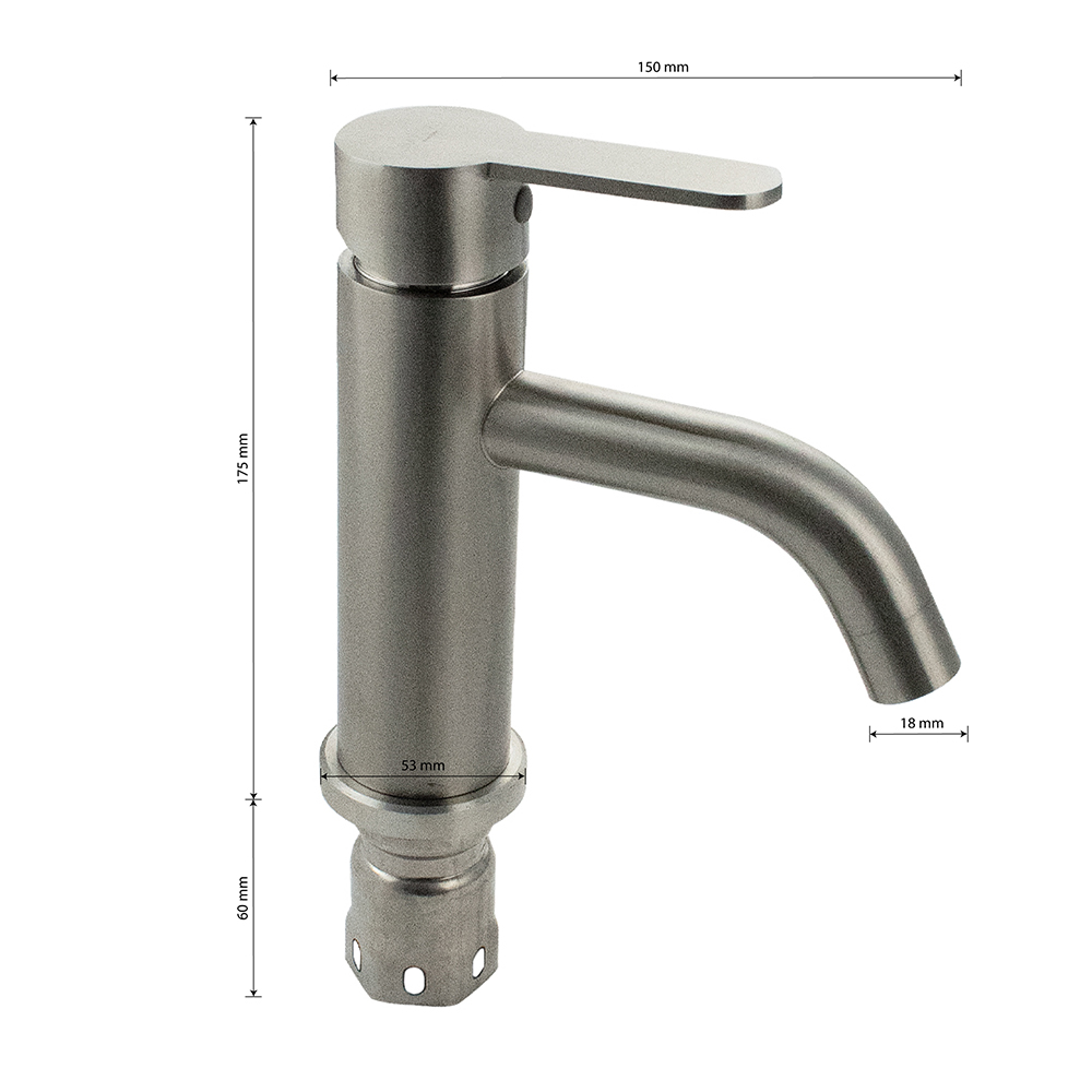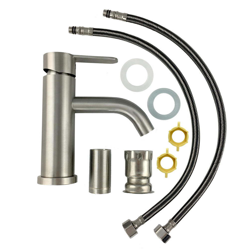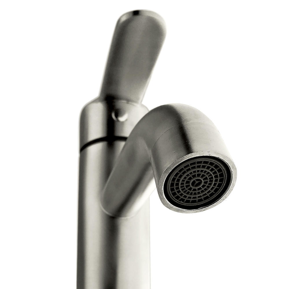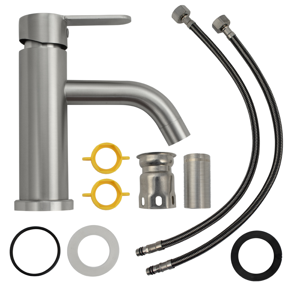 Смеситель для раковины, матовый литой корпус, из нержавеющей стали марки SUS 304, с коротким литым изогнутым изливом, литая ручка, шаровый. Крепление резьба - гайка, картридж d = 35 мм. Аэратор для экономии воды. Такая модель может использоваться на домашней кухне, на даче, в медицинских учреждениях и общественных местах. Габаритные размеры: высота 175 мм, длина 150 мм, длина излива 110 мм, диаметр посадочного седла 53 мм, длина резьбы 60 мм, длина подводки 450 мм. Вес - 1,000 кг, объём - 0,00308 м3. В комплекте паспорт, корпус, подводка 1/2, крепеж, набор прокладок.